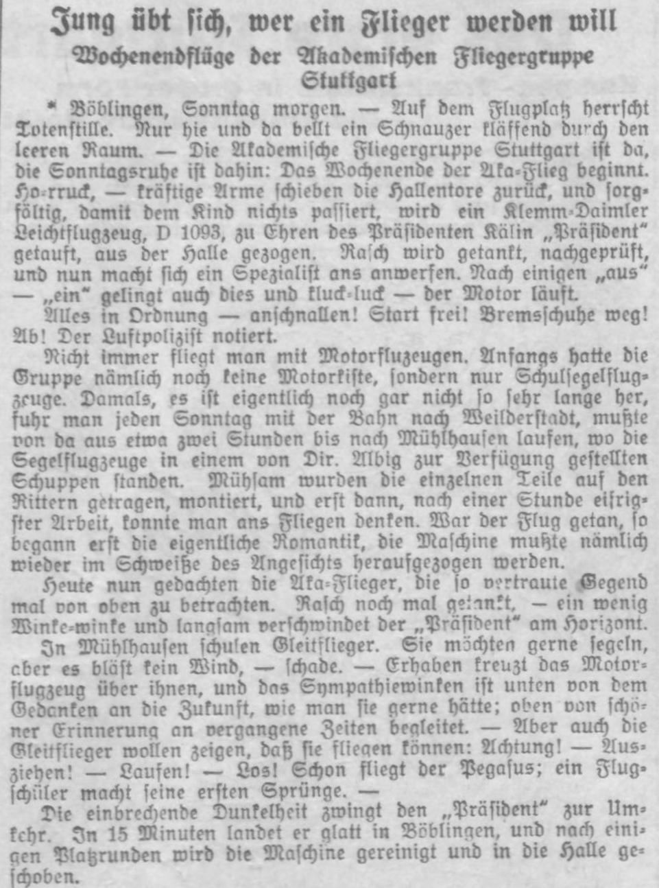 Es wurde dann die Stuttgarter Sportleitung durch die Luftverkehr Württ. A.G. erweitert, die die Platzvorbereitung in Böblingen und die Kosten für die Organisation übernahm. Die Oberleitung für die gesamte Organisation hatte Herr Major a.D. Palmer, Leiter des Böblinger Flugplatzes und der Sportflug G.m.b.H., übernommen.