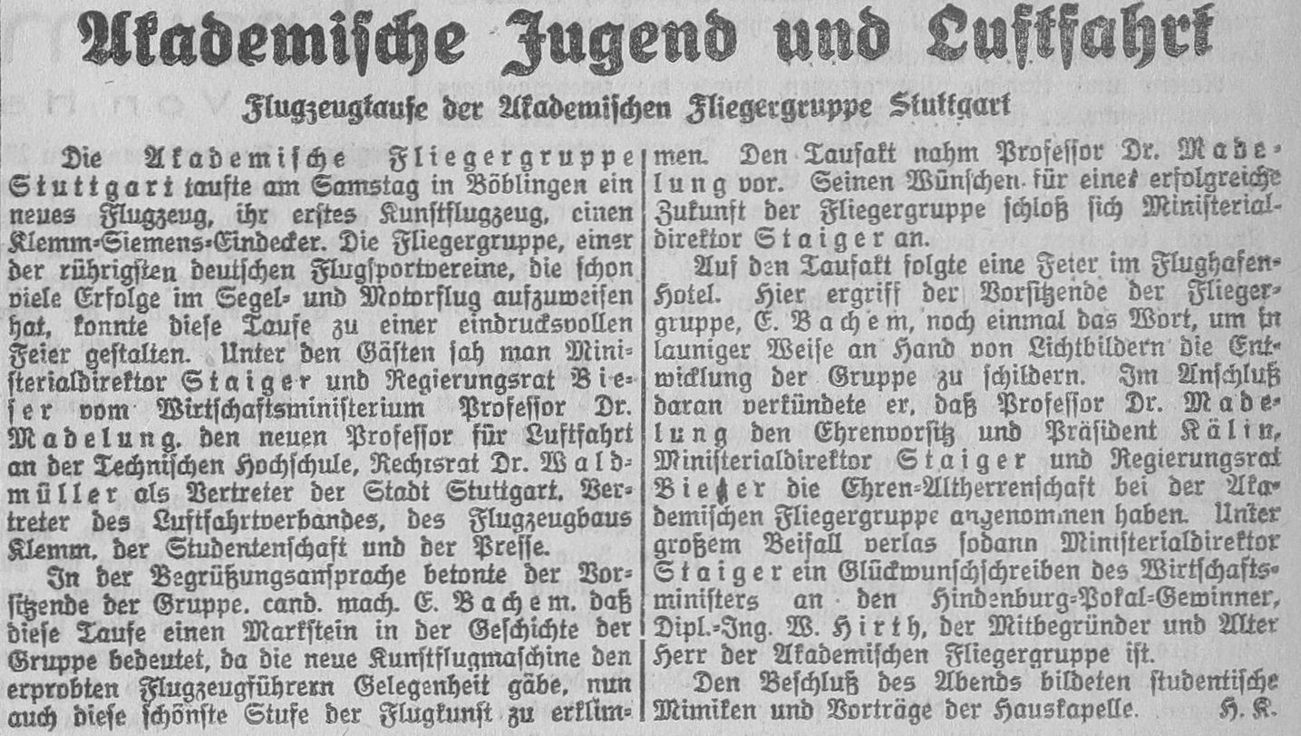 Bis Ende 1925 war die „Akademische Fliegergruppe Stuttgart“ nur ein loser Verband der Studierenden innerhalb des Flugtechnischen Vereins Stuttgart. Die zunehmenden „Unzuträglichkeiten“ mit den übrigen Mitgliedern des Vereins führten schließlich zu dem Beschluss aus dem Verein auszutreten und sich selbstständig zu machen. So wurde am 01. Dezember 1926 die „Akademische Fliegergruppe Stuttgart e.V.“ an der Technischen Hochschule (kurz AKAFLIEG) gegründet.