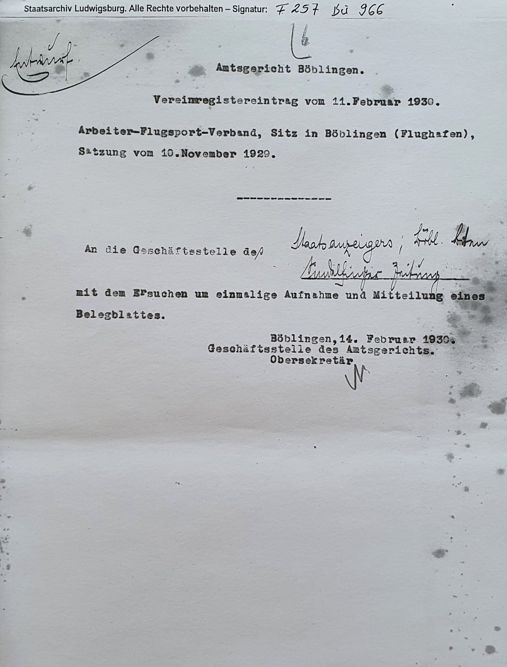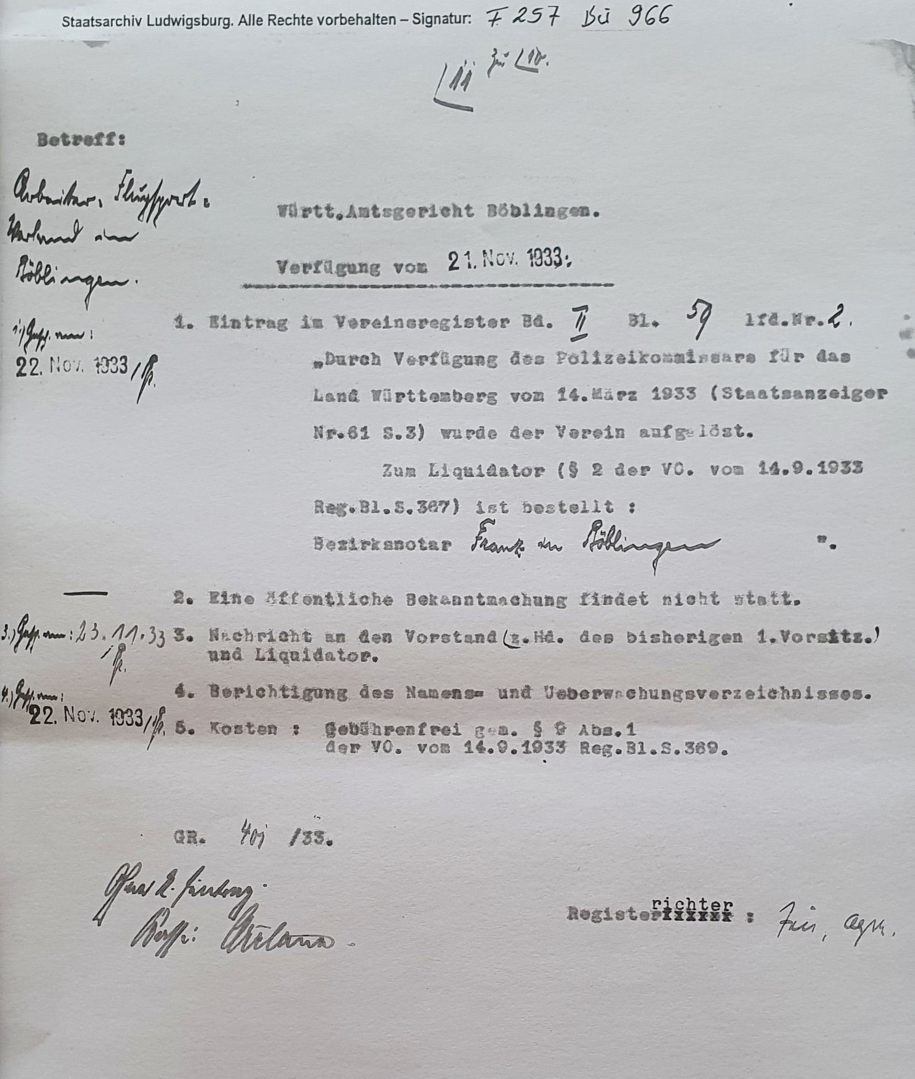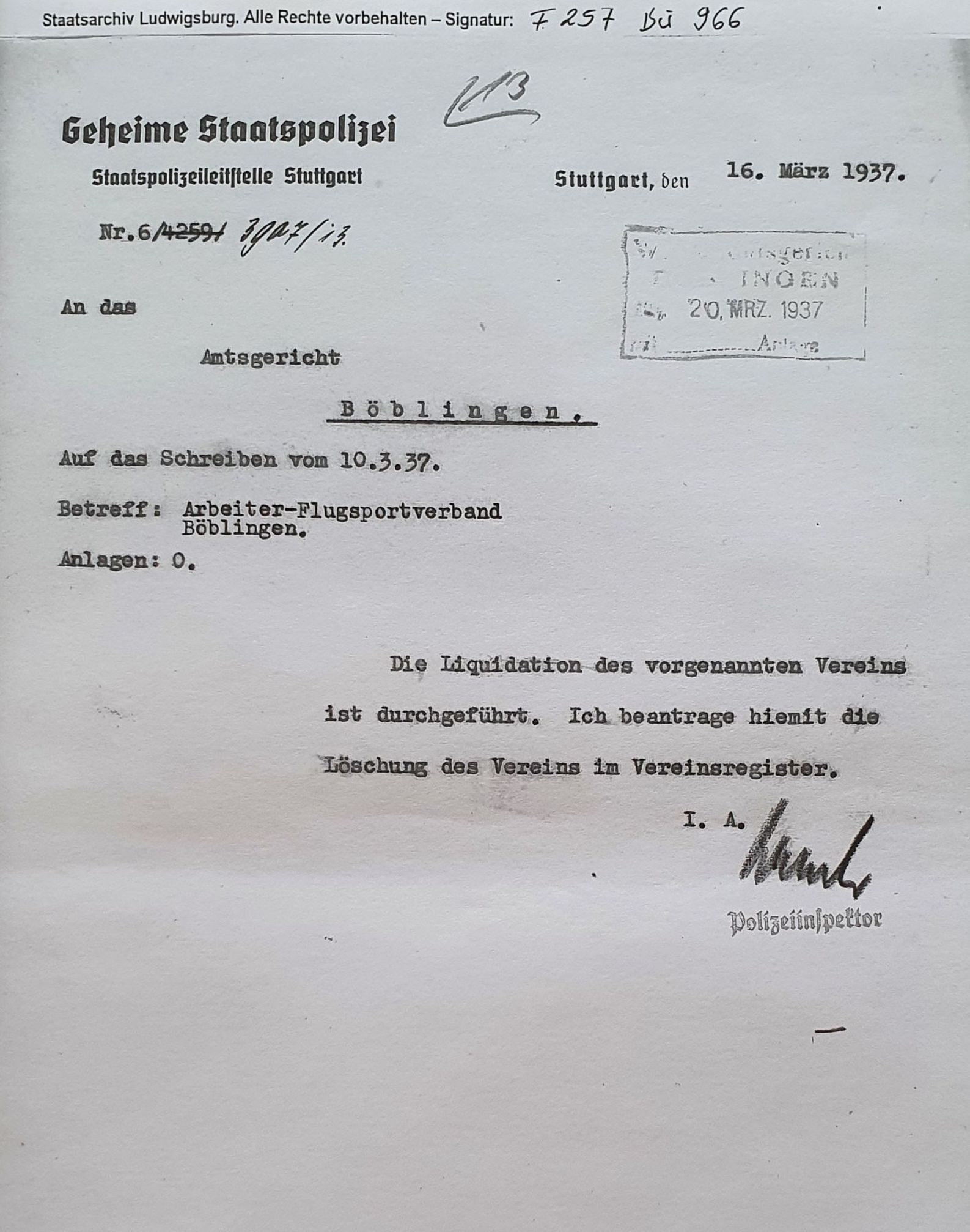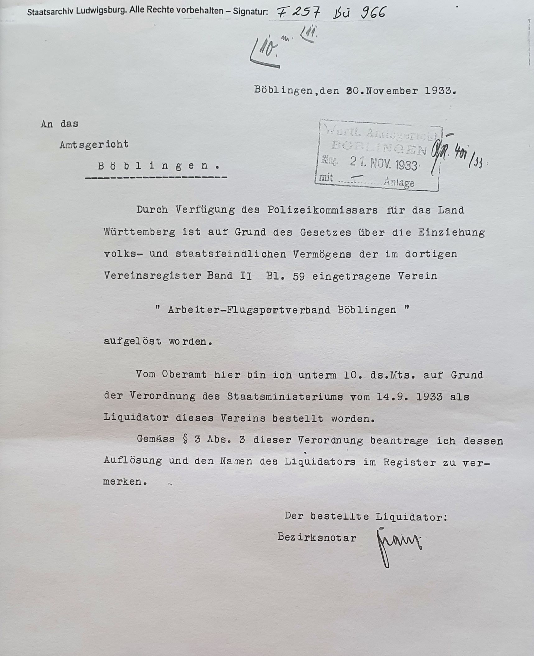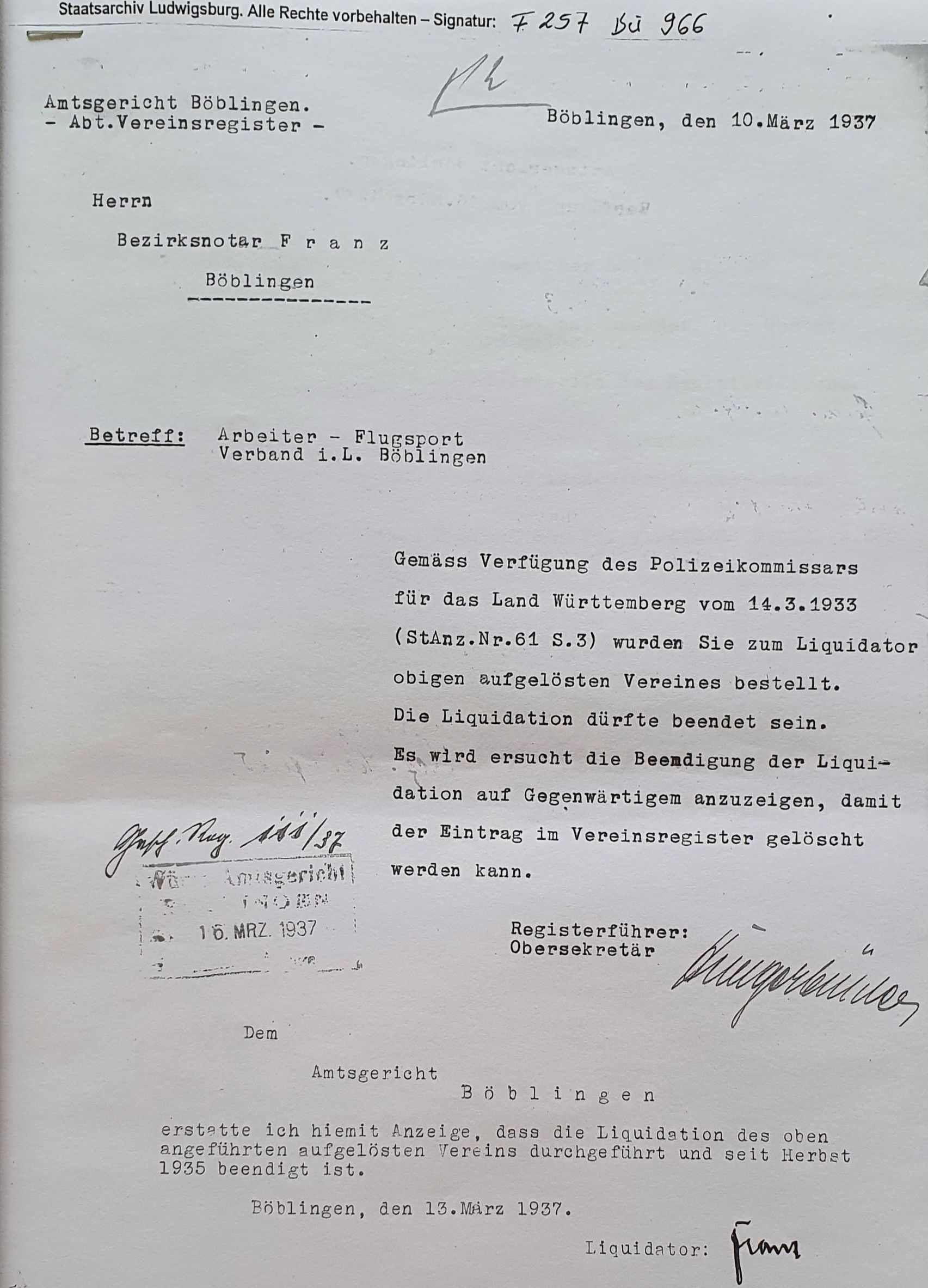 Der Verein wurde nach der Machtergreifung durch die Nationalsozialisten wieder aufgelöst! Im Schreiben vom 20. Nov. 1933 an das Amtsgericht Böblingen geht hervor: Durch Verfügung des Polizeikommissars für das Land Württemberg ist aufgrund des Gesetzes über die Einziehung volks- und staatsfeindliches Vermögen der im dortigen Vereinsregister Band II, Blatt 59 eingetragene Verein Arbeiter-Flugsportverband Böblingen aufgelöst worden. Als Liquidator wurde Bezirksnotar Franz bestellt, der die Liquidation im Herbst 1935 durchgeführt hat. Die Löschung des Vereins im Vereinsregister wurde im März 1937 endgültig bestätigt. Interessant ist, dass dieser Verein ganz in Vergessenheit geraten ist.