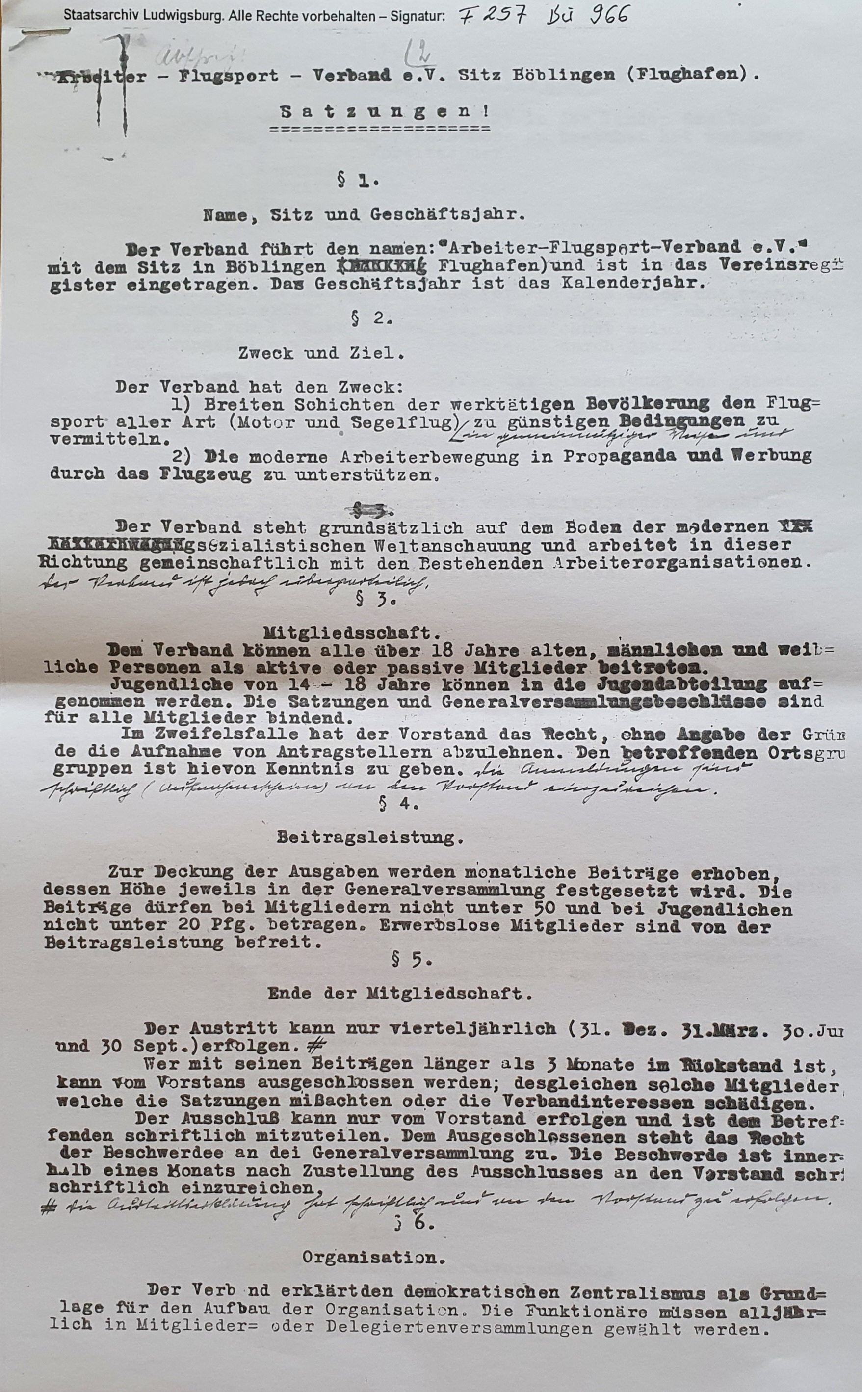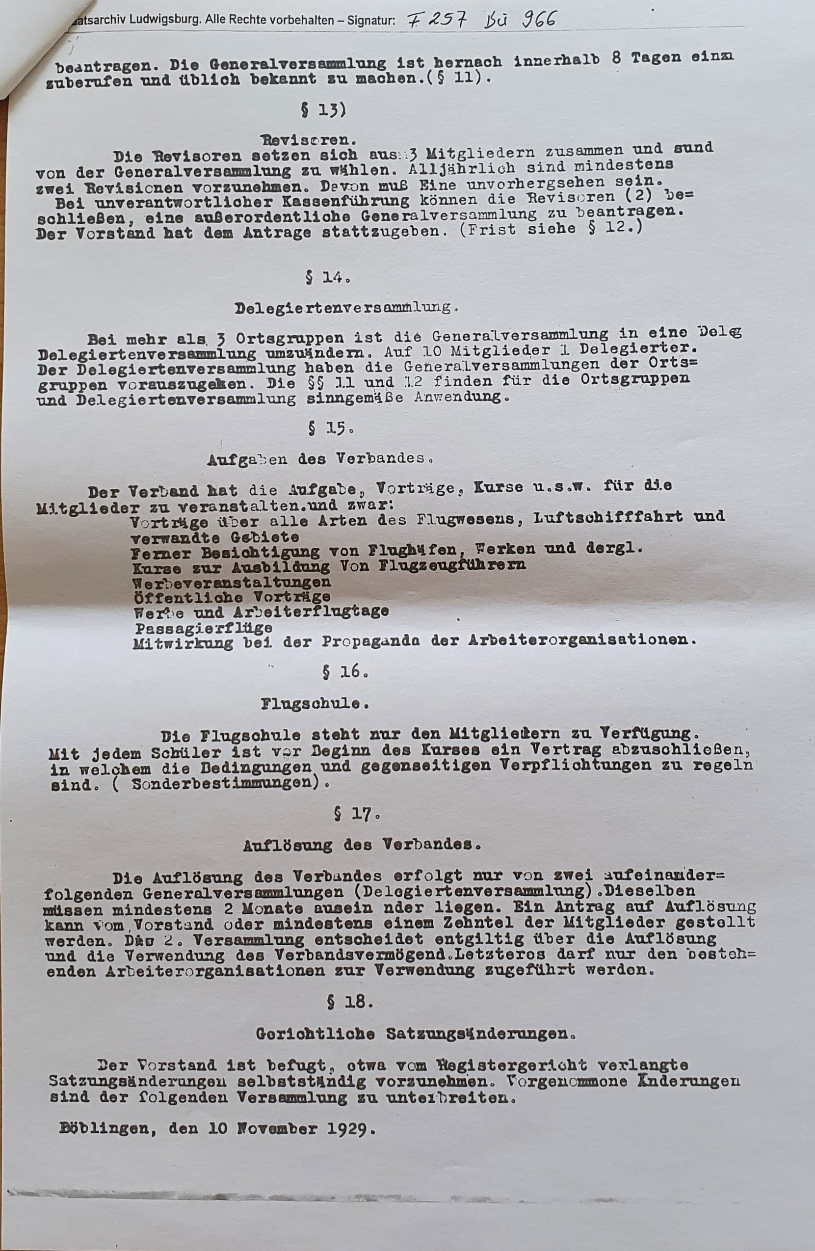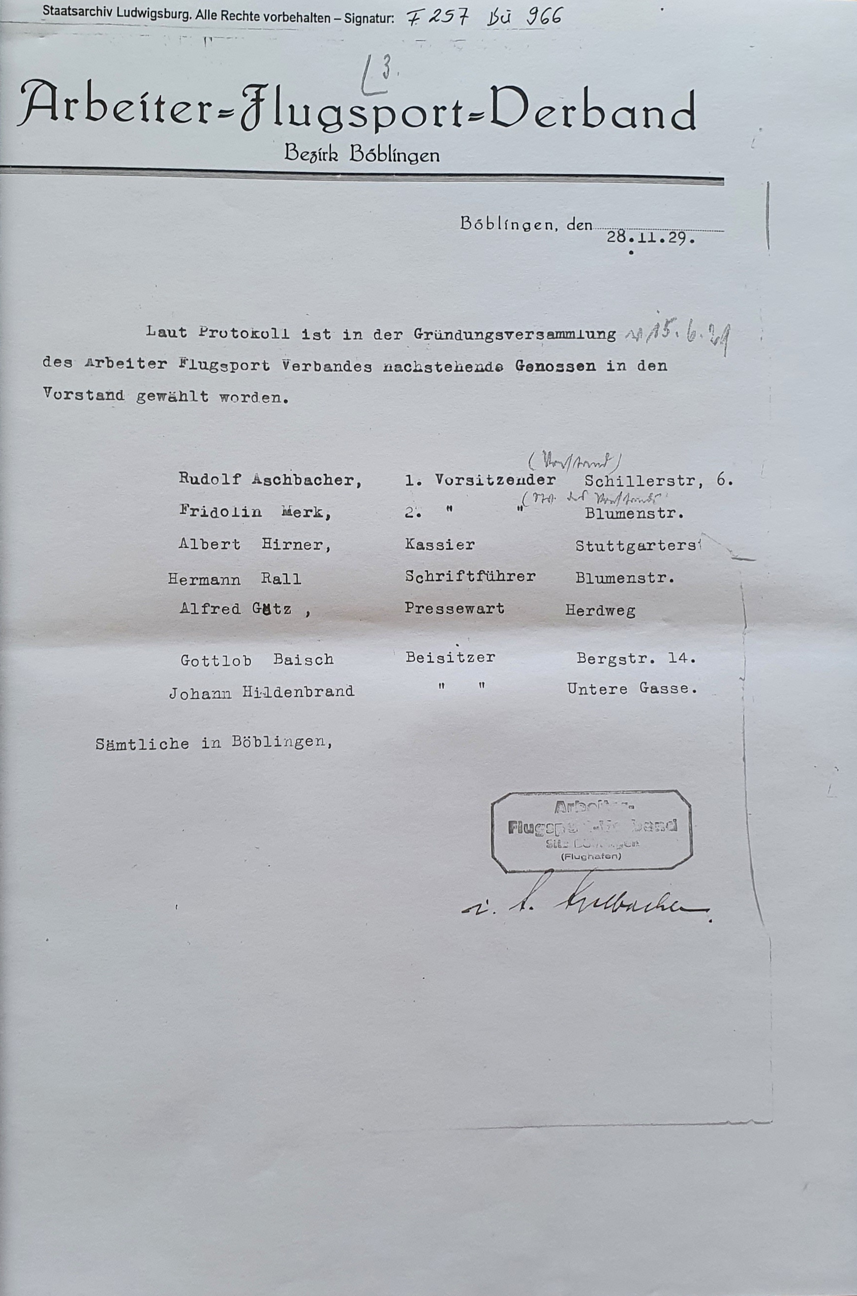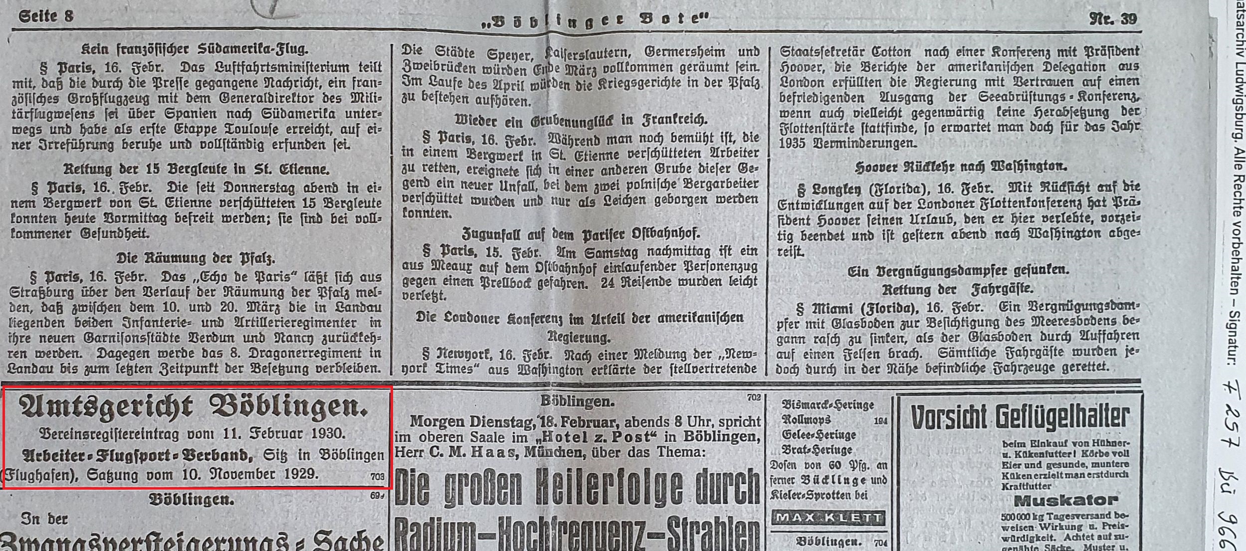 Der Verein wurde nach der Machtergreifung durch die Nationalsozialisten wieder aufgelöst! Im Schreiben vom 20. Nov. 1933 an das Amtsgericht Böblingen geht hervor: Durch Verfügung des Polizeikommissars für das Land Württemberg ist aufgrund des Gesetzes über die Einziehung volks- und staatsfeindliches Vermögen der im dortigen Vereinsregister Band II, Blatt 59 eingetragene Verein Arbeiter-Flugsportverband Böblingen aufgelöst worden. Als Liquidator wurde Bezirksnotar Franz bestellt, der die Liquidation im Herbst 1935 durchgeführt hat. Die Löschung des Vereins im Vereinsregister wurde im März 1937 endgültig bestätigt. Interessant ist, dass dieser Verein ganz in Vergessenheit geraten ist.