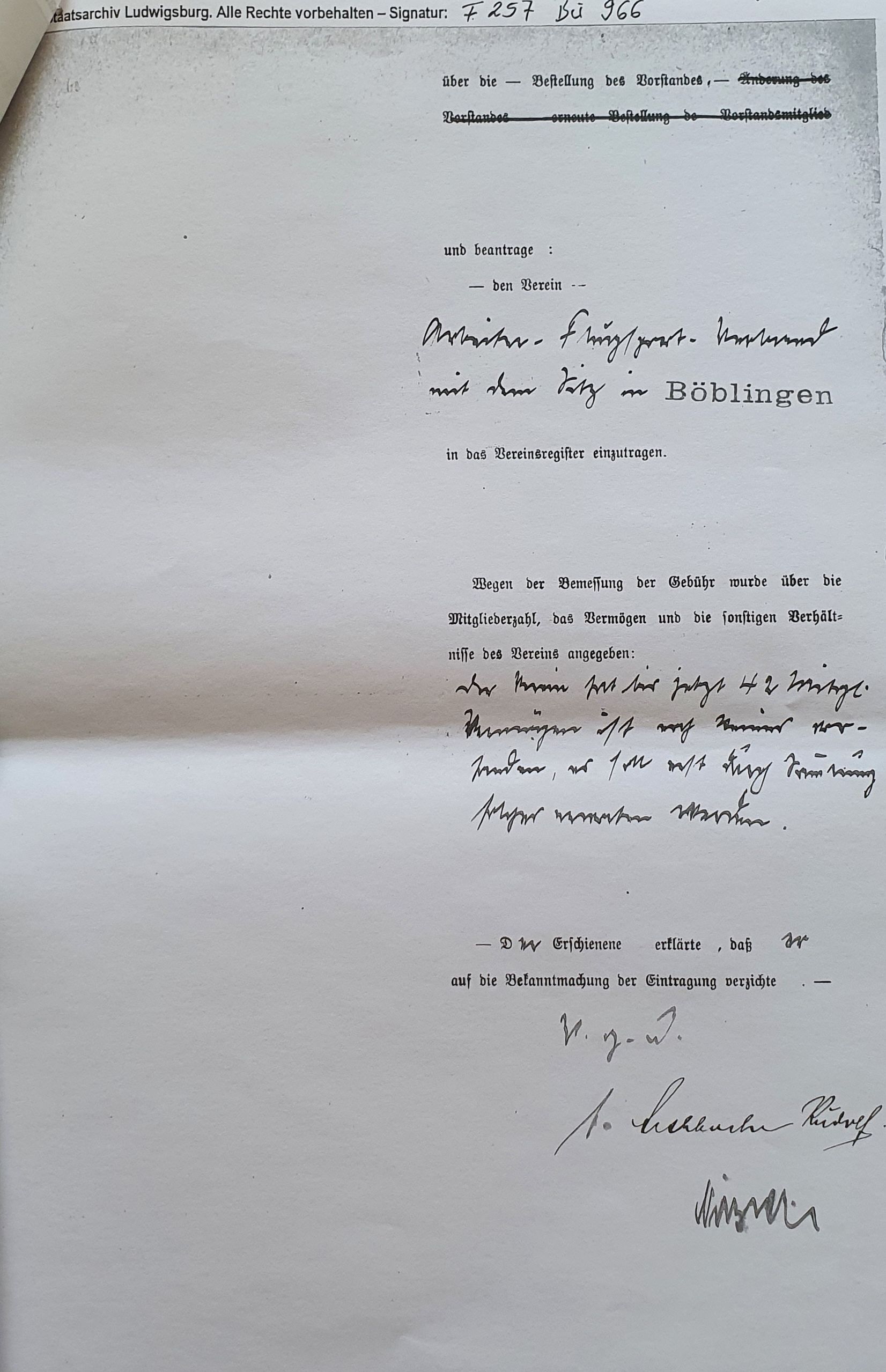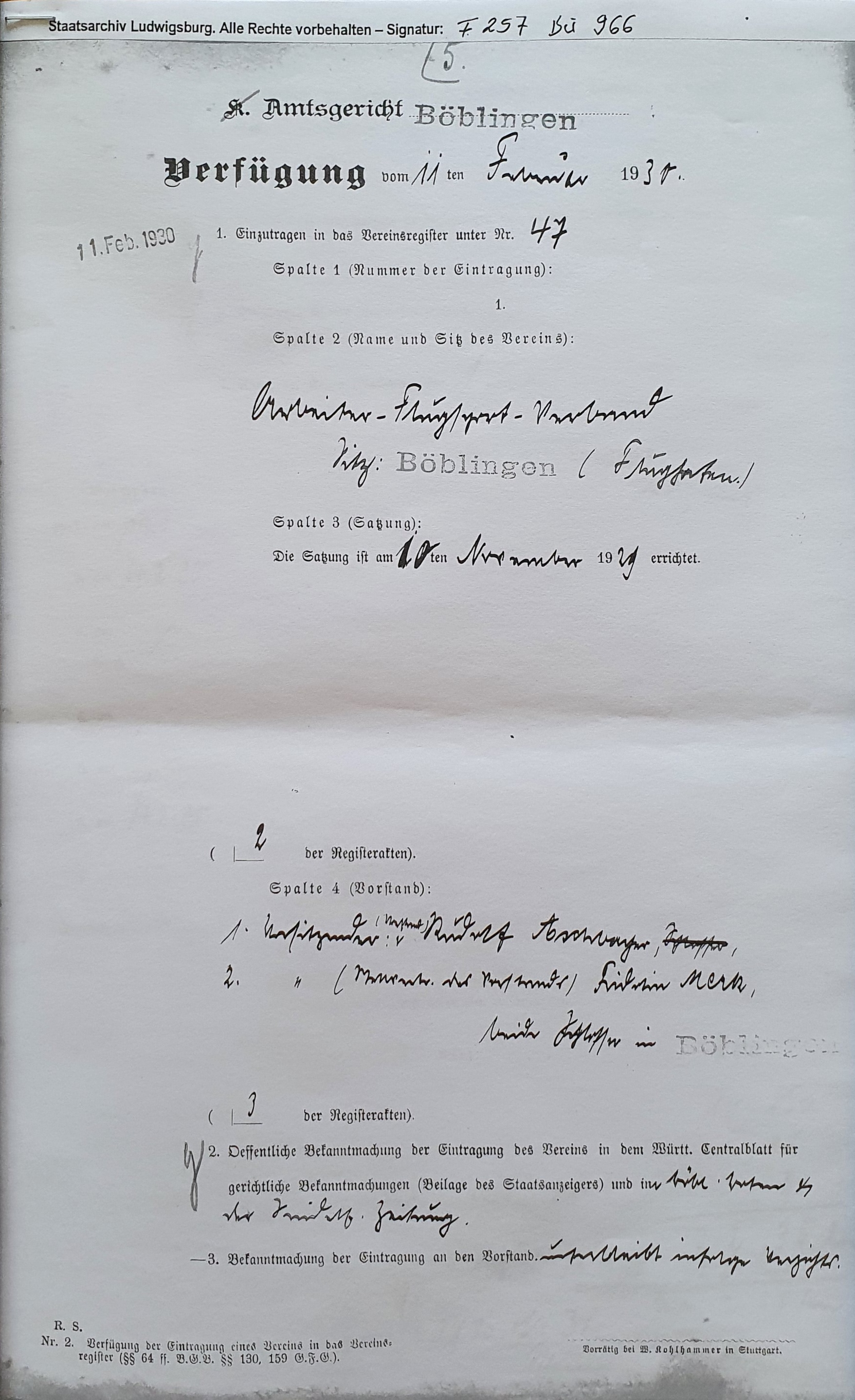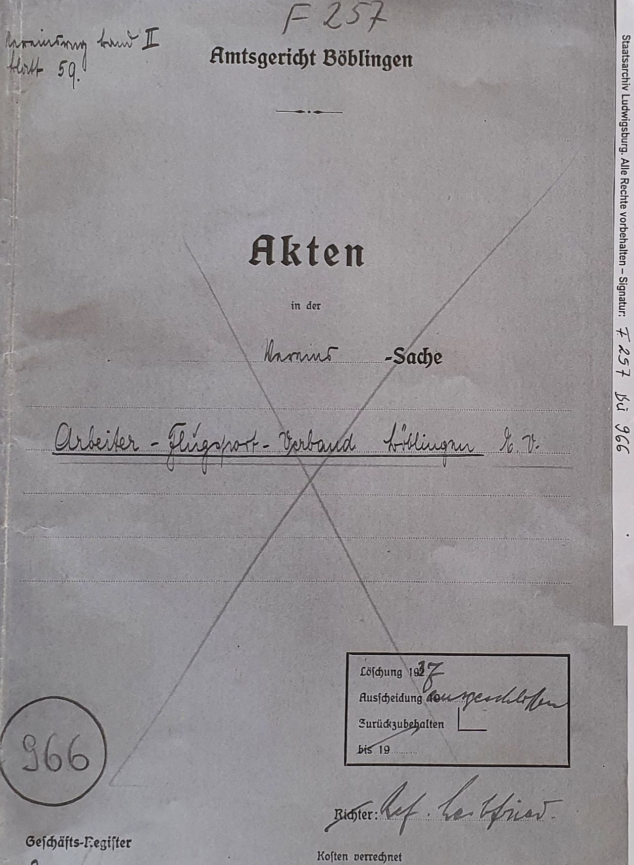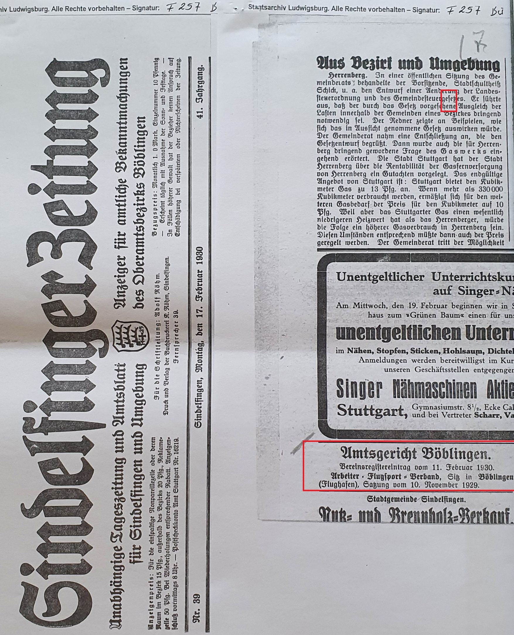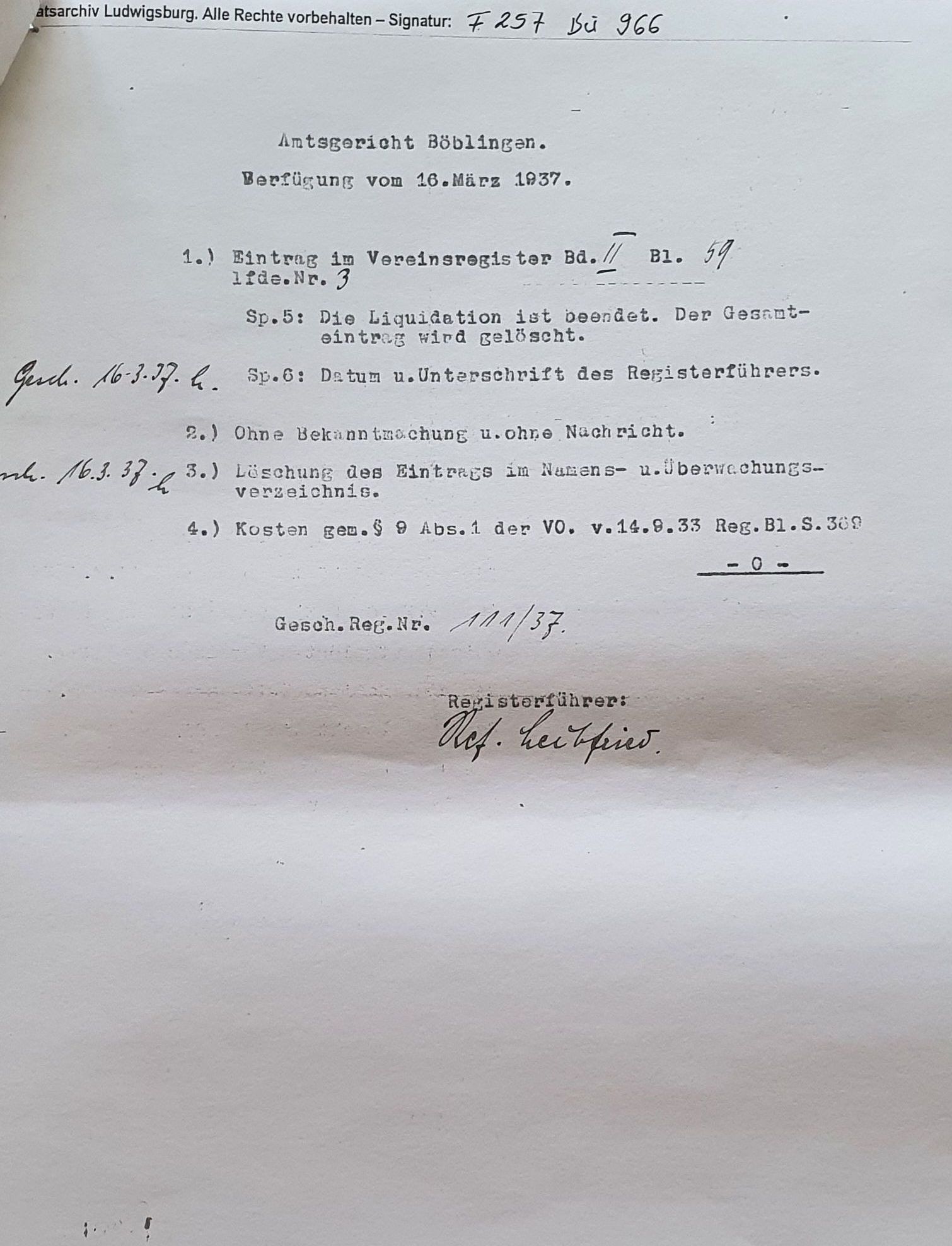 Der Verein wurde nach der Machtergreifung durch die Nationalsozialisten wieder aufgelöst! Im Schreiben vom 20. Nov. 1933 an das Amtsgericht Böblingen geht hervor: Durch Verfügung des Polizeikommissars für das Land Württemberg ist aufgrund des Gesetzes über die Einziehung volks- und staatsfeindliches Vermögen der im dortigen Vereinsregister Band II, Blatt 59 eingetragene Verein Arbeiter-Flugsportverband Böblingen aufgelöst worden. Als Liquidator wurde Bezirksnotar Franz bestellt, der die Liquidation im Herbst 1935 durchgeführt hat. Die Löschung des Vereins im Vereinsregister wurde im März 1937 endgültig bestätigt. Interessant ist, dass dieser Verein ganz in Vergessenheit geraten ist.