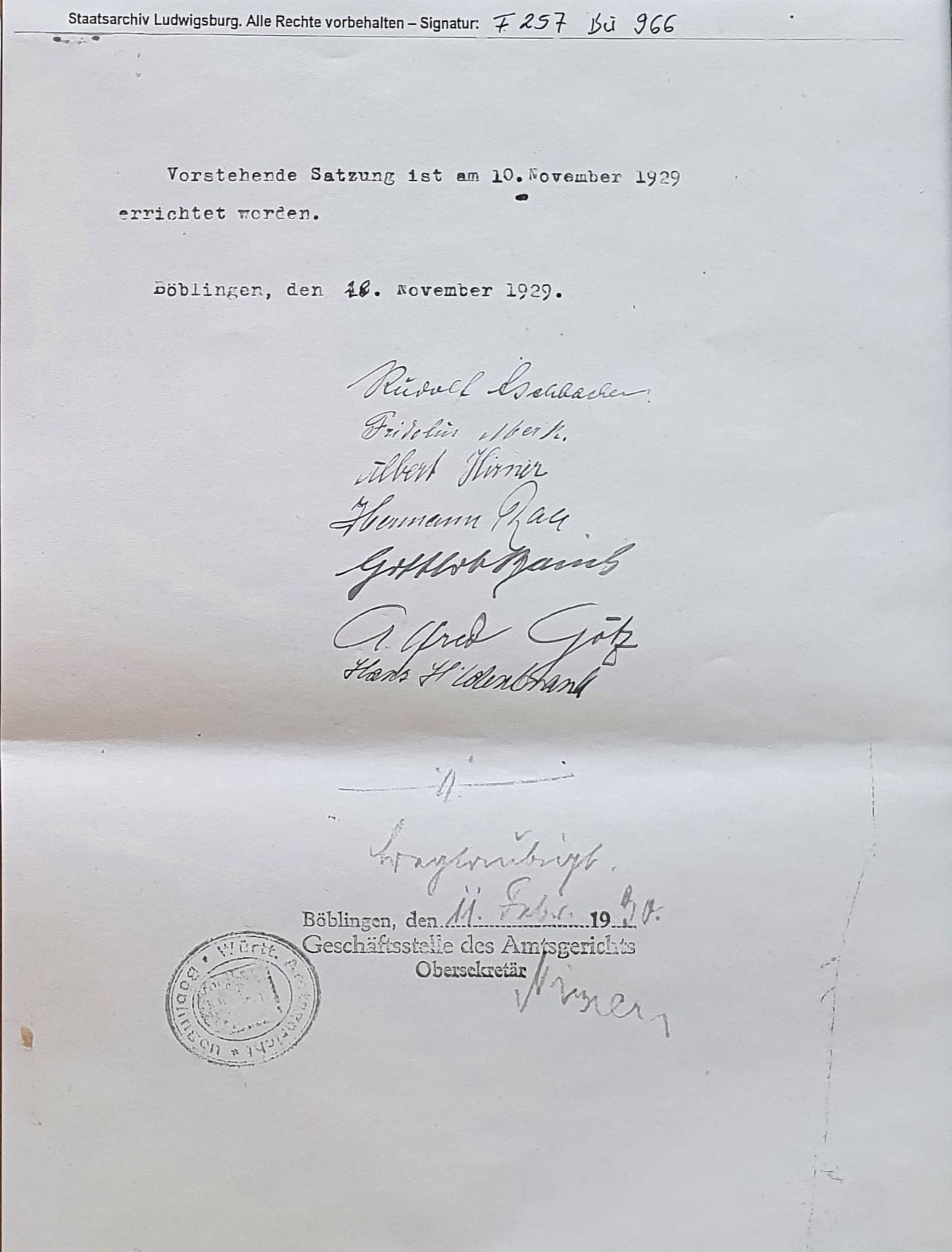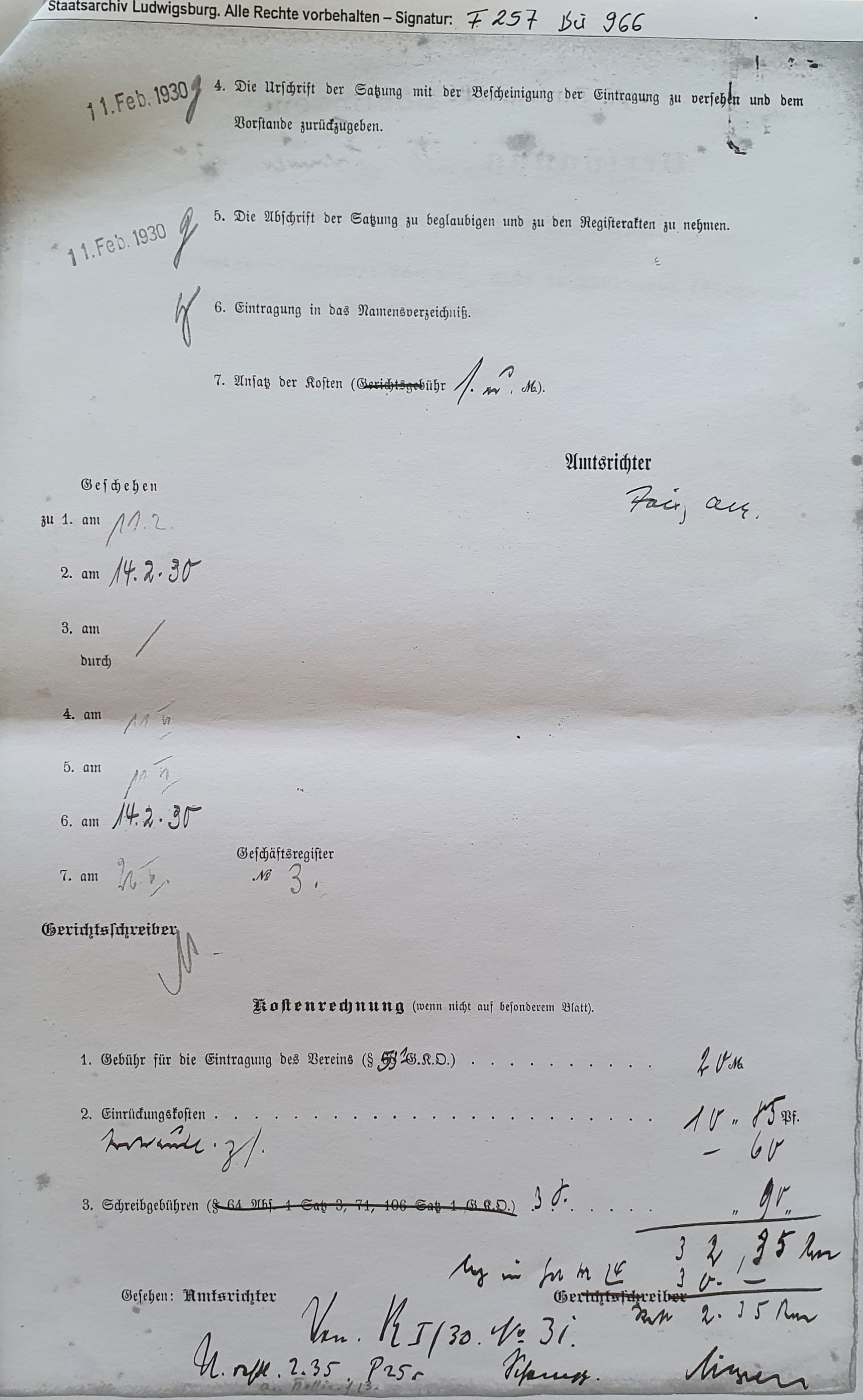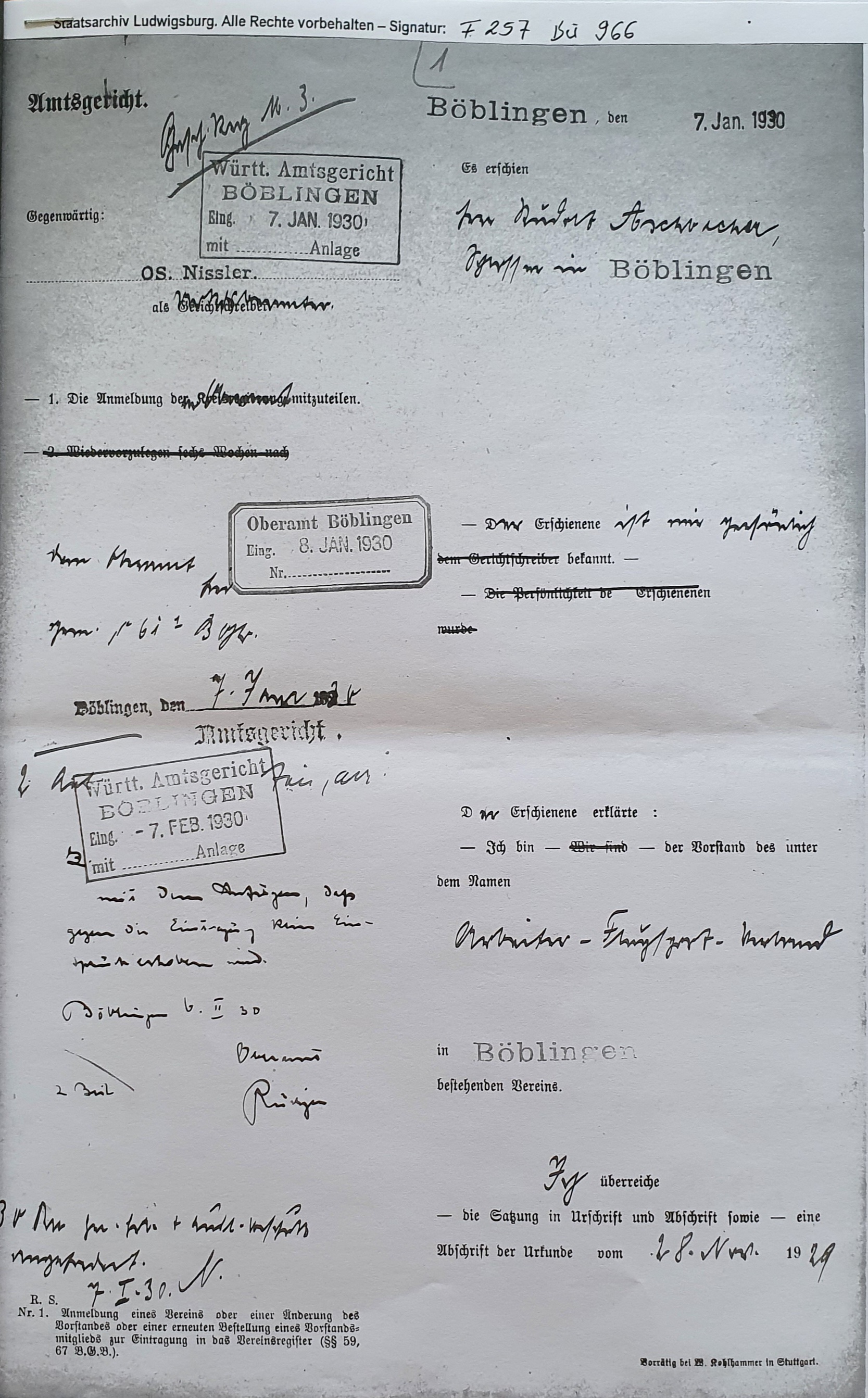 Die Gründungsversammlung fand am 15. Juni 1929 statt. Der Verein wurde am 11. Februar 1930 mit der Satzung vom 10. November 1929 in das Vereinsregister eingetragen. Bis zum 07. Januar 1930 hatten sich 42 Mitglieder eingetragen. Die Vorstandschaft besteht aus folgenden Herren: