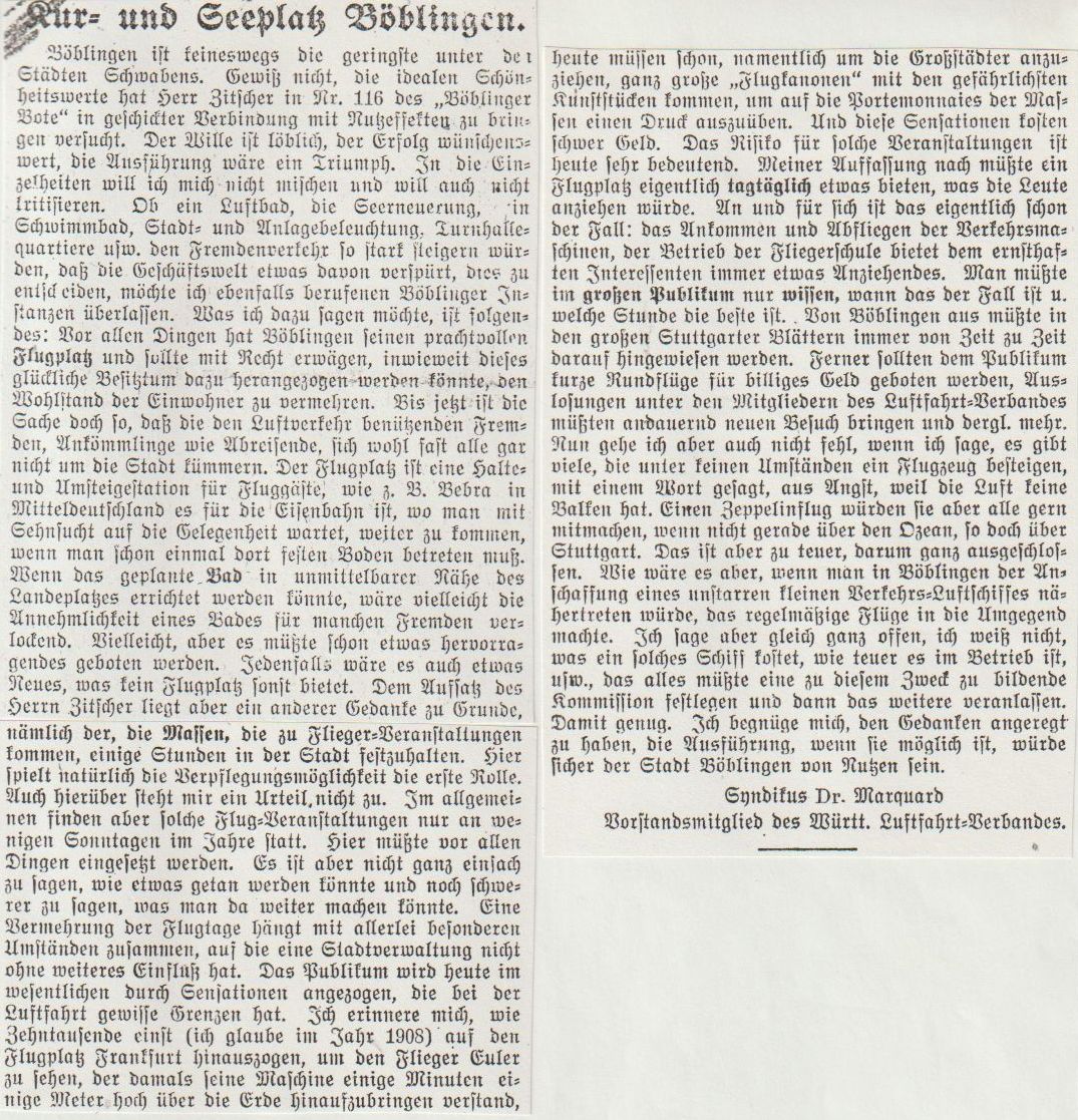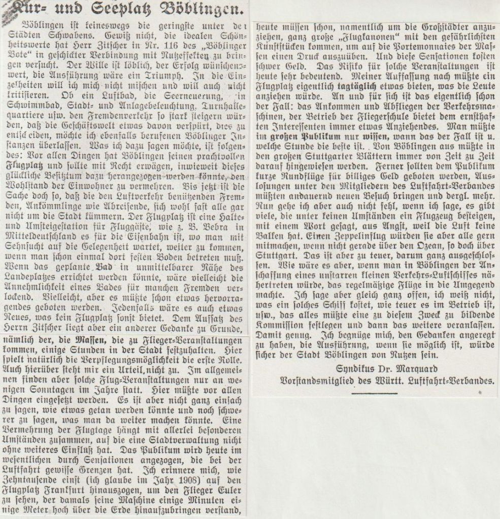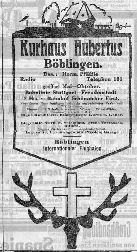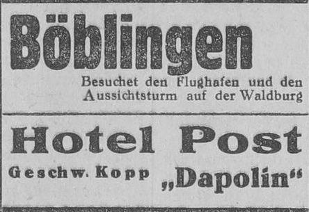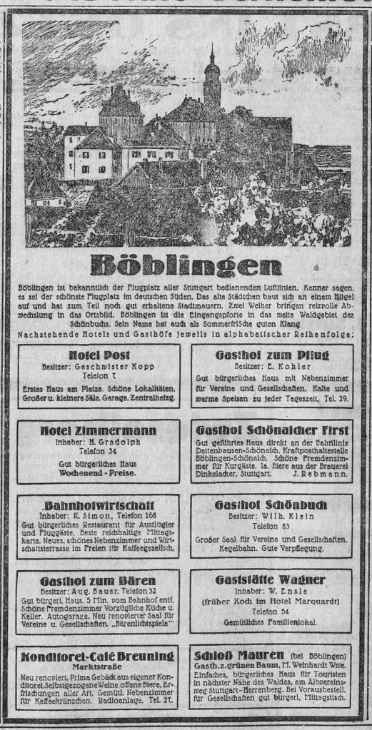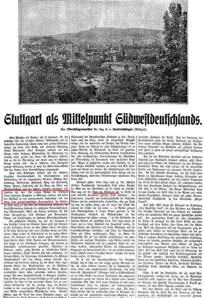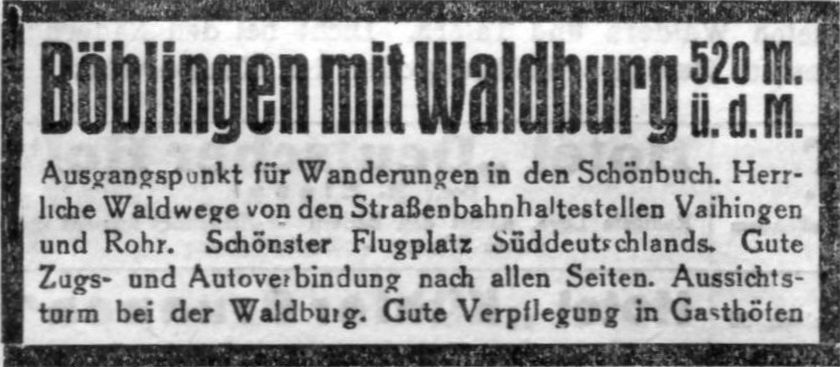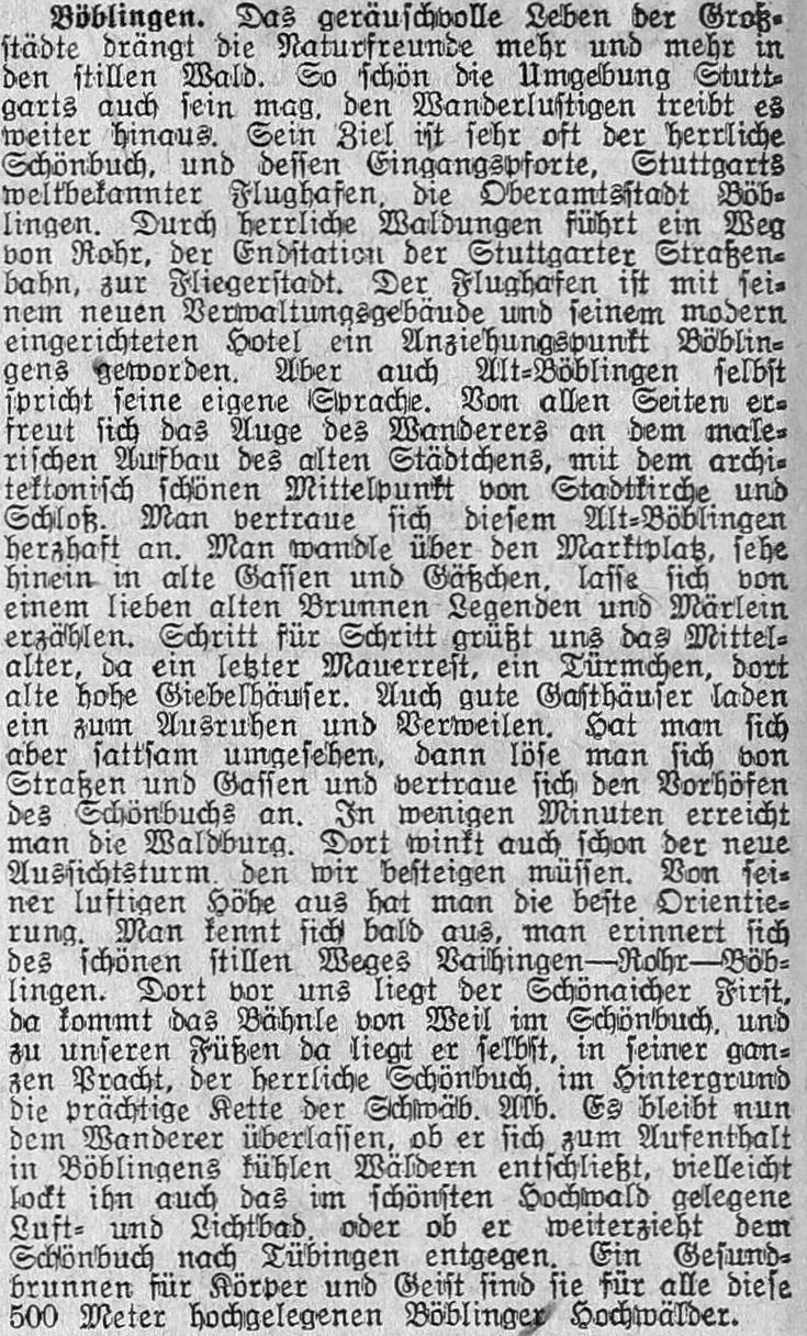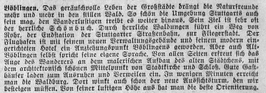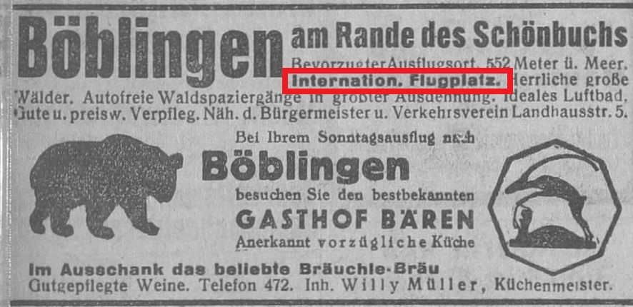 1929-08-17Böblingen ist bekanntlich der Flugplatz aller Stuttgart bedienenden Luftlinien.Kenner sagen, es sei der schönste Flugplatzn im deutschen Süden