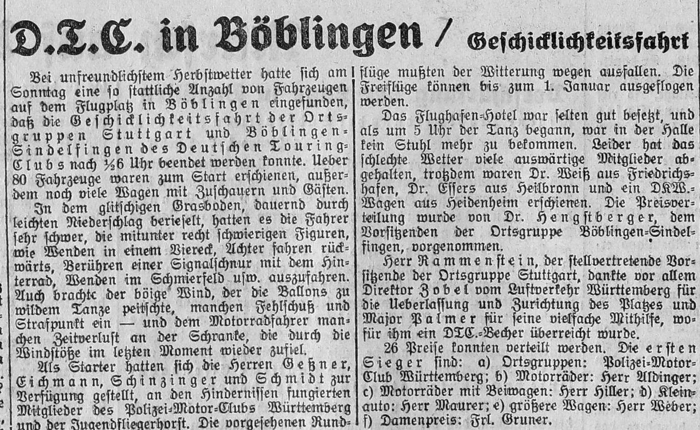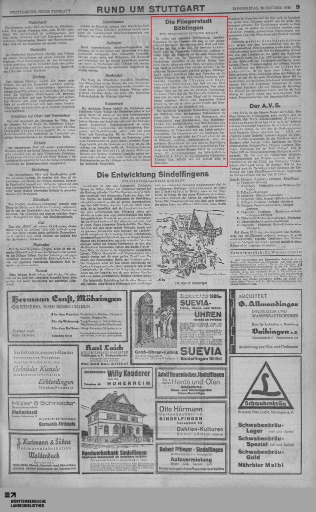 1930-10-07 DTC Geschicklichkeitsfahrt auf dem Flughafen + Flughafenhotel1930-10-30 Rund um Stuttgart – Die Fliegerstadt Böblingen (Stg.Neues Tagblatt)1931-06-20 Das alte Böblingen liegt vor uns. Der Flugplatz. Sindelfingen mit der Daimlerstadt…(Stuttgarter Neues Tagbatt)