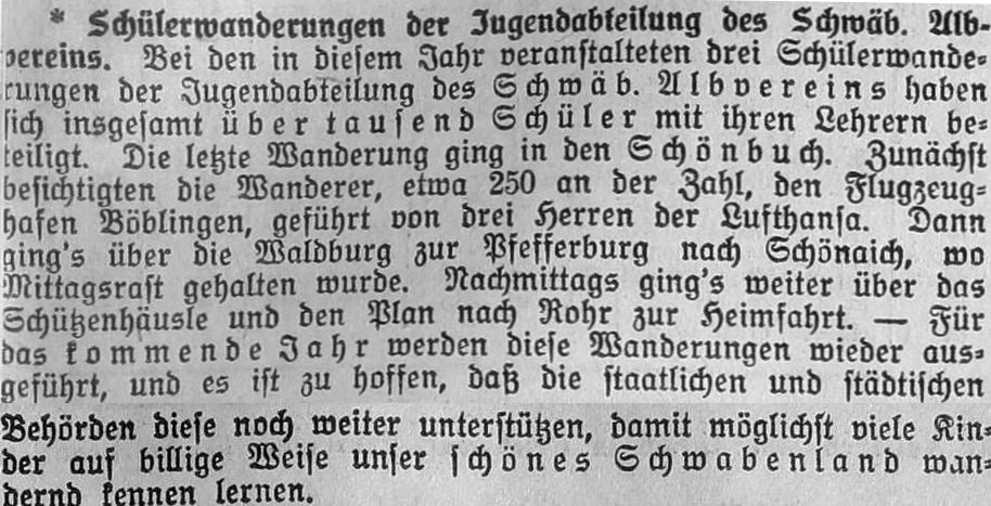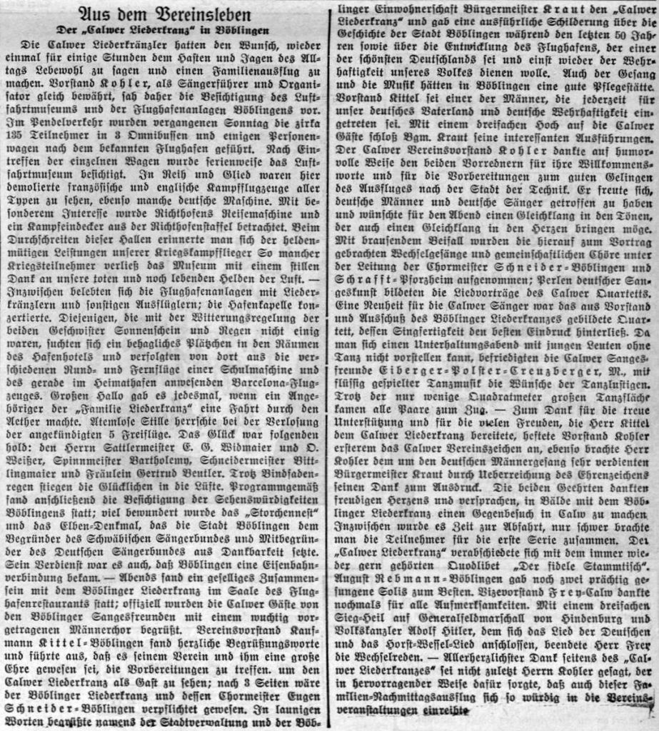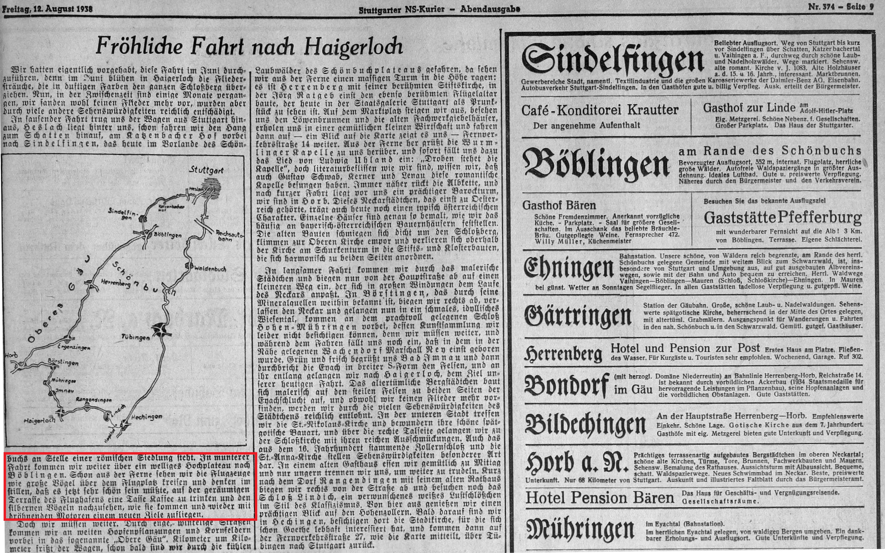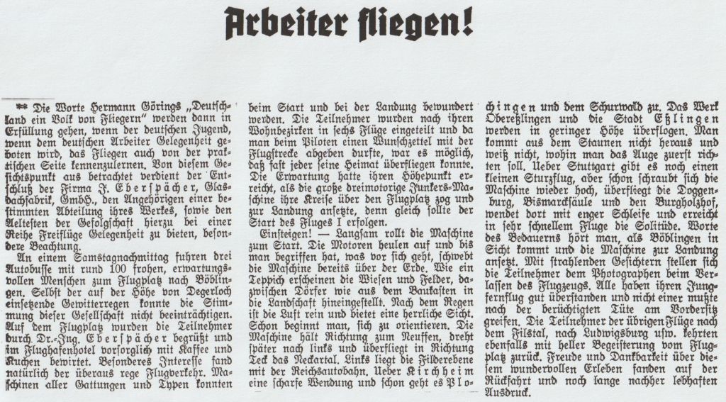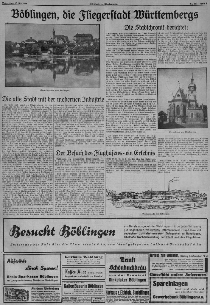 1933-06-17 unsere schöne Fliegerstadt1933-07-19 135 Teilnehmer Liederkranz Calw Besichtigung des Luftfahrtmuseums und der Flughafenanlagen19341934-05-17 Der Besuch des Flughafens-Ein Erlebnis (NS-Kurier)1938 Fliegerstadt Böblingen1938 Wandern Gastof Bären 1938-08-12 „auf der geräumigen Terrasse des Flughafens eine Tasse Kaffee zu trinken„(NS-Kurier)Datum ub Betriebsausflug Flughafenhotel und sechs Flüge (ub)