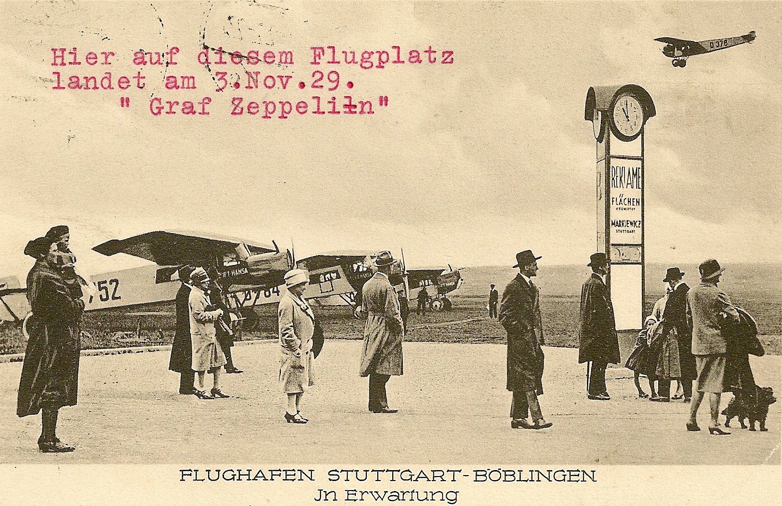 Vorarlberger Landes-Zeitung v. 23. Oktober 1929 berichtet „Der Zeppelinbesuch in Böblingen ist für den folgenden Sonntag, den 27. Oktober in Aussicht genommen. Die bereits ausgegebenen Karten behalten ihre Gültigkeit.“….. und kurze Zeit später: „Die für 20. Oktober geplante Süddeutschlandfahrt des Luftschiffs „Graf Zeppelin“ mit Landung auf dem Flughafen Stuttgart-Böblingen wird nach den bisherigen Dispositionen des Luftschiffbau Zeppelin am Sonntag, den 3. November, ausgeführt werden. Das Programm für die Fahrt ist das gleiche, wie es für den 20. Oktober vorgesehen war. Das Luftschiff verläßt Friedrichshafen morgens gegen 9 Uhr, macht eine Fahrt über Süddeutschland und erscheint zwischen 12 und 1 Uhr, ohne Stuttgart zu berühren, zur Landung auf dem Flughafen Böblingen. Der Aufenthalt ist auf 2-3 Stunden bemessen.