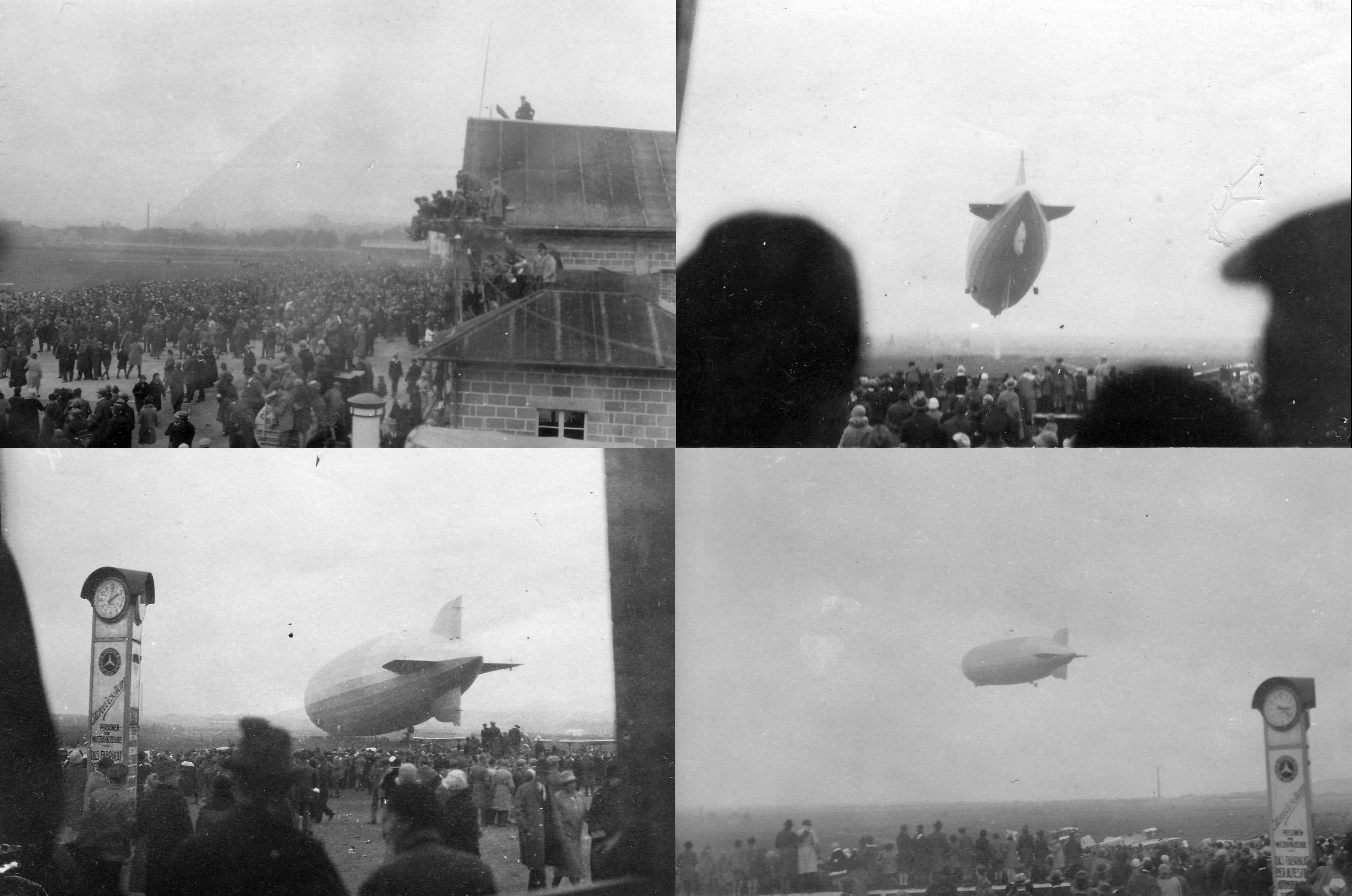 Um 12:15 Uhr wurde „Graf Zeppelin“ in seiner silbergrauen Tönung, durch die Wolkenwand stoßend, im Süden sichtbar, umkreist von den vier auf dem Flugplatz anwesenden Flugzeugen. Von den Tausenden und Abertausenden mit Jubel begrüßt, umkreiste das Luftschiff in langsamen Flug das Flugplatzgelände und stattete sodann der Stadt selbst in einem längeren Schleifenflug einen Besuch ab.