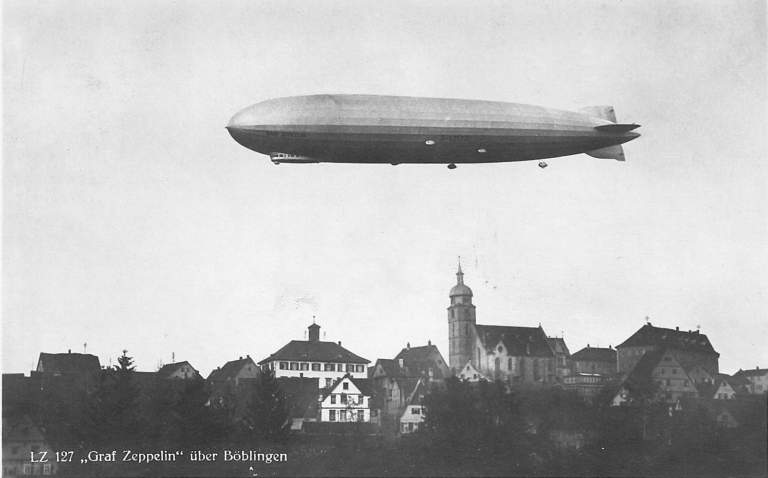 Hamburger Nachrichten 3.November 1929 – Ankündigung: Heute in Böblingen. Das Luftschiff „Graf Zeppelin“ wird am Sonntag auf seiner Süddeutschlandfahrt unter Führung von Dr. Eckener zwischen 12 und 13 Uhr in Böblingen landen. Außerdem werden Dr. Dürr, Dr. Maybach, Ministerialdirektor Scholl vom Innenministerium und Graf von Soden mit dem Luftschiff nach Böblingen kommen. Der Aufenthalt in Böblingen wird von den Wetterverhältnissen abhängen. Wenn mit dem frühzeitigen Auftreten von Bodennebeln in den Abendstunden zu rechnen ist, wird das Schiff frühzeitig nach Friedrichshafen zurückkehren, um die Landung in Friedrichshafen nicht zu erschweren.