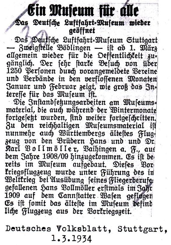 1934-02 Zu dem reichhaltigen Museumsmaterial ist Württembergs älteste Flugmaschine von den Gebrüdern Hans und Dr. Karl Vollmöller, Vaihingen/Filder, aus dem Jahre 1908 hinzugekommen. Dieses Flugzeug aus der Vorkriegszeit, wurde erstmals von dem im Weltkrieg gefallenen Hans Vollmöller auf dem Cannstatter Wasen geflogen.