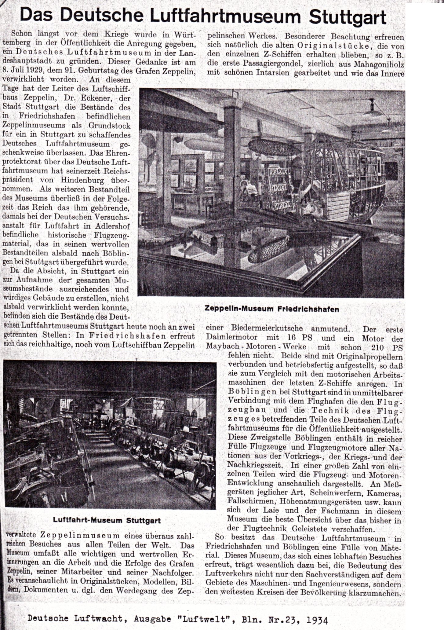 Das Reichsverkehrs-Ministerium überließ dem Museum das dem Reiche gehörende, bisher von der Deutschen Versuchsanstalt für Luftfahrt in Adlershof verwaltete Flugzeugmaterial, aus dem die wertvollsten Stücke für das Stuttgarter Museum ausgewählt wurden. Diese ausserordentlich umfangreiche und interessante Sammlung, die u.a. 37 Flugzeuge, 106 Motore und zahlreiche Konstruktions-Einzelteile und sonstiges Gerätematerial aller Art enthält, bildet neben den Beständen des „Zeppelin-Museums“ den nach Wert und Umfang gleich bedeutungsvollen Grundstock für den Ausbau des Museums.