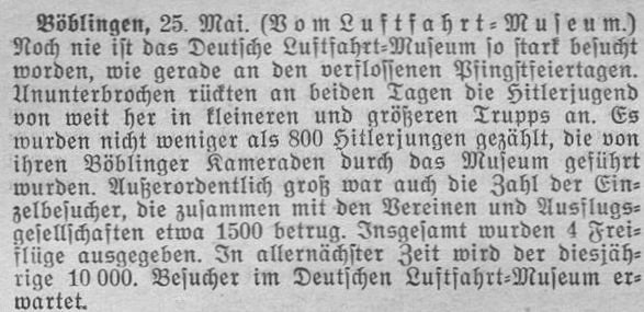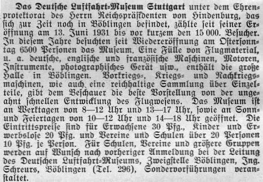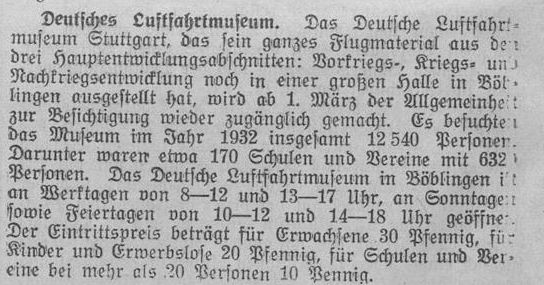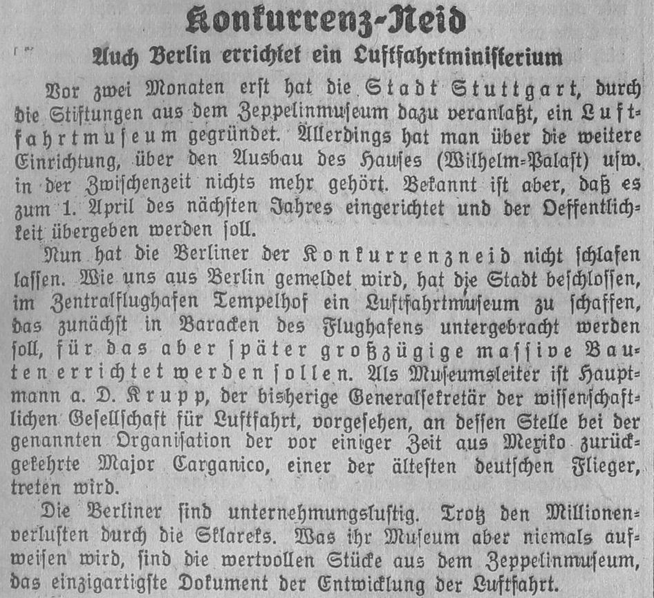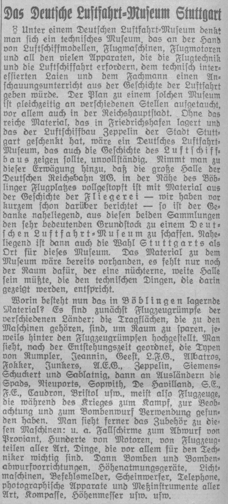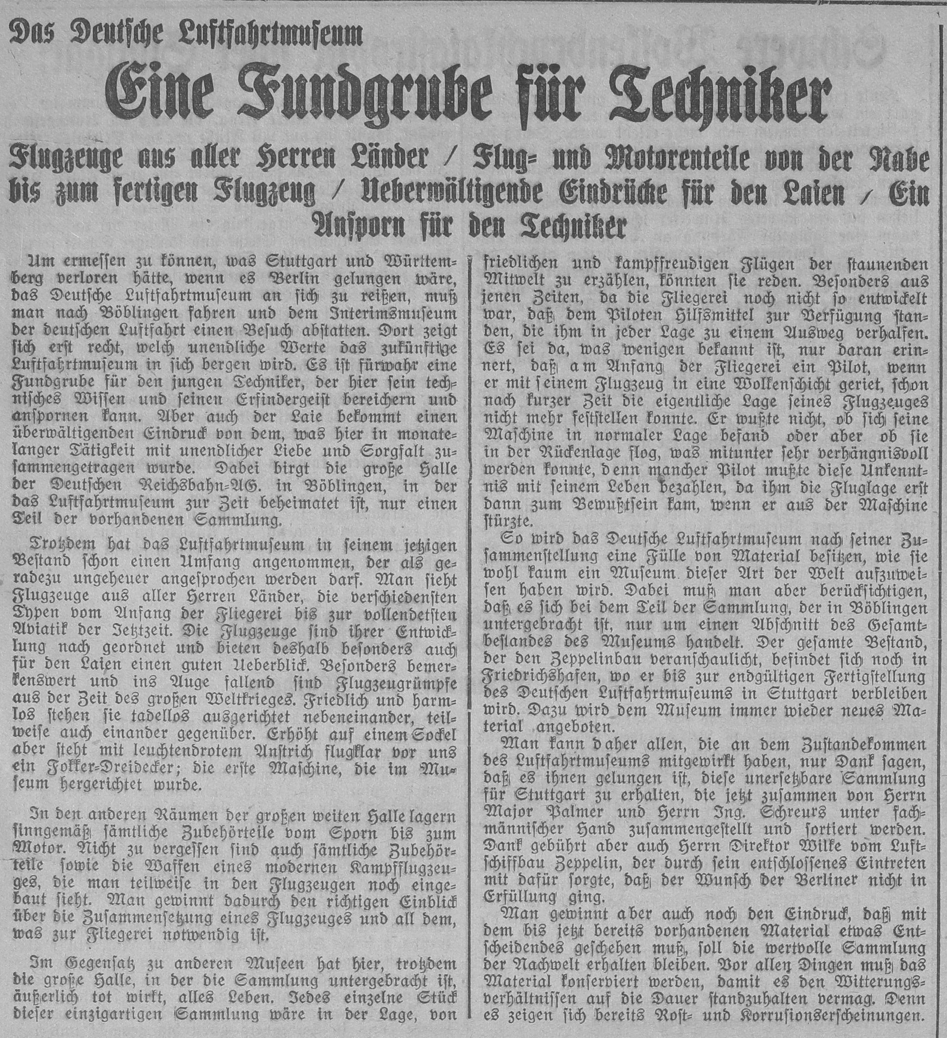 Man fragt sich unwillkürlich, wie es nun mit dem Plan des Deutschen Luftfahrtmuseums in Stuttgart steht. Sind die Sammlungen und die Mittel für diese Institut gesichert? Wir können mitteilen, daß das Projekt zur Schaffung des Deutschen Luftfahrtmuseums in Stuttgart in keiner Weise aufgegeben oder durch den Berliner Plan beeinträchtigt ist. Die Ausführung des Projektes wird verzögert wegen der knappen Mittel, die der Stadt Stuttgart sowie dem Reich und sonstigen zur Beihilfe verpflichteten Stellen zur Verfügung stehen. Wenn von Berlin gemeldet wird, der Inhalt des Zeppelin-Museum in Friedrichshafen werde dem Luftfahrtmuseum in Berlin zur Verfügung gestellt, so ist dieser entgegenzuhalten, dass doch die Stadt Stuttgart Eigentümerin des Zeppelin-Museums in Friedrichshafen ist. Außerdem plant man, wie bekannt, die Erwerbung des umfangreichen wertvollen Flugzeugmaterials, das in Böblingen lagert und derzeit noch Eigentum der Versuchsanstalt für Luftfahrt ist. Man kann also mit Befriedigung feststellen, daß durch die Pläne, die man angeblich jetzt in Berlin durchführen will, das Deutsche Luftfahrtmuseum in Stuttgart nicht gefährdet ist