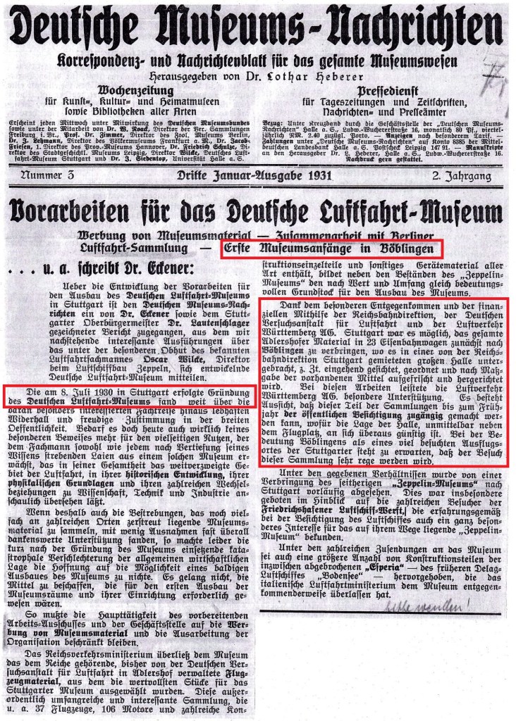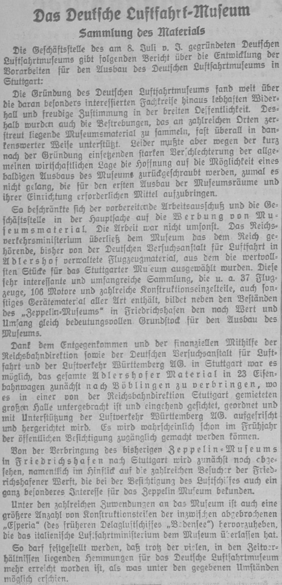 1930-12-20 Bericht Deutsches Luftfahrt-Museum Stuttgart: Die am 8.Juli v.Js. In Stuttgart erfolgte Gründung des Deutschen Luftfahrt-Museums fand weit über die daran besonders interessierten Fachkreise hinaus lebhaften Widerhall und freudige Zustimmung in der breiten Öffentlichkeit. Bedarf es doch heute auch wirklich keines besonderen Beweises mehr für den vielseitigen Nutzen, der dem Fachmann sowohl wie jedem nach Vertiefung seines Wissens strebenden Laien aus einem solchen Museum erwächst, das in seiner Gesamtheit das weitverzweigte Gebiet der Luftfahrt in ihrer historischen Entwicklung, ihren physikalischen Grundlagen und ihren zahlreichen Wechselbeziehungen zu Wissenschaft, Technik und Industrie anschaulich übersehen lässt.