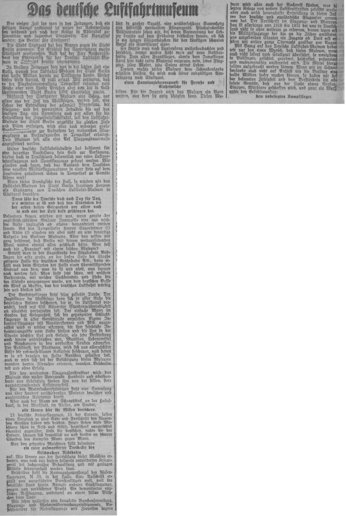 1931-03-23 Das neue Deutsche Luftfahrt-Museum (Stuttgarter Neues Tagblatt) Das Luftfahrtmuseum in Stuttgart bleibt: In Stuttgart hat die Meldung, daß ein Deutsches Luftfahrtmuseum für Berlin gesichert sei, starke Beunruhigung hervorgerufen. Eine Berliner Zeitung hat gestern diese Nachricht verbreitet. Mit erheblichen Mitteln privater Stifter soll in der Reichshauptstadt noch im Laufe dieses Jahres ein Deutsches Luftfahrtmuseum errichtet werden. Voraussichtlich werde schon im April mit den Bauarbeiten begonnen. Das Gebäude soll auf einem Geländeteil der Nordwestecke des Flugplatzes Tempelhof errichtet werden.