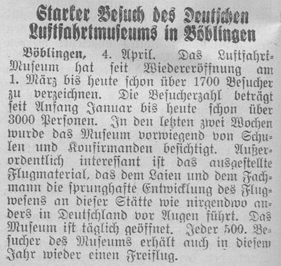 1932-06-13 4000 Besucher in 1932. Am vergangenen Samstag erwartete das Deutsche Luftfahrt-Museum Böblingen seinen diesjährigen 4000. Besucher. Gegen 16.30 Uhr erschien der vorher angemeldete Offiziersverein aus Pforzheim mit seinen Angehörigen. Glückliche Gewinnerin des 2. Freiflugs war eine junge Dame eines Mitglieds des Offiziervereins. Außerordentlich gut besucht war das Museum auch über den Sonntag. Der 4500. Besucher dürfte in den nächsten Tagen schon erwartet werden.