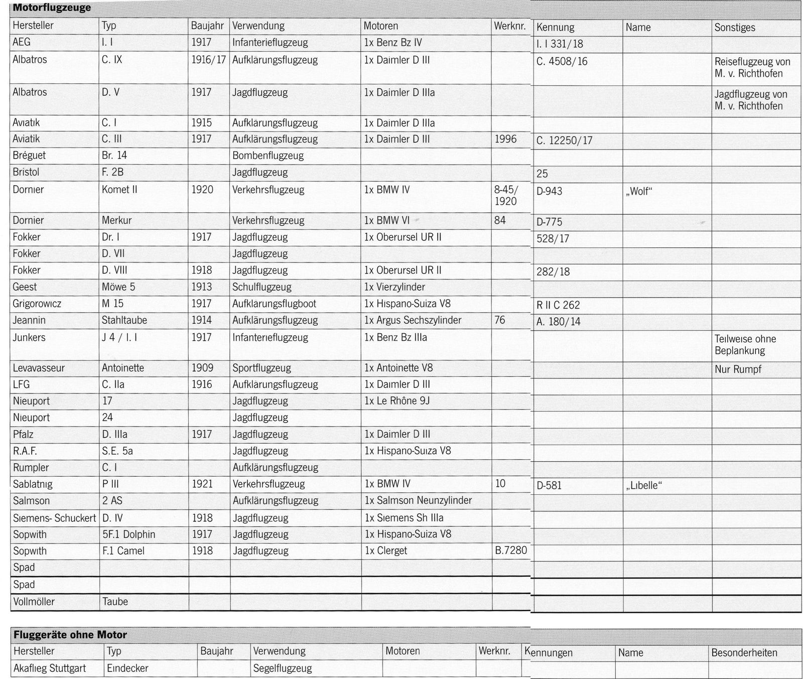 Das Reichsverkehrs-Ministerium überließ dem Museum das dem Reiche gehörende, bisher von der Deutschen Versuchsanstalt für Luftfahrt in Adlershof verwaltete Flugzeugmaterial, aus dem die wertvollsten Stücke für das Stuttgarter Museum ausgewählt wurden. Diese ausserordentlich umfangreiche und interessante Sammlung, die u.a. 37 Flugzeuge, 106 Motore und zahlreiche Konstruktions-Einzelteile und sonstiges Gerätematerial aller Art enthält, bildet neben den Beständen des „Zeppelin-Museums“ den nach Wert und Umfang gleich bedeutungsvollen Grundstock für den Ausbau des Museums.