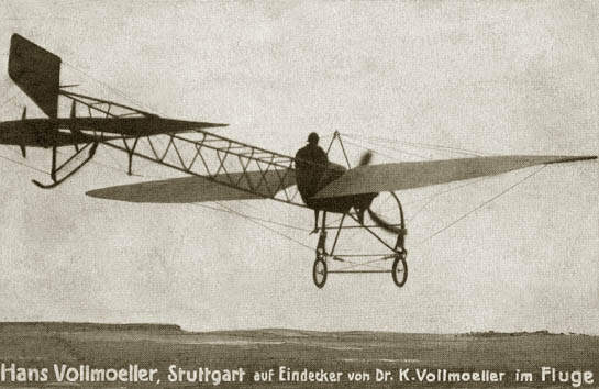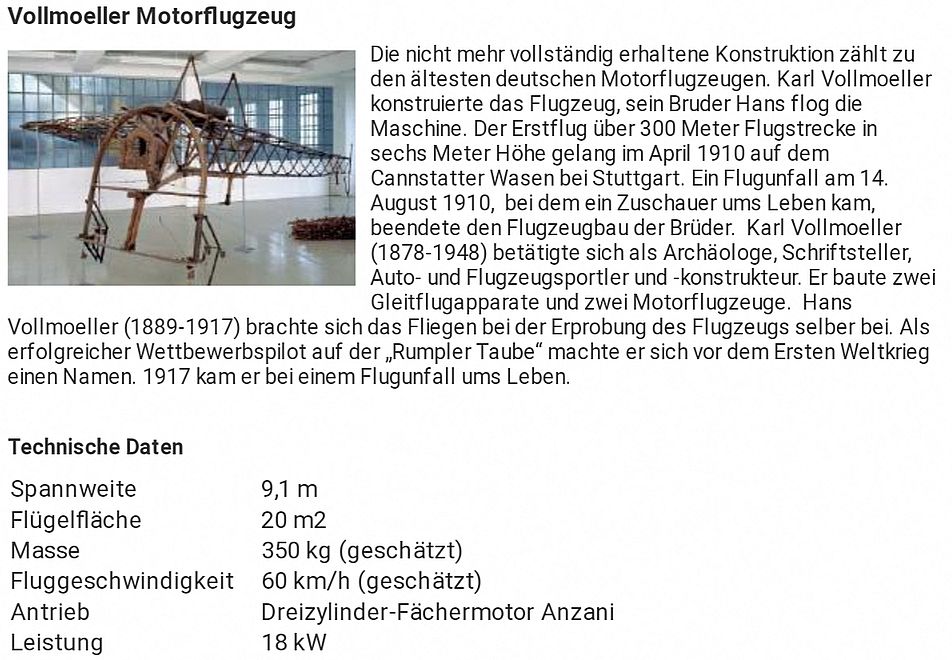 1934-02 Zu dem reichhaltigen Museumsmaterial ist Württembergs älteste Flugmaschine von den Gebrüdern Hans und Dr. Karl Vollmöller, Vaihingen/Filder, aus dem Jahre 1908 hinzugekommen. Dieses Flugzeug aus der Vorkriegszeit, wurde erstmals von dem im Weltkrieg gefallenen Hans Vollmöller auf dem Cannstatter Wasen geflogen.
