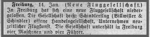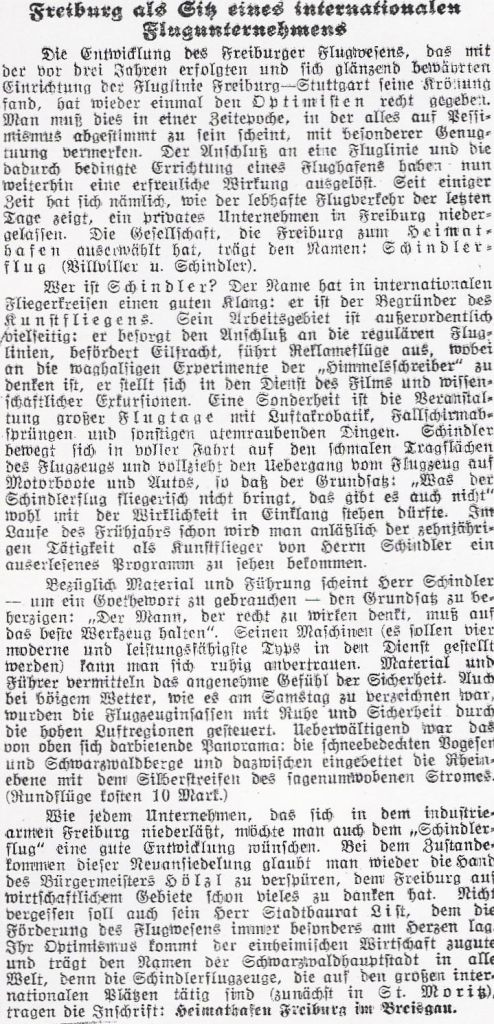 Freiburg setzte große Hoffnungen auf die Firma Schindlerflug, wie die folgenden Zeitungsberichte zeigen