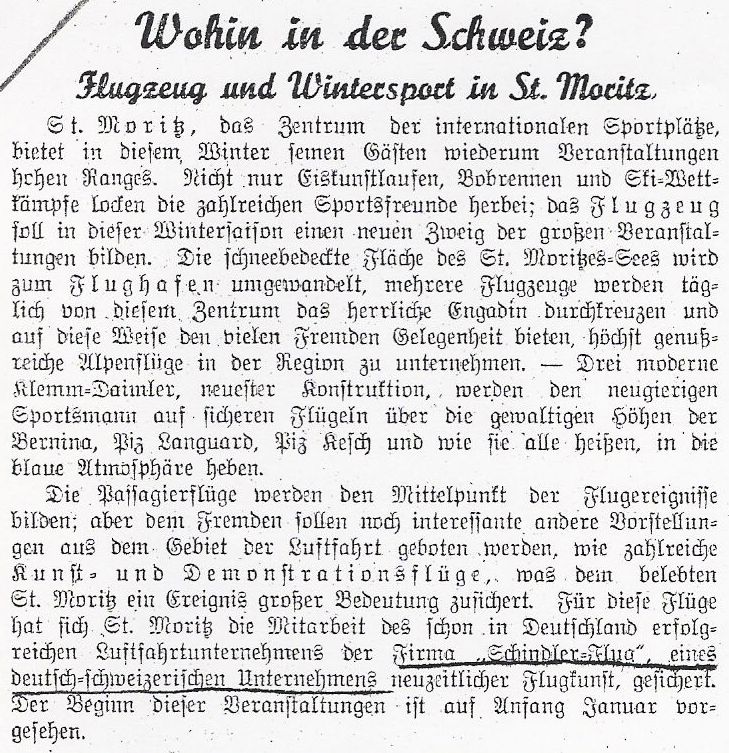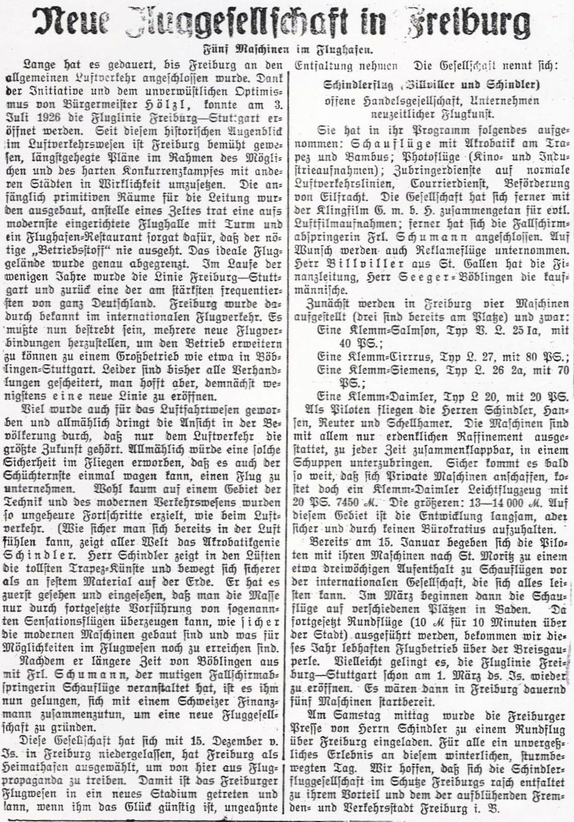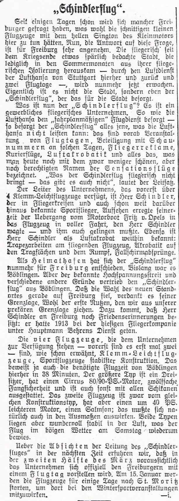 Freiburg setzte große Hoffnungen auf die Firma Schindlerflug, wie die folgenden Zeitungsberichte zeigen
