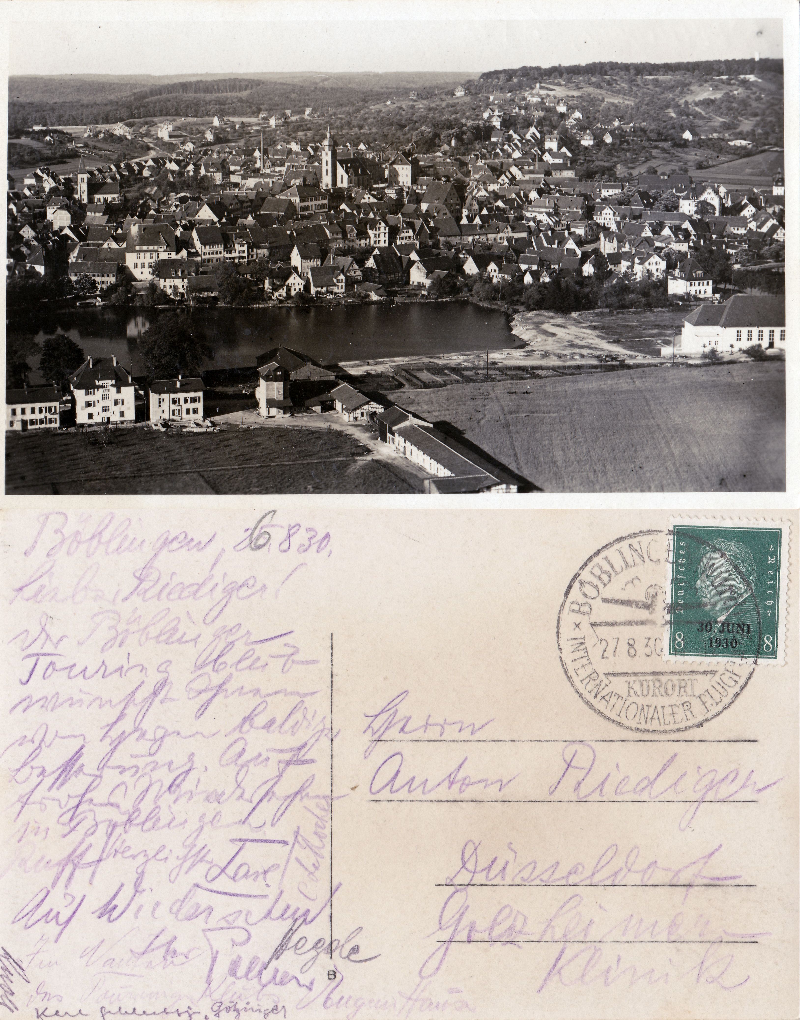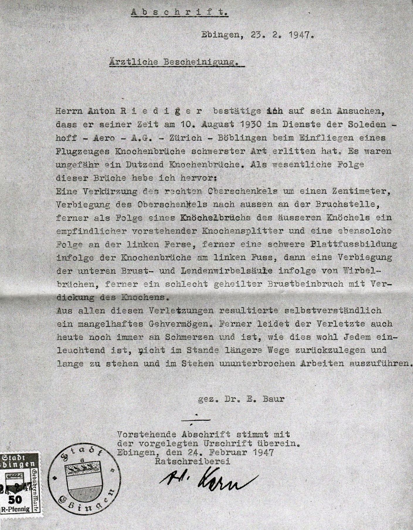 Am 26 August 1930 schickte ihm Hermann Palmer, Leiter des Böblinger Jugendfliegerkorps  Genesungswünsche an die Düsseldorfer Klinik. Besonders tragisch ist, daß auch der mit unterschriebene Gustav Engwer, Leiter Fliegerschule DLV Böblingen, 3 Wochen später am 18. September 1930,  beim Absturz von Fritz Schindler mit ums Leben kam.