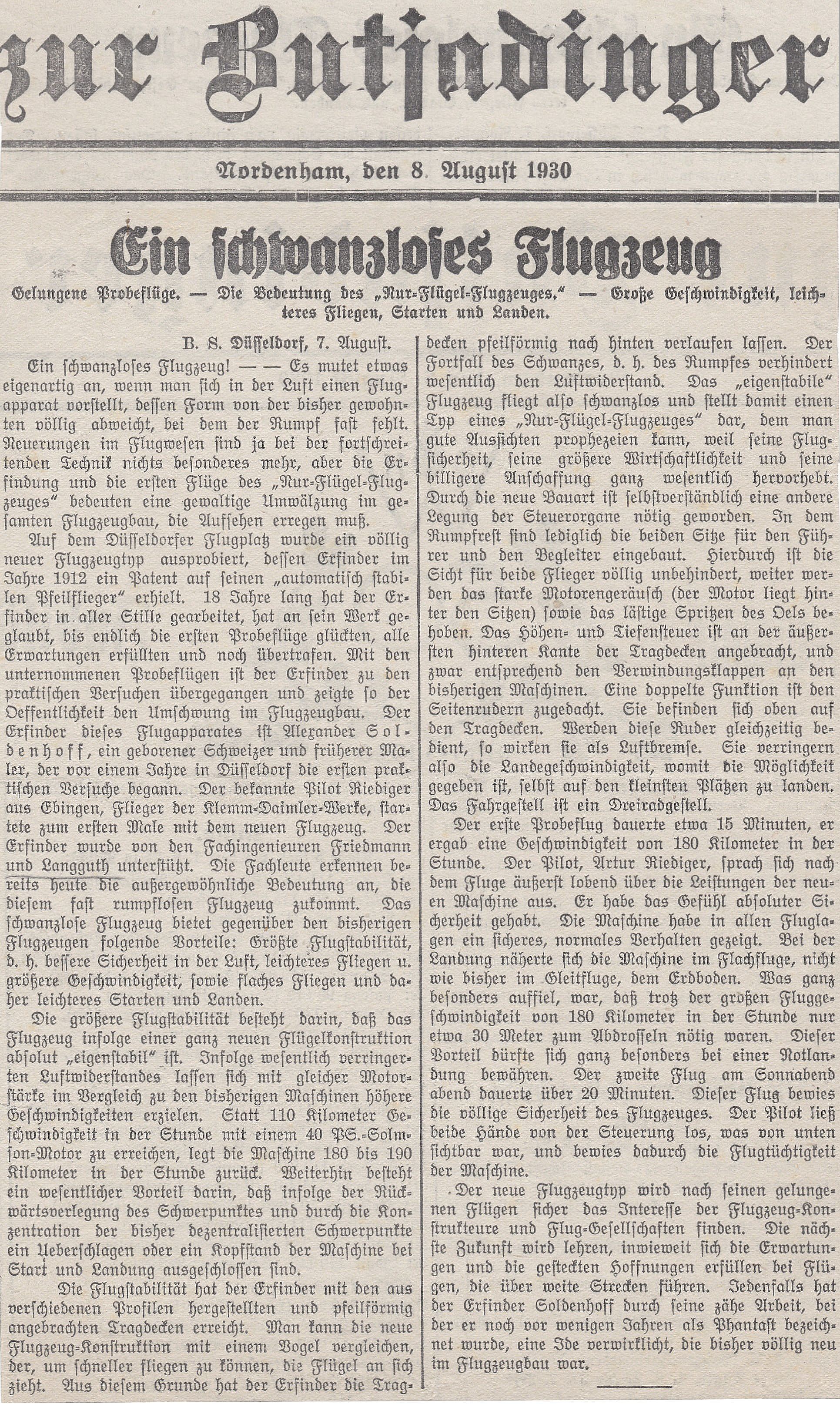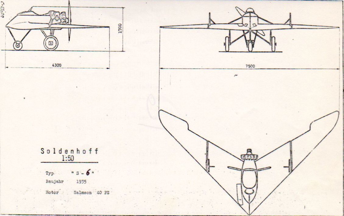 Dickflügelprojekt (Das Manuskript wurde uns freundlicherweise von Herrn Günther Frost zur Verfügung gestellt) Die Entwicklung des Dickflügel-Typs reicht zurück bis in das Jahr 1930. Im Mai 1930 erwähnte Soldenhoff das Projekt erstmals im Schriftwechsel. Die Entwurfs- und Kon- struktionsarbeiten kamen aber nur langsam voran, weil sie oft wegen dringender Pro- bleme unterbrochen werden mußten.  Zunächst war es der Termindruck bei der Fer- tigstellung der A/3, dann galt es, den Umzug von Düsseldorf nach Böblingen abzu- wickeln, und schließlich mußte die „flugunwillige“ A/4 endlich in die Luft gebracht werden. Zu allem Überfluß gab es während der Konstruktionsphase auch noch erhebliche Mei- nungsverschiedenheiten zwischen Soldenhoff, Langguth & Friedmann in technischen Detailfragen. So klagte A.Soldenhoff im September 1931, daß sein Dickflügel schon längst hätte fliegen können, wenn nicht ständig Verzögerungen durch das „dumme Geschwätz der Ingenieure“ eingetreten wären. Die ersten erhalten gebliebenen Zeichnungen der So. B datieren aus dem Mai 1931. Sie zeigen einen stark gepfeilten Zweisitzer (Flügelpfeilung 37o), in der Grundkonzeption ähnlich der A/5, jedoch weiterentwickelt zum Nurflügelflugzeug. Der Entwurf war mit 11 m Spannweite nur unwesentlich größer als die A/5. Seine Flügelfläche betrug 28,3 m2, d.h. A.Soldenhoff hatte nahezu eine Verdoppelung gegenüber der A/5 vorgenommen. Das Fluggewicht lag bei 580 kg und entsprach damit etwa dem Vorläufermodell. Die folgenden zwei Fotos zeigen Modelle im Windkanal der AVA Göttingen