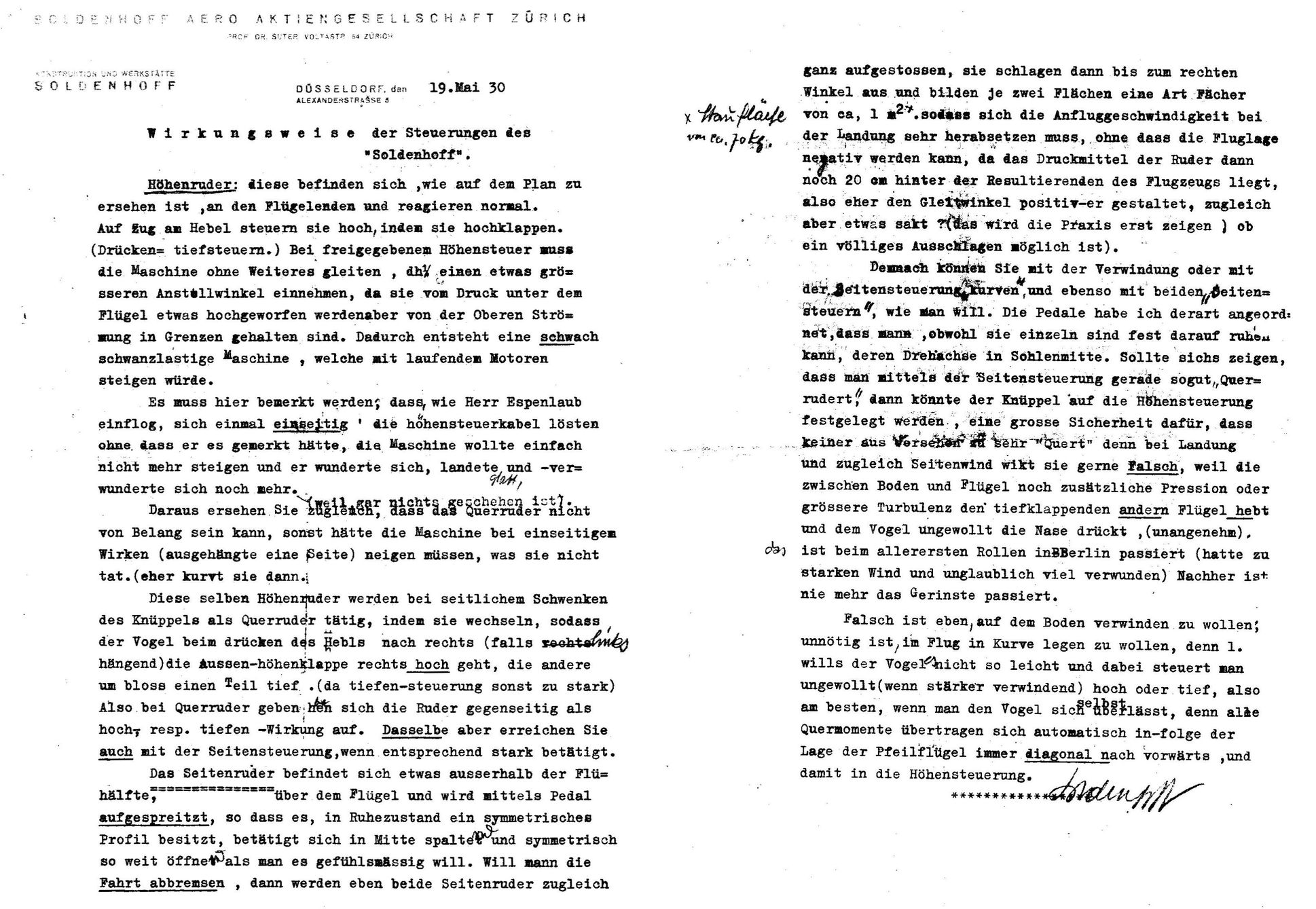 Am 24. Januar 1929 wurde A.Soldenhoff ein Patent „Steuerung für schwanzlose Pfeilflugzeuge573166 erteilt, das unter bzw. über dem Flügel angeordnete Steuerklappen für den Langsamflug vorsah. Sie sollten im ausgeschlagenen Zustand sowohl den Auftrieb vergrößern als auch den Strömungswiderstand erhöhen und konnten z.B. zur Verringerung der Landegeschwindigkeit dienen. Im Gegensatz zu den üblicherweise verwendeten rechteckigen Landeklappen nahm die Tiefe der Soldenhoff-Klappen nach außen hin ab, d.h. sie besaßen einen trapezförmigen bis nahezu dreieckigen Umriß. Mit dieser besonderen Formgebung wollte A.Soldenhoff erreichen, daß die Eigenstabilität des schwanzlosen Pfeilflugzeugs auch bei vollem Klappenausschlag in jeder möglichen Fluglage erhalten blieb.