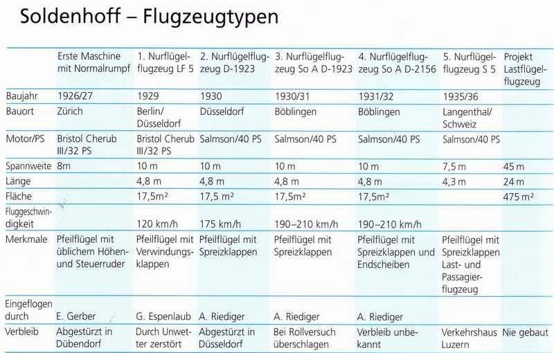Die folgenden Ausführungen zeigen seine Stationen als Flugzeugkonstrukteur. Die ersten Informationen darüber erhielten wir durch die Vermittlung der Soldenhoff-Familie von Herrn Günter Frost, einem anerkannten Journalisten über Lufthistorik.  Weitere umfangreiche Informationen erhielten wir von Heinz Riediger, dessen Vater Anton Riediger Einflieger bei A.Soldenhoff war und ein umfangreiches Soldenhoff-Archiv besitzt. Die Ausführungen werden ergänzt durch eigene Recherchen. Die Stationen waren wie folgt: