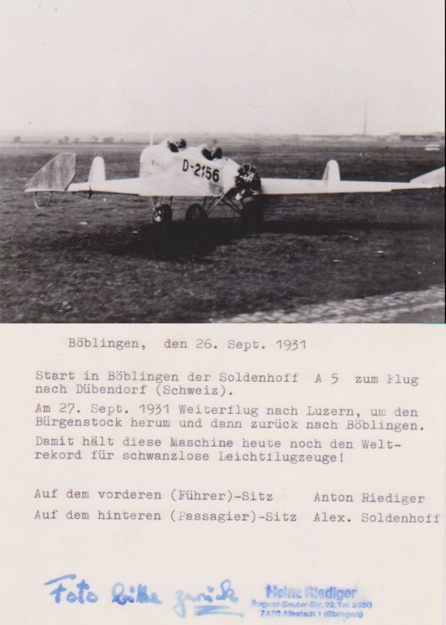 Am 26. September 1931 startete A.Riediger, mit A.Soldenhoff als Passagier, zu einem zweiten Flug nach Dübendorf. Am nächsten Tag ging die Reise weiter nach Luzern. Aber kurz bevor die D-2156 in Luzern eintraf, war Fritz Gerber (derselbe Pilot, der 1927 das erste Soldenhoff-Motorflugzeug in Dübendorf eingeflogen hatte) mit einem der teilnehmenden Flugzeuge abgestürzt. Und in der allgemeinen Aufregung ging die Ankunft der Soldenhoff-Maschine nahezu unter. Eine Landung wollte Riediger nicht riskieren, denn auf dem ohnehin recht schmalen Flugfeld drängte sich eine schaulustige Menschenmenge und es herrschte kräftiger Seitenwind. A.Riediger umkreiste mehrmals das Geschehen, flog dann auf den Vierwaldstätter See hinaus, rund um den Bürgenstock herum, kehrte zurück und nahm schließlich Kurs auf Böblingen. Die Rückreise verlief ohne Störungen. Mit diesem Flug Dübendorf – Luzern – Böblingen hielt A.Riediger lange Jahre den Streckenweltrekord für schwanzlose Leichtflugzeuge.