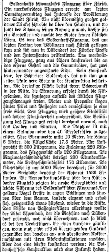 Im Jahre 1925 wurde A.Soldenhoff ein Patent „Flugzeugflügel, auf dessen Unterseite sich eine oder mehrer Stufen befinden“ (Stufenflügler) DE479449 erteilt. Noch im Dezember 1925 stellte er ein „Kleinflugzeug für Jedermann“ der Öffentlichkeit vor. Im Frühjahr 1926 begann A.Soldenhoff in seinem Zürcher Atelier (in der Mühlebachstr.) mit dem Bau seines ersten Motorflugzeugs. Die Maschine trug schlicht die Bezeichnung „Versuchsapparat I“. Zum Antrieb diente ein luftgekühlter Zweizylinder-Boxer- motor Typ Bristol „Cherub III“ (Leistung 32/36 PS). Er war im Rumpfbug untergebracht und arbeitete auf einen zweiflügligen Zugpropeller.