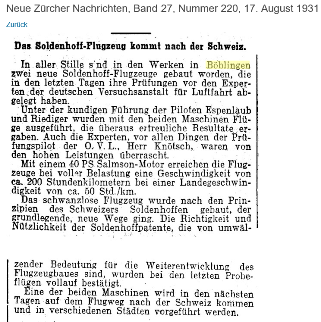 Der Flug wurde u.a. auch im Sozialdemokratischen Pressedienst vom 21. August 1931 wie folgt gewürdigt: „Mit dem auf dem Stuttgarter Flughafen Böblingen konstruierten schwanzlosen Soldhoff-Flugzeug führte der Flieger Espenlaub einen Überlandflug von Stuttgart nach Züroich durch, der trotz ungünstoger Witterung bei einer Durchschnittsgechwindigkeit vom Stunden Kilometern in hervorragender Weise glückte. Die Maximalgeschwindigkeit der mit einem 40 PS-Motor ausgerüsteten Maschine beträgt 200 Stundenkilometer„,  Am Nachmittag des 22. August 1931 führte der inzwischen per Bahn eingetroffene Riediger die A/5 Pressevertretern, Fachleuten und Interessenten auf dem Dübendorfer Flugplatz vor. Der ebenfalls anwesende A.Soldenhoff hielt mehrere Referate über seine Konzeption und Prof. Suter führte verschiedene Gespräche mit potentiellen Geldgebern. Am 23. August 1931 wechselten sich A.Riediger, G.Espenlaub und Knoetzsch am Steuer ab. Am 24. August 1931 fanden nochmals Demonstrationsflüge vor Behörden- und Pressevertretern statt.