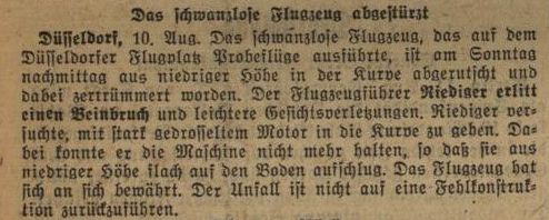 Als Gottlob Espenlaub, der die Aufgabe des Einfliegers übernommen hatte, nach einem kurzen Luftsprung wegen mangelhafter Ruderwirkung wieder aufsetzte, brach das Bugrad weg. Rumpfunterseite und Flügelwurzel trugen bei der anschließenden Rutschpartie erhebliche Schäden davon, während G.Espenlaub zum Glück keine ernsthaften Blessuren erlitt.