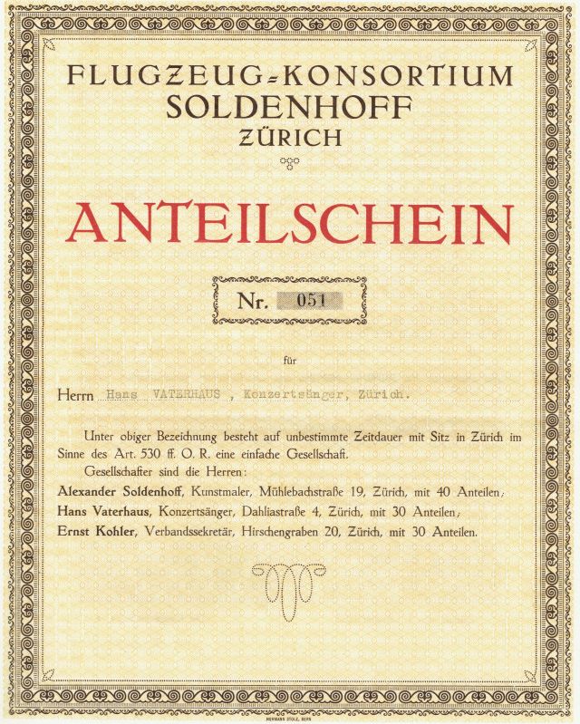 Zur Finanzierung seiner flugtechnischen Aktivitäten wurde eine einfach Gesellschaft gegründet und Anteilscheine ausgegeben