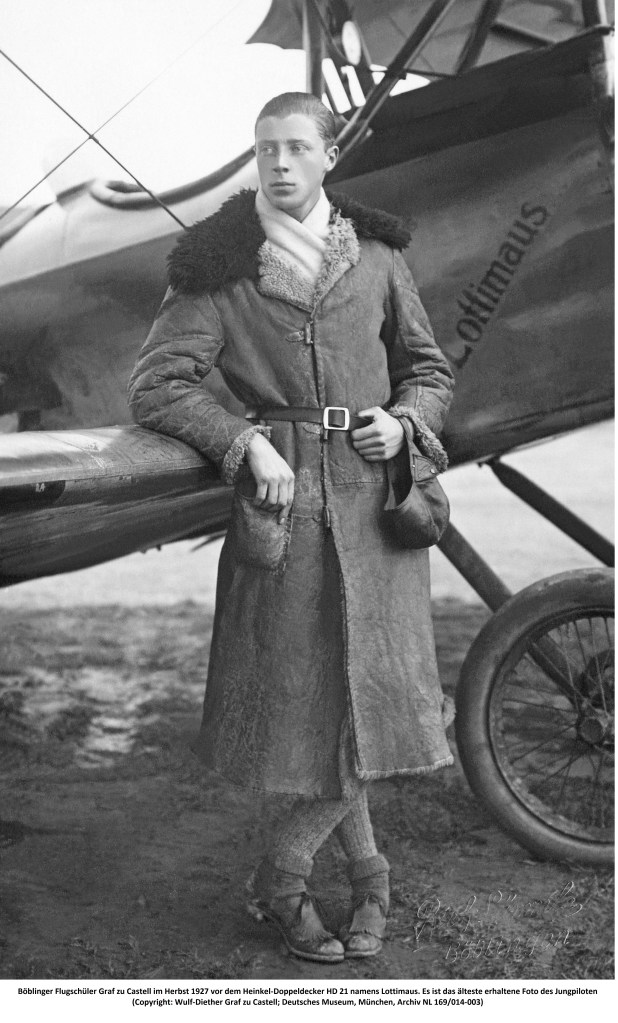 Das obige Foto ist aus einem Album (jetzt im Stadtarchiv Böblingen) des ehemaligen Flugschülers Fritz Schüttler. Durch das vorhandene Flugbuch konnten wir in etwa die genaue Zeitperiode bestimmen und so auch ein wenig zur Lebensgeschichte des Grafen beitragen. Das Kennzeichen der „Lottimaus“ konnten wir lange Zeit nicht ermitteln. Klarheit brachte erst ein Foto einer Heinkel HD21 D-685 von Günter Frost (Arbeitsgemeinschaft Deutsche Flughistorik), auf dem noch ganz schwach „Lottimaus“ zu erkennen ist. Von der Sportflug G.m.b.H. Hannover kam die Maschine spätesten Januar 1926 zur „Süddeutsche Sportflug GmbH, Böblingen“, wo Castell im Herbst 1927 vor der Lottimaus posierte, das erste Foto des Grafen als jungen Flieger.