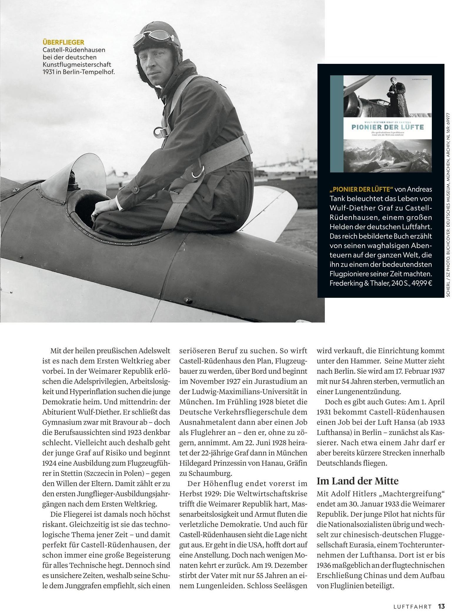 Fliegerische Kurzbiografie: Im Frühjahr 1926 nahm Castell in Stettin seinen ersten Flugunterricht und erwarb den A2-Schein. Im Herbst 1927 zeigt den Grafen mit Mitgliedern der Fliegerschule Böblingen auf dem Württembergischen Landesflughafen Stuttgart-Böblingen. Neben seinem Jurastudium an der Ludwig-Maximilians-Universität München unterrichtete er an der Deutschen Verkehrsfliegerschule in Schleißheim. Mit 25 Jahren wurde Castell Flugzeugführer bei der Deutschen Lufthansa und war von 1933 bis 1936 beauftragt, in China mit der Lufthansa-Tochtergesellschaft »EURASIA« ein durchgehendes Flugverkehrsnetz aufzubauen. Castell flog mit einer einmotorigen Junkers-Maschine, der W 33, später mit der dreimotorigen Junkers Ju52. 1937 war er mit v. Gösel an der Suchaktion beteiligt (D-ANOY bezwingt den Pamir – Gablenz *).