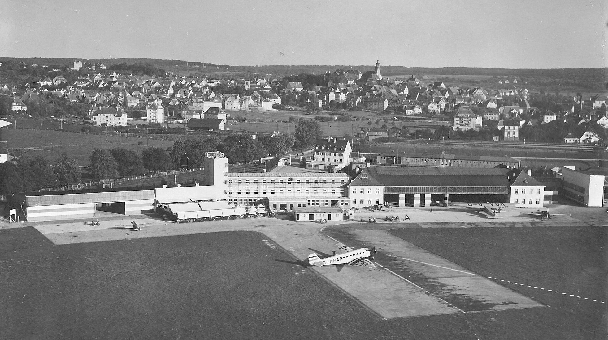 Schon bald hatte sich der Luftverkehr in Württemberg so gesteigert, dass sich der Aufsichtsrat entschloss, gemäß dem Antrag des Vorstandes, auf dem eigenen Grundstück der Gesellschaft für den Abfertigungsdienst ein neues Gebäude zu erstellen, nachdem alle Erwägungen, durch An- und Umbauten ein erweitertes Provisorium zu schaffen, im Hinblick auf die weitere Entwicklung verworfen werden mussten. Eingereichte Planungsunterlagen lagen von den Architekturbüros Bregler & Barthle und Döcker, beide Stuttgart vor, wobei man sich für Bregler & Barthle entschied. Die Arbeiten wurden nach den im Frühjahr 1927 von dem Baubüro der Gesellschaft fertiggestellten Bauplänen im Benehmen mit dem städtischen Hochbauamt Stuttgart (Architekt Mäckle BdA) und der staatlichen Bauberatungsstelle (Prof. Keuerleber) ausgeführt. Das Gebäude wurde direkt an das bestehende angebaut. Der schlechte Untergrund verteuerte die nach den Berechnungen von Prof. Kintzinger Stuttgart ausgeführte Fundamentherstellung. Das Böblinger Baugeschäft Wilhelm Kopp wurde mit dem Bau beauftragt.