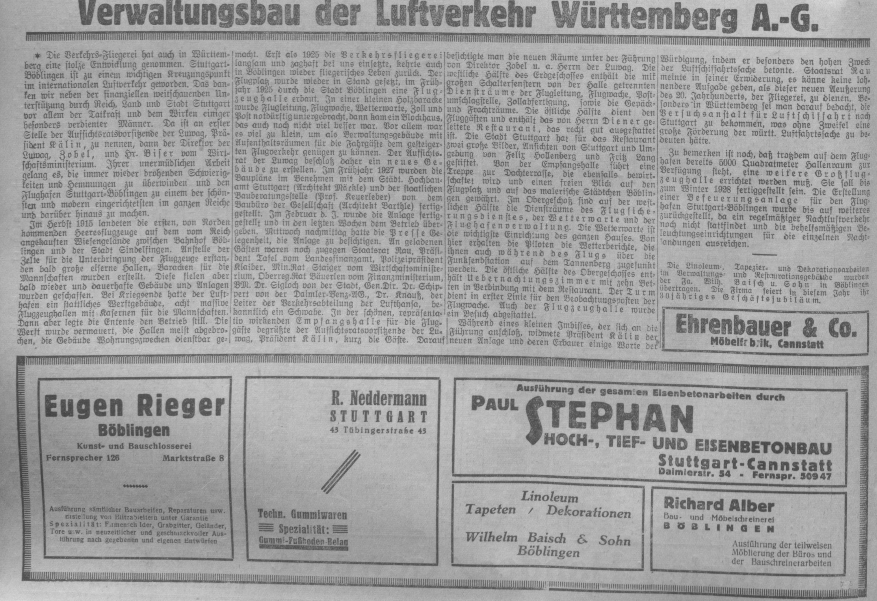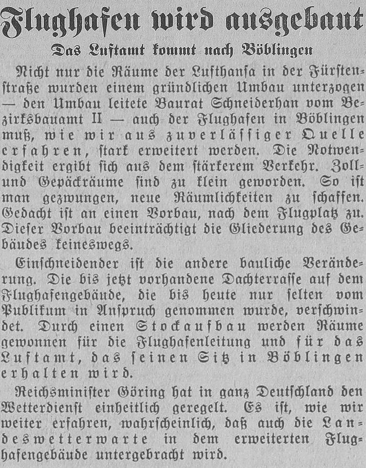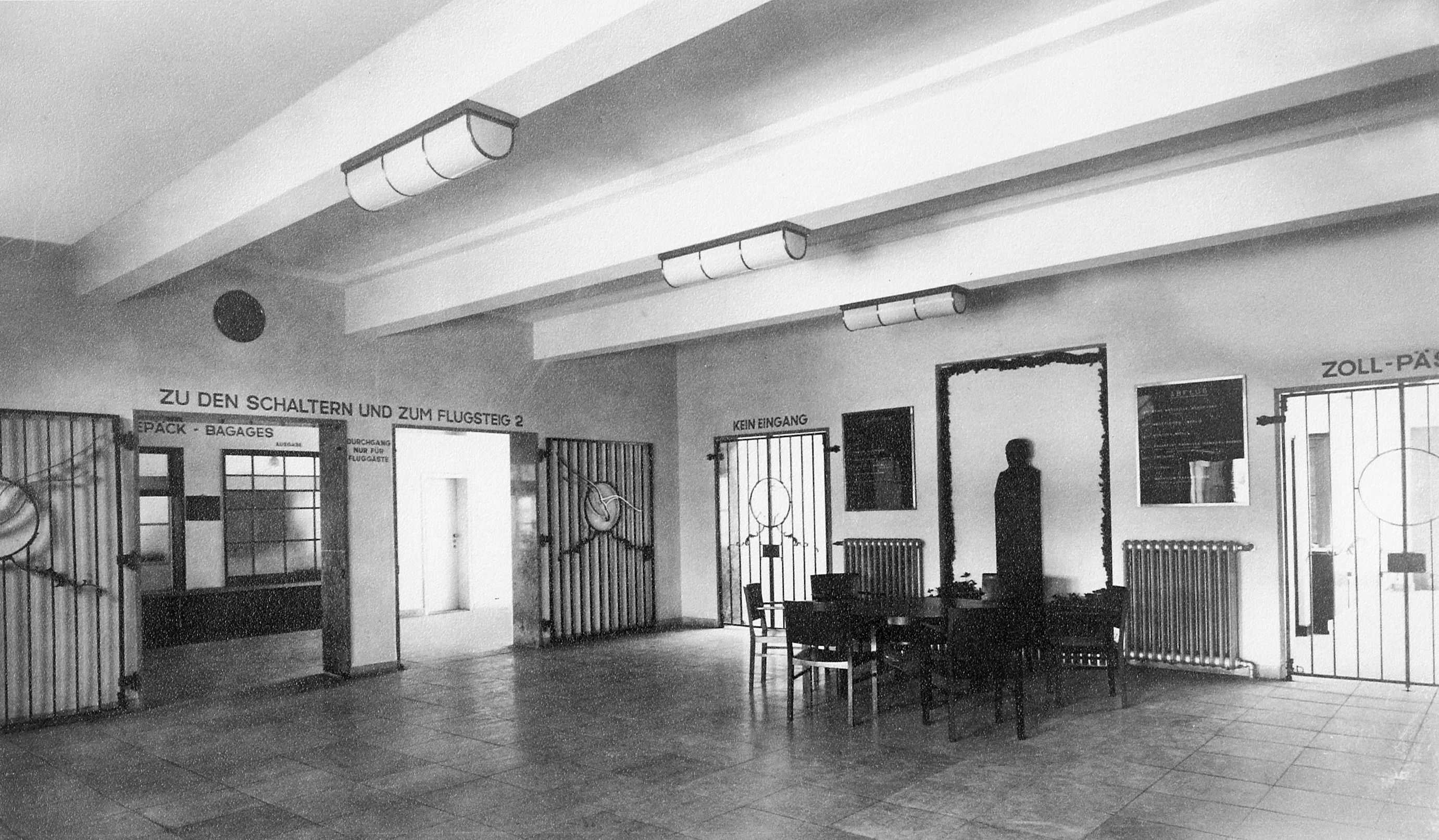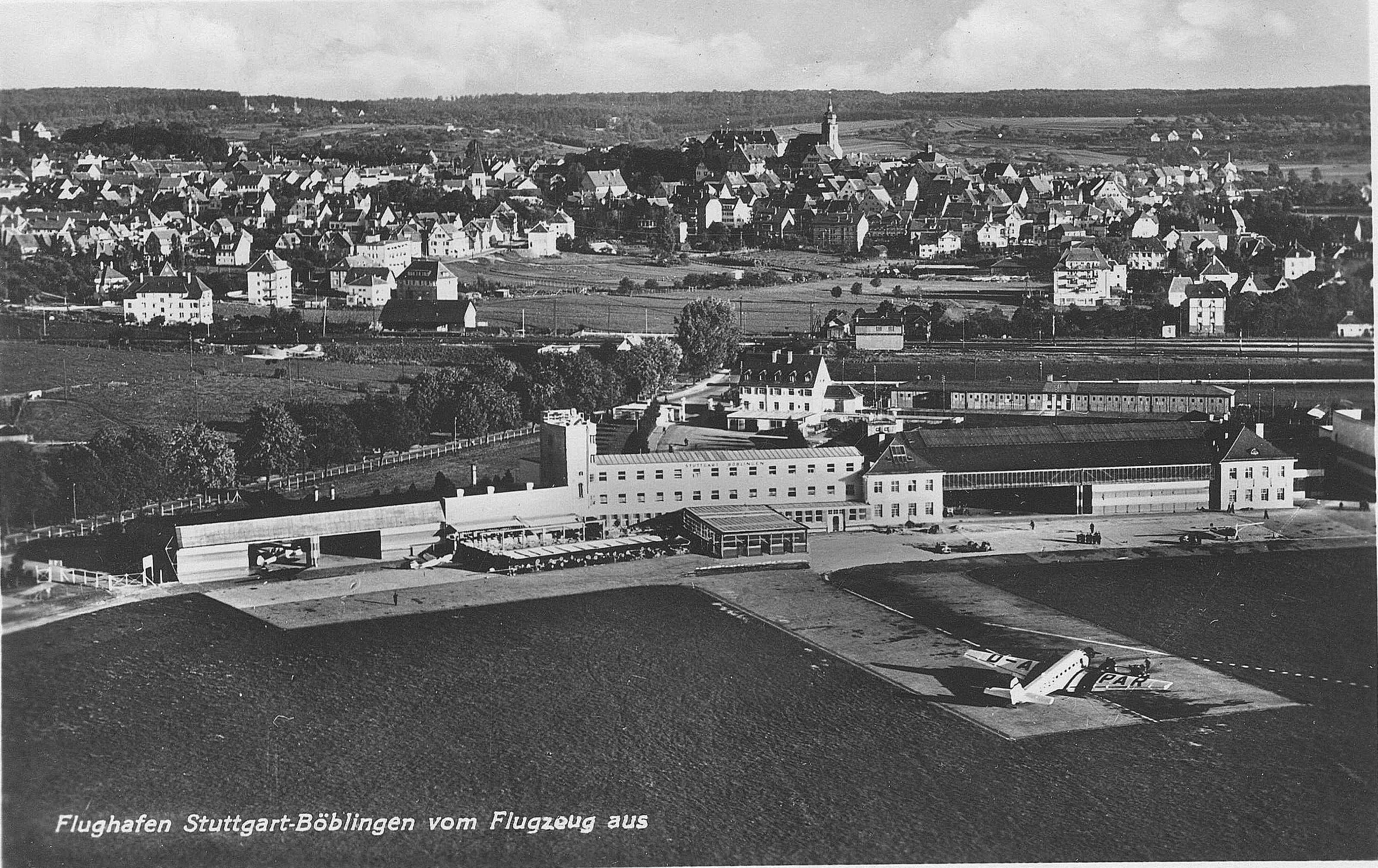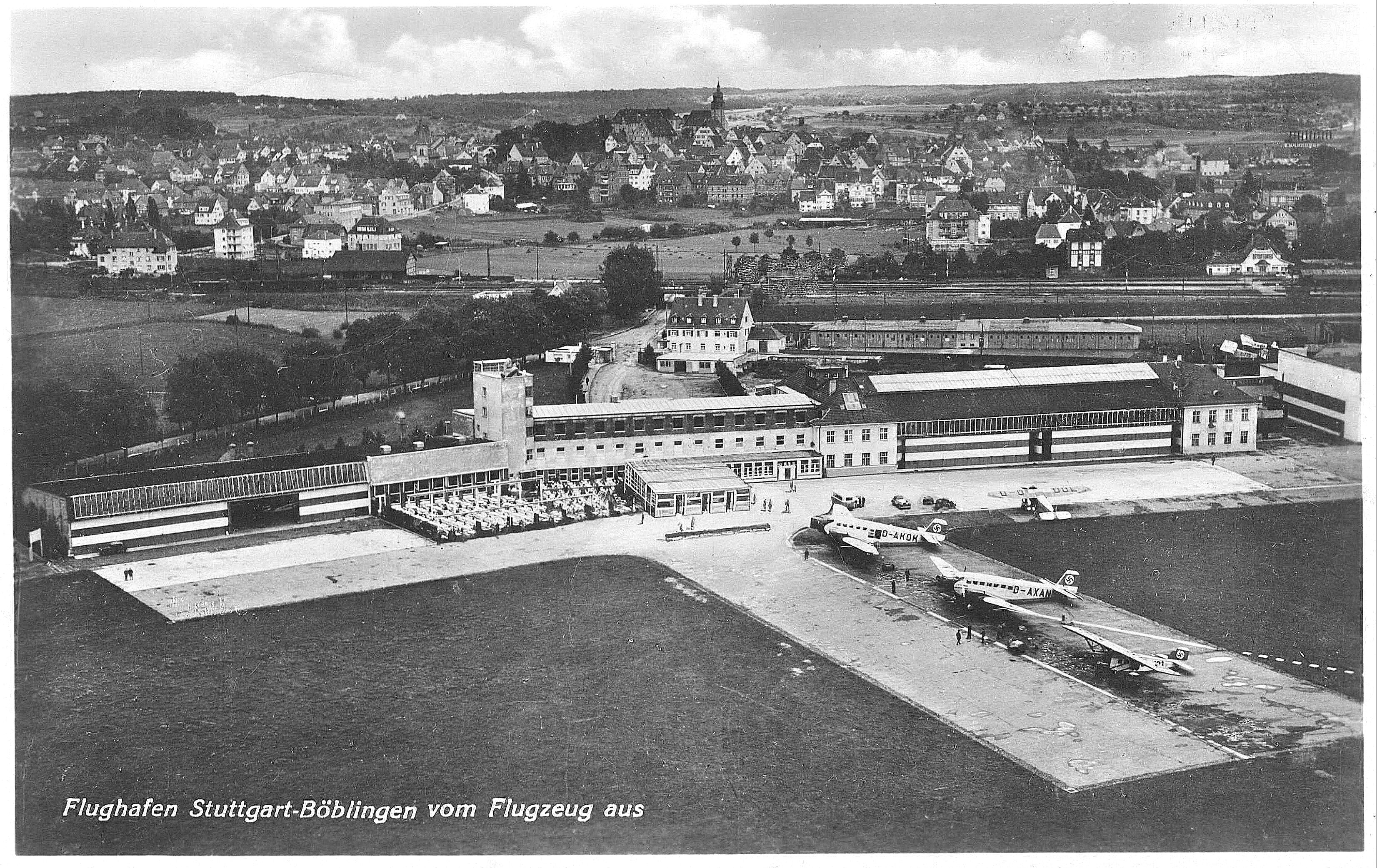 Im Mittelteil des EG befindet sich die repräsentativ wirkende Empfangshalle für die Fluggäste. Die westliche Hälfte enthält die mit großen Schalterfenstern von der Halle getrennten Diensträume der Flugleitung, Flugwache, Postumschlagstelle, Zollabfertigung, sowie die Gepäck- und Frachträume. Eine 2 m breite Durchfahrt in diesem Teil ermöglicht den Verkehr mit Rollwagen zu den Flugzeugen. Die östliche Hälfte dient den Fluggästen und enthält das Restaurant und die Toiletten mit Bad. Von der Empfangshalle führt eine Treppe zur Dachterrasse, welche ebenfalls bewirtschaftet wird und einen freien Blick auf den Flugplatz und auf das malerische Städtchen Böblingen gewährt. Im OG sind auf der westlichen Hälfte die Diensträume des Flugsicherungsdienstes, der Wetterwarte und der Flughafenverwaltung, durch eine besondere Treppe mit den Diensträumen im EG verbunden, untergebracht, während die östliche Hälfte Übernachtungszimmer mit 10 Betten in Verbindung mit dem Restaurant enthält. Der Turm dient in erster Linie für den Beobachtungsposten der Flugwache. Im UG sind Lagerräume, die Heizungsanlage, die Kühl- und Kellerräume für den Wirtschaftsbetrieb, sowie in Verbindung mit dem Restaurant eine Kellerwirtschaft als Kantine vorhanden. Die gärtnerischen Anlagen des durch ein Pförtnerhäuschen mit Tor abgeschlossenen Vorplatzes wurden von der städtischen Gartenbauinspektion Stuttgart (Gartenbaudirektor Ehmann) ausgeführt. Um den durchreisenden Fluggästen auf dem Flughafen Stuttgart-Böblingen die schwäbische Landeshauptstadt wenigstens im Bild zu zeigen, hat die Stadt Stuttgart in dankenswerter Weise für das Restaurant je ein Ölgemälde der beiden hervorragenden Stuttgart Kunstmaler Felix Hollenburg und Fritz Lang gestiftet. Die Diensträume im neuen Gebäude konnten Anfang Februar 1928 in Betrieb genommen werden, während der Wirtschafts- und Hotelbetrieb zu Beginn des Sommerluftverkehrs 1928 eröffnet wird.