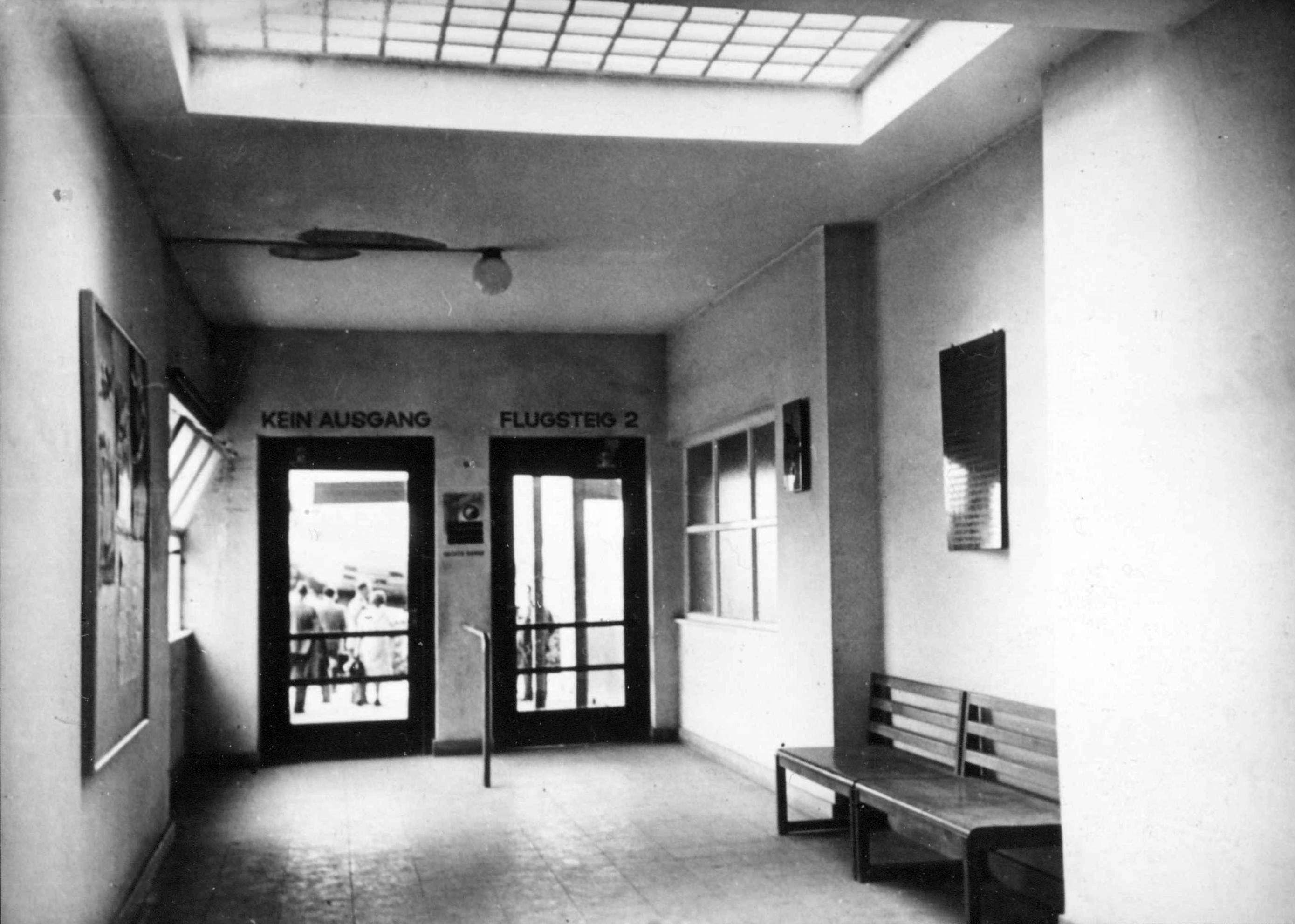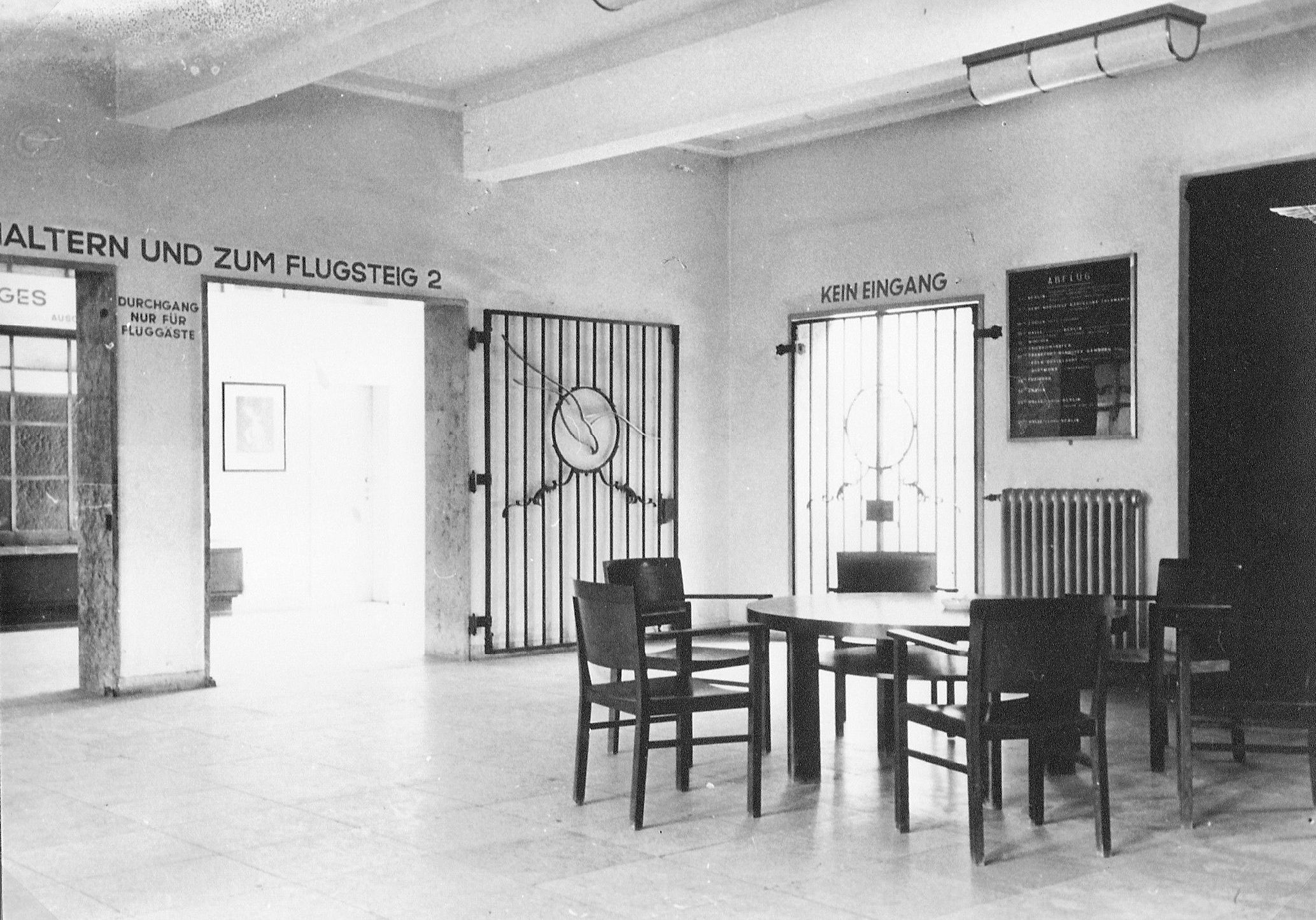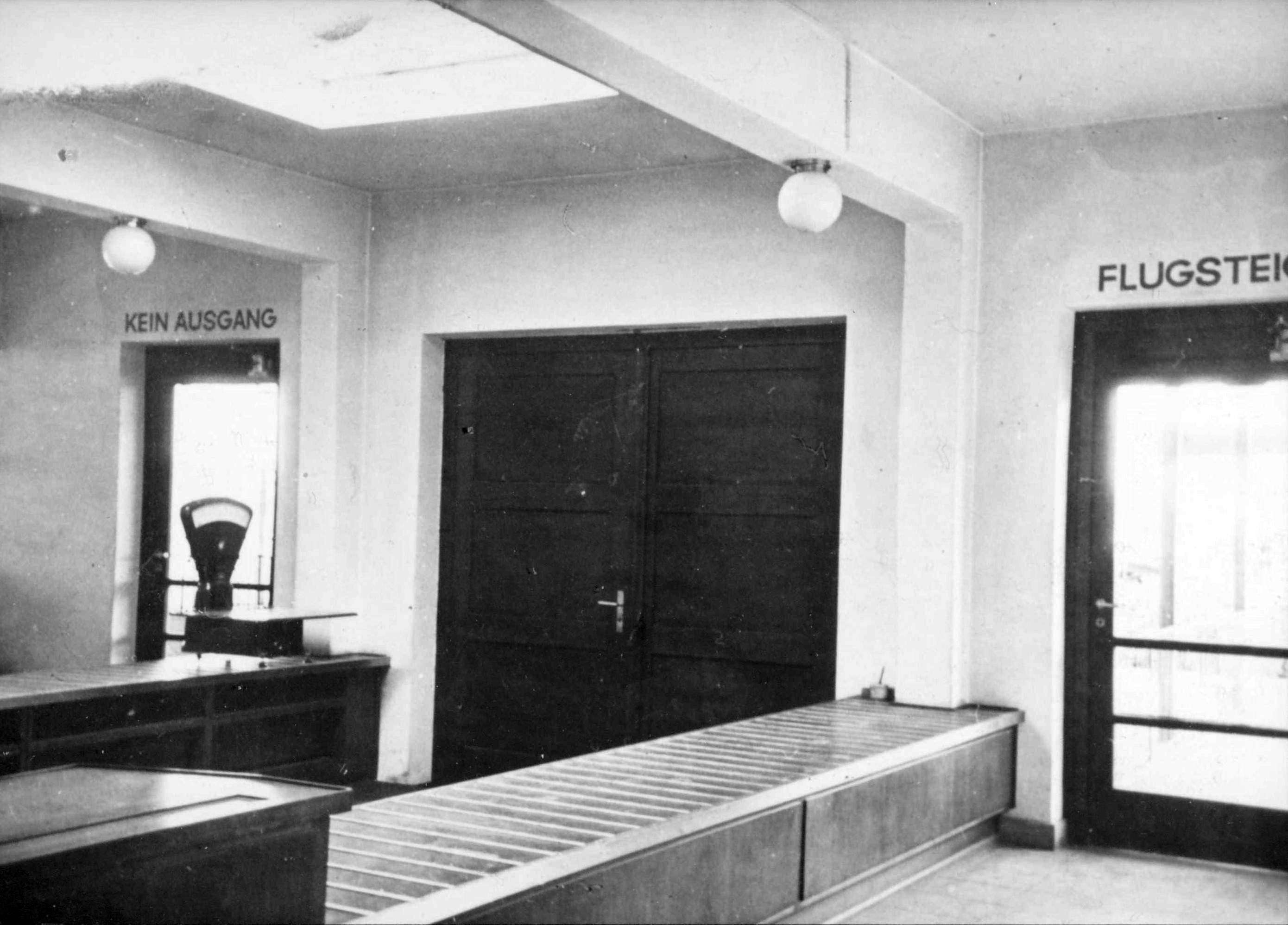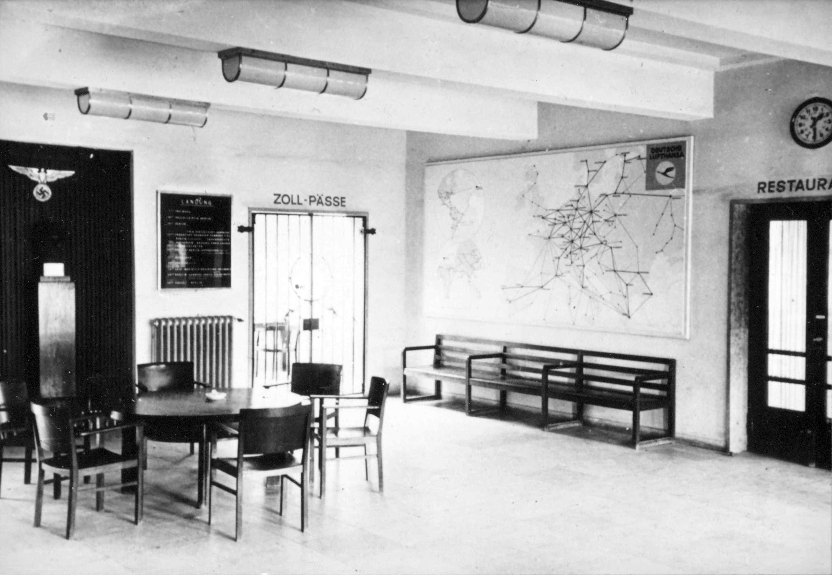 Im Mittelteil des EG befindet sich die repräsentativ wirkende Empfangshalle für die Fluggäste. Die westliche Hälfte enthält die mit großen Schalterfenstern von der Halle getrennten Diensträume der Flugleitung, Flugwache, Postumschlagstelle, Zollabfertigung, sowie die Gepäck- und Frachträume. Eine 2 m breite Durchfahrt in diesem Teil ermöglicht den Verkehr mit Rollwagen zu den Flugzeugen. Die östliche Hälfte dient den Fluggästen und enthält das Restaurant und die Toiletten mit Bad. Von der Empfangshalle führt eine Treppe zur Dachterrasse, welche ebenfalls bewirtschaftet wird und einen freien Blick auf den Flugplatz und auf das malerische Städtchen Böblingen gewährt. Im OG sind auf der westlichen Hälfte die Diensträume des Flugsicherungsdienstes, der Wetterwarte und der Flughafenverwaltung, durch eine besondere Treppe mit den Diensträumen im EG verbunden, untergebracht, während die östliche Hälfte Übernachtungszimmer mit 10 Betten in Verbindung mit dem Restaurant enthält. Der Turm dient in erster Linie für den Beobachtungsposten der Flugwache. Im UG sind Lagerräume, die Heizungsanlage, die Kühl- und Kellerräume für den Wirtschaftsbetrieb, sowie in Verbindung mit dem Restaurant eine Kellerwirtschaft als Kantine vorhanden. Die gärtnerischen Anlagen des durch ein Pförtnerhäuschen mit Tor abgeschlossenen Vorplatzes wurden von der städtischen Gartenbauinspektion Stuttgart (Gartenbaudirektor Ehmann) ausgeführt. Um den durchreisenden Fluggästen auf dem Flughafen Stuttgart-Böblingen die schwäbische Landeshauptstadt wenigstens im Bild zu zeigen, hat die Stadt Stuttgart in dankenswerter Weise für das Restaurant je ein Ölgemälde der beiden hervorragenden Stuttgart Kunstmaler Felix Hollenburg und Fritz Lang gestiftet. Die Diensträume im neuen Gebäude konnten Anfang Februar 1928 in Betrieb genommen werden, während der Wirtschafts- und Hotelbetrieb zu Beginn des Sommerluftverkehrs 1928 eröffnet wird.