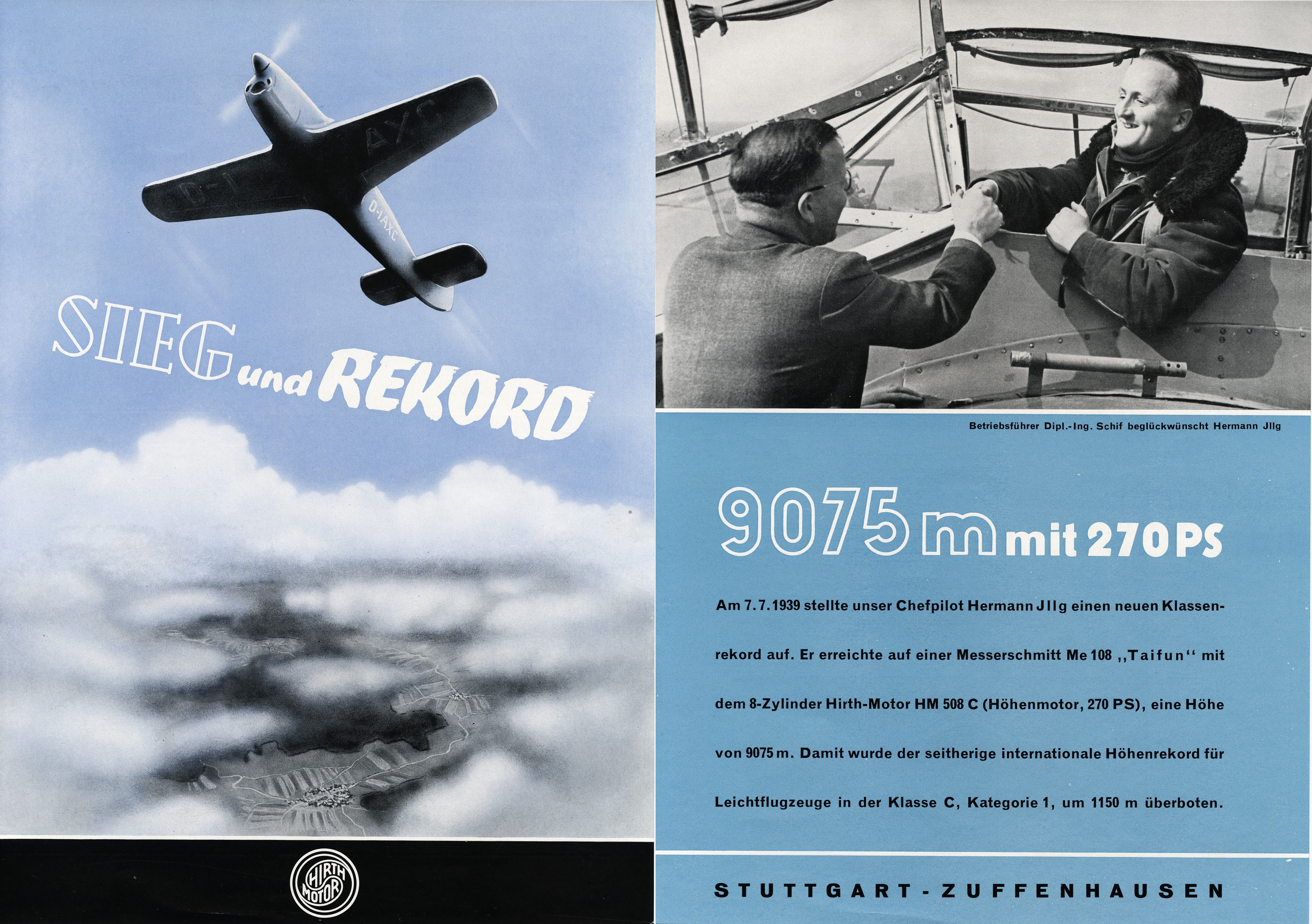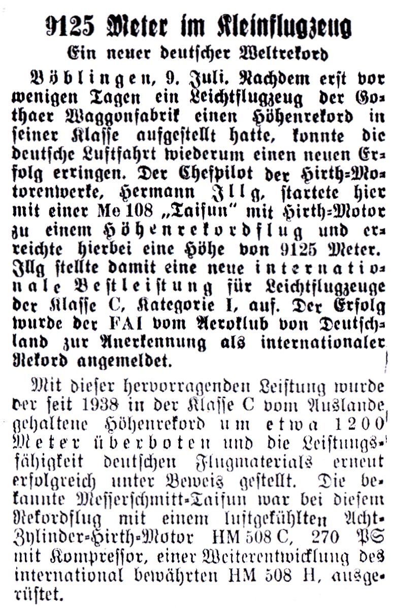 Am 7. Juli 1939 um 14.50 Uhr startete Hermann Illg, Leiter Abteilung Werkflugzeuge der Firma Hirth, vom Flughafen Stuttgart-Böblingen aus mit einer Messerschmitt „Taifun“ Me 108 (Hirth-Motor HM 508 C) , um einen neuen internationalen Höhenrekord für Leicht-flugzeuge der Klasse C, Kategorie I, in Angriff zu nehmen. Kurz nach 16.00 Uhr landete die Taifun wieder auf dem Flugplatz. Ein neuer Weltrekord war aufgestellt 9.075 m. Damit wurde der bestehende Weltrekord in der Klasse C vom Ausland um fast 1.200 m überboten. In den ersten Presseberichten und im Internet tauchen noch die Höhenangaben 9025 m und 9125 m auf, die aber falsch sind. Ein Beispiel aus der Sindelfinger Zeitung vom 10.07.1939