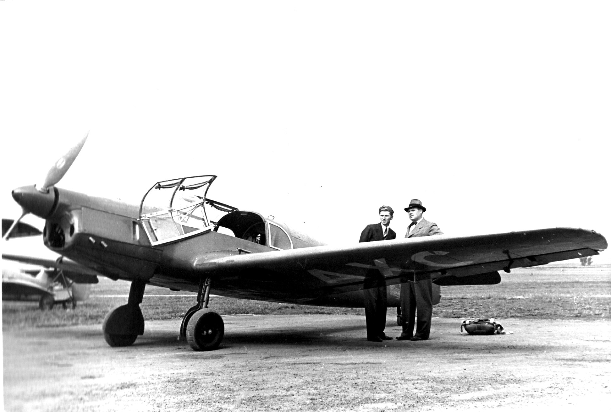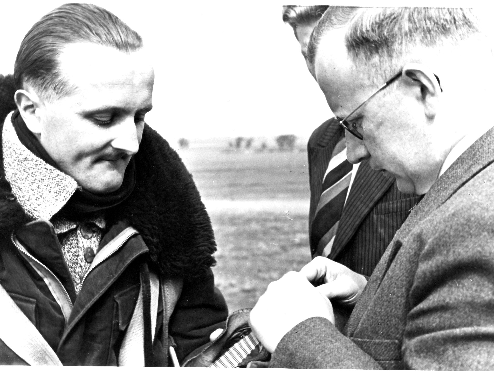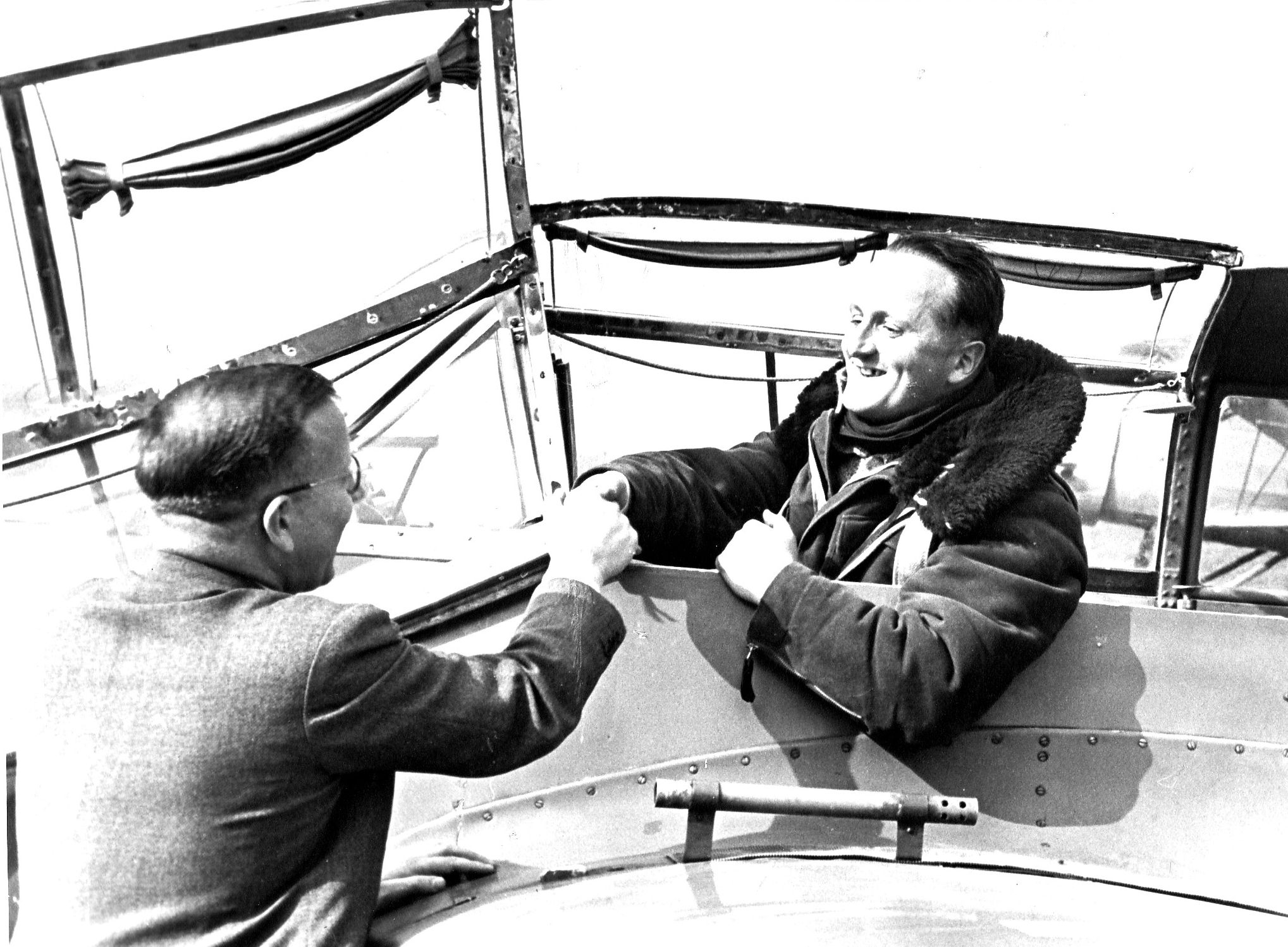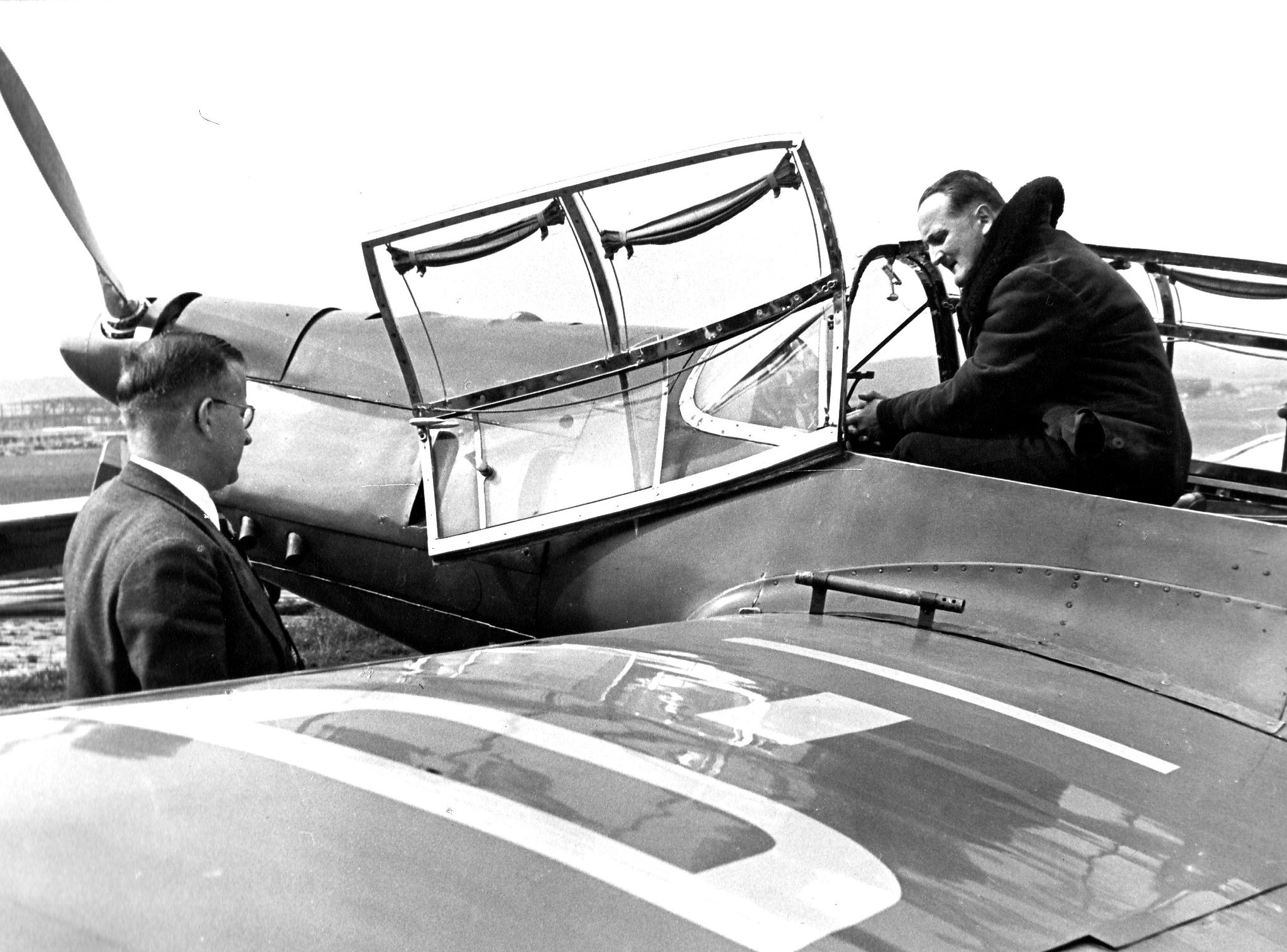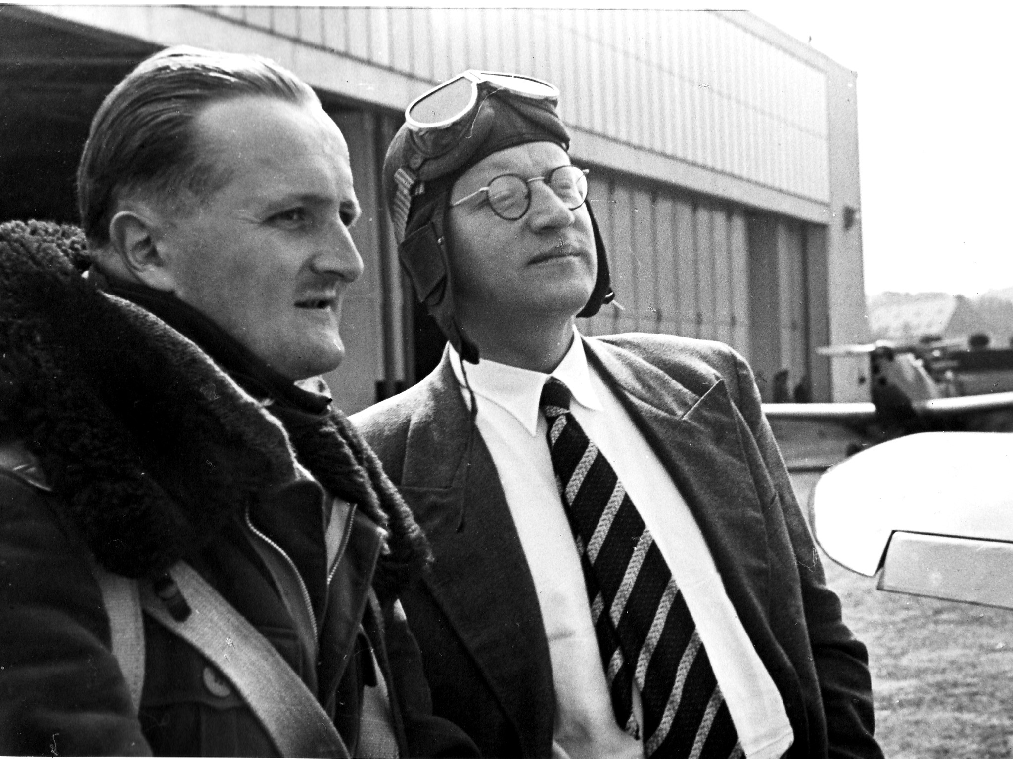 Nach dem Flug besichtigt Betriebsleiter Schif mit Herrn Sostmann (Vater von Hans-Jürgen Sostmann, AG Böblinger Flughafengeschichten) die Weltrekordmaschine