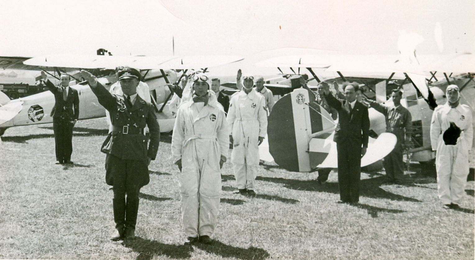 Zum Abschied der Italiener waren am Mittwochmittag auf dem Böblinger Flugplatz zahlreiche Ehrengäste erschienen. man sah u.a. Reichsstatthalter Murr, Ministerpräsidenten Mergenthaler, den Präsidenten des Luftamtes München, Ebert, als Vertreter des Heizluftfahrtministers Göring, ferner alles was in der württembergischen Fliegerei einen Namen hat. Die Landesgruppe Württemberg des Deutschen Luftsportverbandes war mit mehreren Ortsgruppen und einem Musikzug unter Führung von Landesgruppenführer Dr. Sommer aufmarschiert. Schon die Flaggenhissung der italienischen und deutschen Fahnen gestaltete sich außerordentlich feierlich. Um die Mittagsstunde erschienen sodann die italienischen Gäste in Begleitung des italienischen Konsuls und des Luftattachés der italienischen Botschaft in Berlin. Der Führer des italienischen Geschwaders, Oberst Barberino, schritt in Begleitung des Präsidenten des Luftamtes München die Front der uniformierten Flieger der Landesgruppe ab. Präsident Ebert übermittelte sodann den italienischen Gästen nochmals die Grüße des Reichsluftfahrtministers und dankte den Italienern, dass sie die Einladung der Reichsregierung angenommen haben. Er wünschte den Italienern auf ihrem Weiterflug viel Glück. Der Kommandeur des italienischen Geschwaders sprach auf italienisch, das später von dem italienischen Konsul verdolmetscht wurde, den Dank für den überaus herzlichen Empfang in Deutschland aus. Die italienischen Flieger würden besten Eindruck von ihrem Aufenthalt mit nach Hause nehmen. Sie bedauerten lebhaft, dass sie das reizende Schwabenland und ihre Hauptstadt nicht näher kennen lernen. Sie hätten sich aber schon auf ihrem Fluge üer Württemberg von den Schönheiten des Landes überzeugt. Der italienische Konsul fügte anschliessend noch seinen Dank des italienischen Volkes für die herzliche Aufnahme der Flieger. Inzwischen waren die Angehörigen des Geschwaders ganz in weißen Anzügen vor den Flaggenmasten angetreten, wo sie ein dreifaches „Eiah, Eiah, Eiah“ auf die deutschen Fliegerkameraden ausbrachten. Dann rollte das Geschwader zum Start, der in drei Abteilungen erfolgte. Noch einmal exerzierten die Italiener vor ihrem Abflug so exact in Geschwaderform, dass man bewundernd über diese Diziplin der Fliegerstaffel den italienischen Fliegern nachschaute.