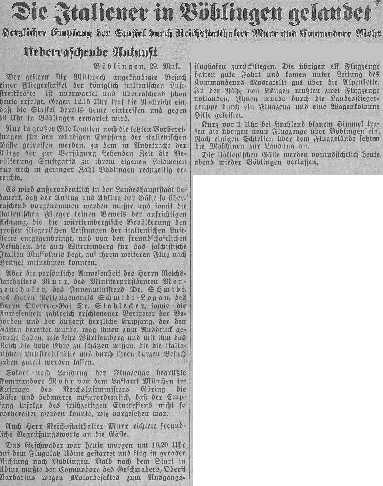 In der Badischen Presse vom 31.5.1934 kam ein ausführlicher Bericht über den Besuch, der im Stil der damaligen Zeit stark idioloisch geprägt war Italienischer Fliegerbesuch Empfang des italienischen Fliegergeschwaders in Böblingen/Begrüßung durch Karlsruher Sportflieger-Geschwader (Von unserem nach Böblingen entsandten Sonderberichterstatter)
