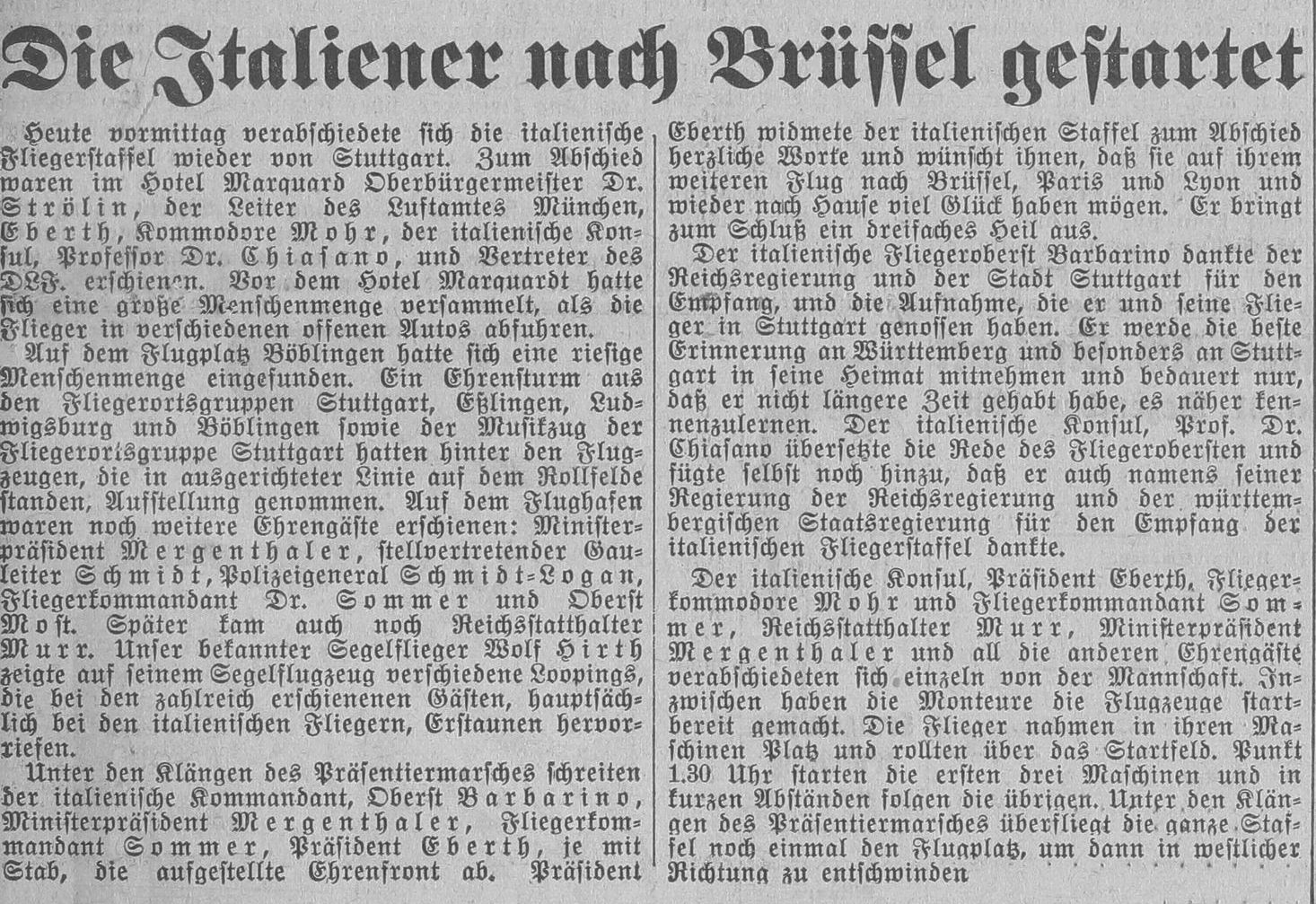 Ein italienisches Fliegergeschwader hat auf Einladung der Reichsregierung auf dem Fluge von Italien nach Brüssel einen kurzen Aufenthalt in Stuttgart genommen, wo die italienischen Flieger herzlich empfangen wurden. Am Mittwochnachmittag um 1/2 Uhr ist das italienische Geschwader von elf Flugzeugen in Böblingen zum Fluge nach Brüssel gestartet. Die italienischen Flieger überflogen Karlsruhe um 1.45 Uhr mittags, um dann den Rhein entlang nach Brüssel zu gelangen. Ein Mitglied der Schriftleitung der Badischen Presse war bei dem Empfang der Italiener in Böblingen und gibt darüber folgendes Stimmungsbild: