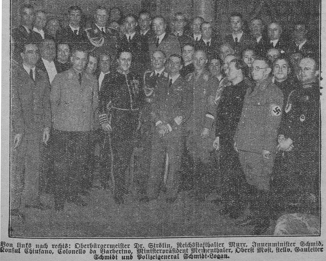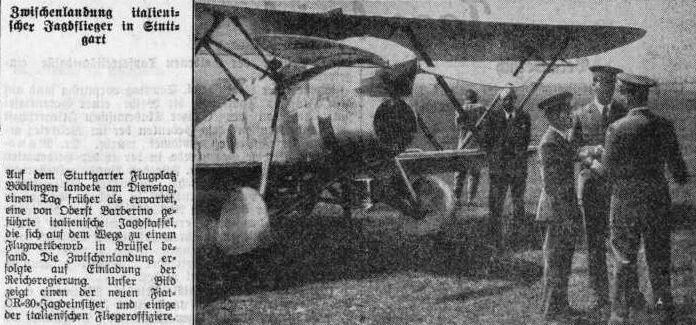 In Vertretung des Reichsluftfahrtministers Göring kündigte der Präsident des Luftamtes München Eberth am 27. Mai 1934 für den 30. Mai 1934 eine italienische Militärfliegerstaffel auf dem Wege Undine-Brüssel mit Station in Stuttgart als Gäste der Landesregierung an. Er hatte bereits vom Flotten-Kommodore Mohr „bestimmte Weisungen“ für die Empfangsvorbereitungen erhalten… denn dieses Unternehmen war nicht „ohne“, denn in einem Schreiben hieß es: Nach fernmündlicher Mitteilung von Oberleutnant Druffner werden die italienischen Flieger, wenn sie nur 3 Stunden Aufenthalt nehmen, in Böblingen bleiben. Falls sie über Nacht in Böblingen bleiben würde, sei in der Villa Berg ein Frühstück, gegeben von den Vertretern der Reichsregierung, zu Ehren der italienischen Gäste vorgesehen. An diesem sollten aber nur ganz wenige Personen teilnehmen, außer dem Herrn Reichstatthalter für die Württ. Regierung noch der Herr Ministerpräsident und der Herr Innenminister. Vonseiten der Württ. Regierung komme im übrigen ein offizieller Empfang nicht infrage. Der Besuch soll nicht zu sehr in die Öffentlichkeit dringen, da es sich in Wirklichkeit um italienische Militärflieger handelt, die nach den Vertragsbestimmungen mit den Entente-Staaten eigentlich nicht Deutschland überfliegen dürfen. Deshalb sind diese Flieger auch als Flieger der kgl. italienischen Regierung getarnt. Im NS-Kurier kommt allerdings heute früh schon ein Bericht: