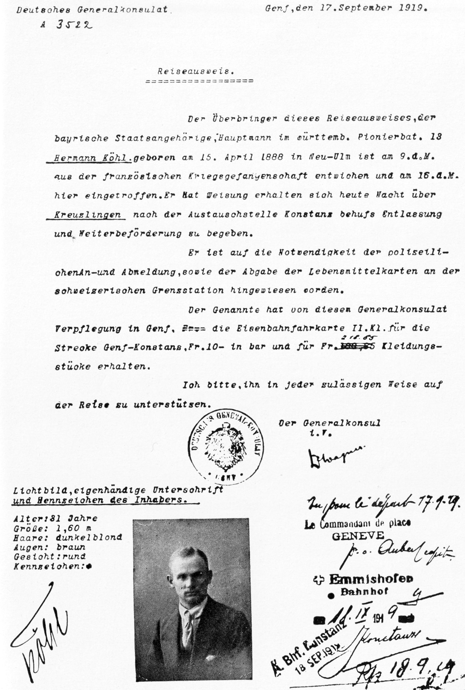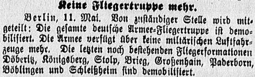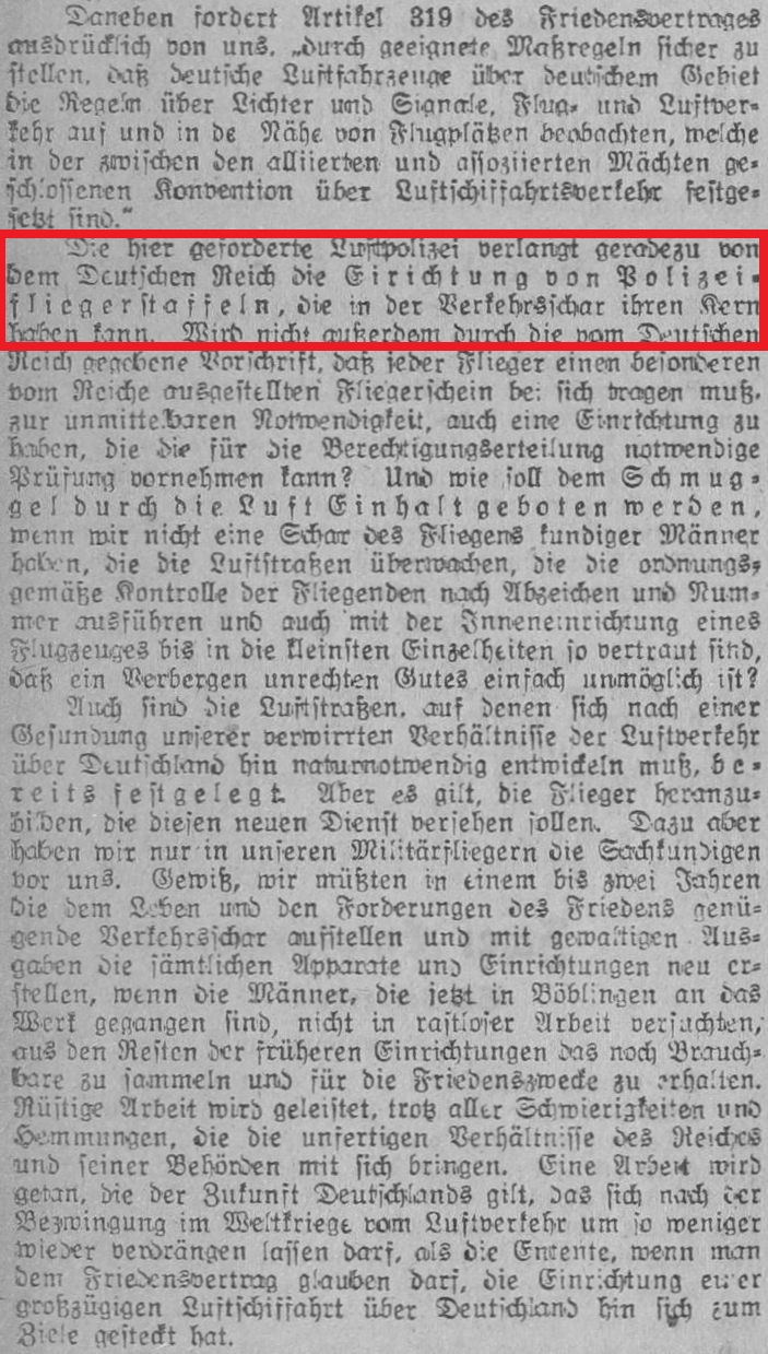 Da bei uns infolge des Friedensvertrages zunächst jede Fliegerei aufgelöst werden musste, so zog ich es in den Tagen des Mai 1920 vor, aus dem Dienst der Polizei-Flieger in den Dienst der Reichswehr überzutreten. Von Böblingen aus kam ich nach Ludwigsburg, wo ich lange Zeit die 7. Kompanie des dortigen Infanterie – Regiments als Kompanie-Chef führen durfte. Diese Zeit war im Vergleich zu den vorhergegangenen Jahren eine gewisse Ruhezeit.“