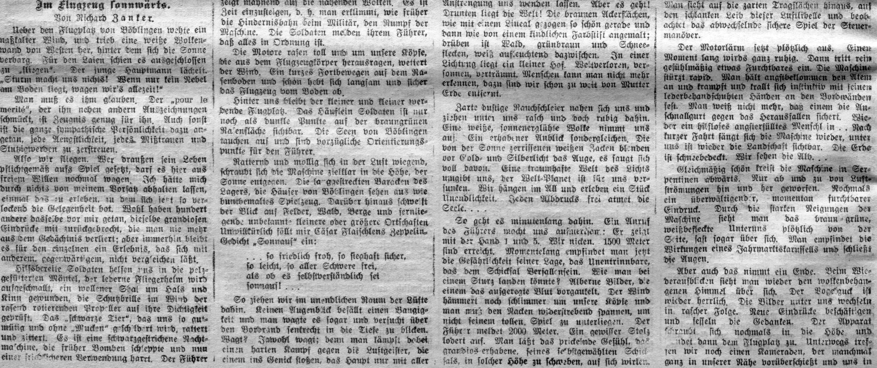 „Nach meiner geglückten Flucht aus der Gefangenschaft beschäftigte ich mich zunächst einmal in Böblingen wieder mit der Fliegerei. Dort bekam ich alle möglichen Typen von Flugzeugen in die Hand. Von diesen gefiel mir am besten der Fokker D 7, mit dem ich am liebsten halbe Stunden lang in Loopings in der Luft mich bewegte. In dieser Zeit hatte ich einmal einen kleinen Flugunfall.