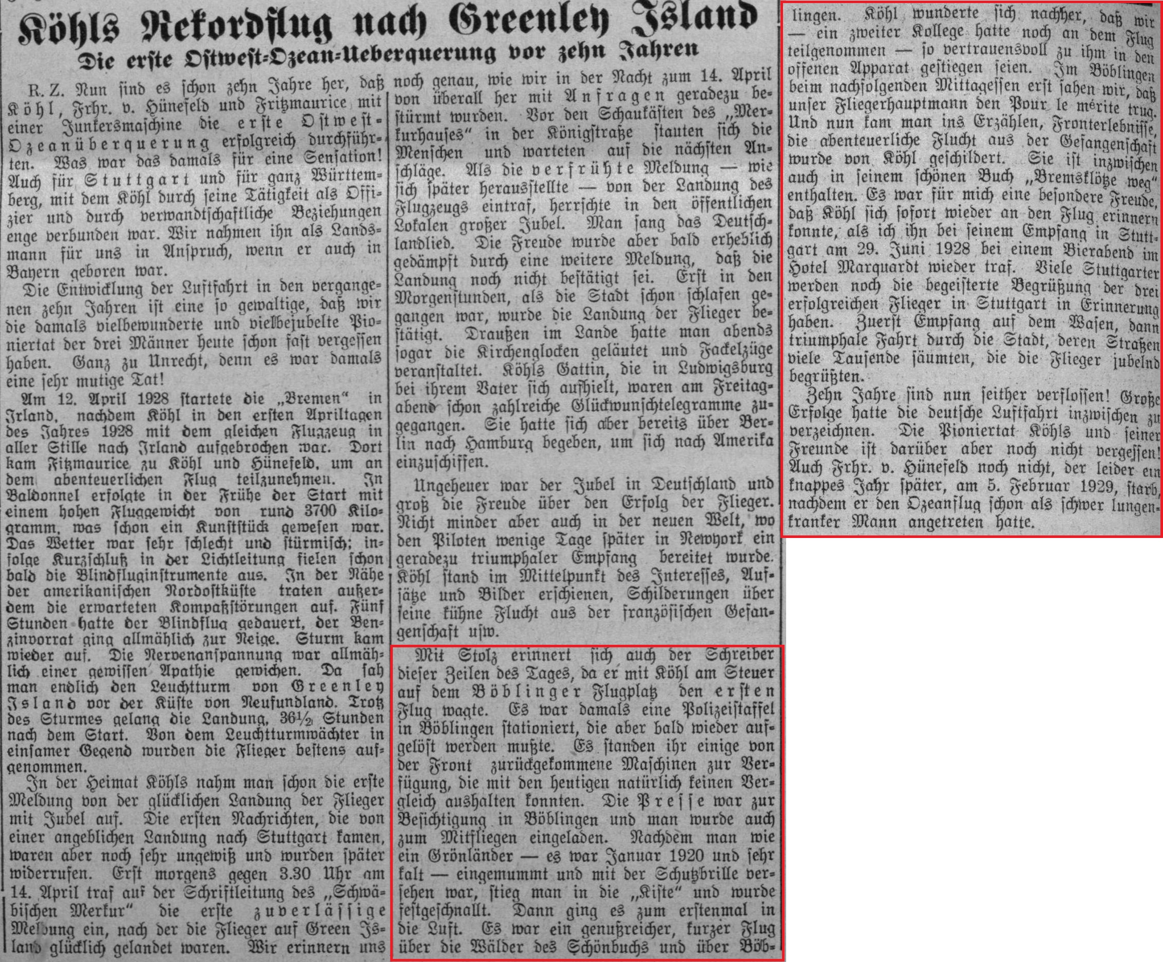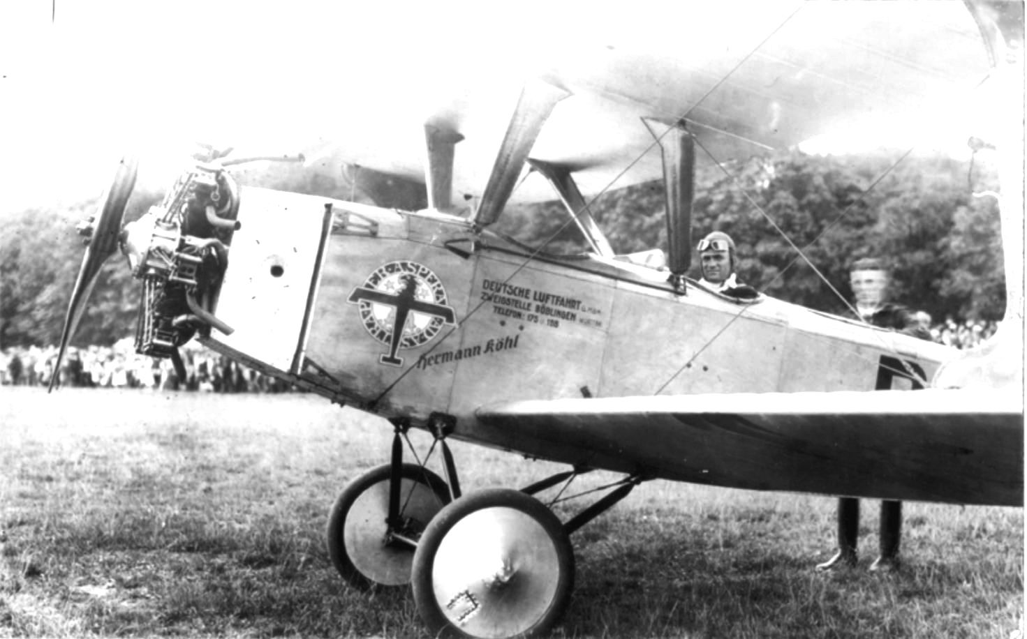 Die gleiche Zeit in Böblingen beschreibt Köhl in seinem Buch „Unserer Ozeanflug“: „Mein erster Abteilungsführer hatte die Flieger-Ersatzabteilung in Böblingen. Er lud mich ein, ihn bei meinem nächsten Urlaub zu besuchen. Ich sagte den Besuch unter der Bedingung zu, dass er mich während dieser Zeit bei der ihm unterstehenden Flieger-Abteilung schulen ließe. Auf die zusagende Antwort hin nahm ich sofort meinen schon längst fälligen Urlaub und fuhr nach Böblingen. Innerhalb von drei Tagen hatte ich in den Morgen- und Abendstunden ca. 40 Schulflüge hinter mir und machte anschließend daran meinen ersten Alleinflug, dessen Erfolg mich allerdings nicht sehr befriedigte. In den vorhergehenden Tagen hatte mein etwas ängstlicher und nervöser Fluglehrer mir eigentlich nie recht das Steuer überlassen. Nun war es doch ein recht bescheidenes Gefühl, so allein im Flugzeug zu sitzen und für alles, was nun geschah, selbst verantwortlich zu sein. Die Rettung sah ich darin, das Flugzeug auf starke Fahrt zu drücken, hatte dabei aber nicht gewusst, dass dadurch das Flugzeug schwer in die Kurve zu bekommen war. Meine erste Runde um den Flugplatz Böblingen bis zur ersten Landung ging deshalb in ziemlich scharfer Fahrt und scharfer Kurve vor sich. Bei der Landung kam ich auch nicht an den Punkt, an den ich kommen wollte. Ich fing zu hoch ab und da ich wusste, dass es in solchen Fällen notwendig ist, noch etwas Gas zu geben, gab ich nochmals Gas, allerdings etwa zwei bis drei Sekunden zu spät, sodass der Propeller nach Einknicken des Fahrgestells die Grasnarbe ordentlich beschädigte. Damit hatte ich meinen ersten Alleinflug hinter mir; wenn auch nicht gerade ganz glatt gelandet, so war doch die Beschädigung unerheblich. Am nächsten Morgen um fünf Uhr ging es dann wesentlich besser. Ich erledigte an diesem Tage noch meine Pilotenprüfung, die darin bestand, dass in einer Höhe von 500 Metern drei Achten geflogen werden mussten. Die Landungen waren von da ab alle recht gut.“