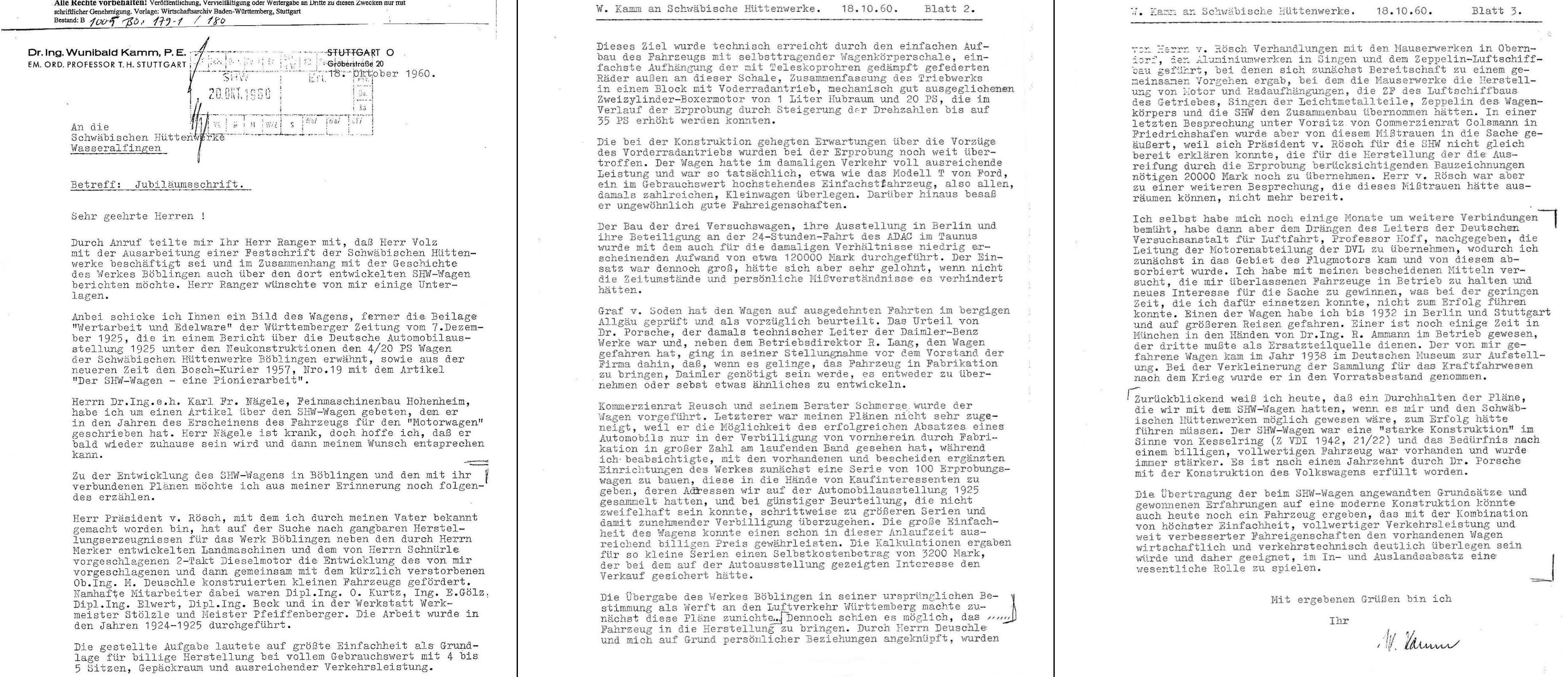 Ferdinand Porsche, damals Chefkonstrukteur bei Daimler-Benz, testete den SHW-Wagen und war sehr angetan. Er empfahl seinem Vorstand, SHW zu kaufen, wenn es zu einem produktionsreifen Wagen käme. Interessant ist in diesem Zusammenhang, daß Kamm, bevor er zu den Schwäbischen Hüttenwerken wechselte, unter Paul Daimler und Ferdinand Porsche bei Daimler arbeitete.
