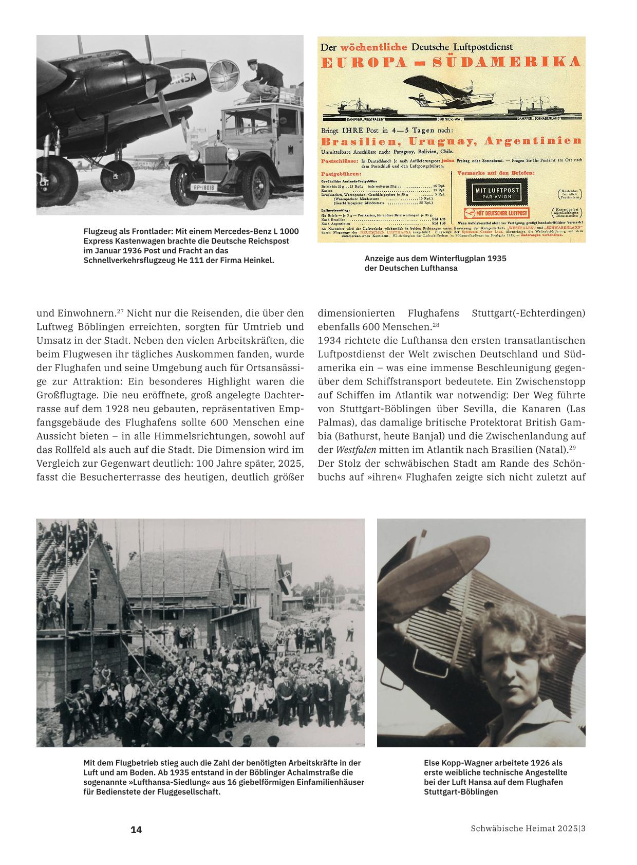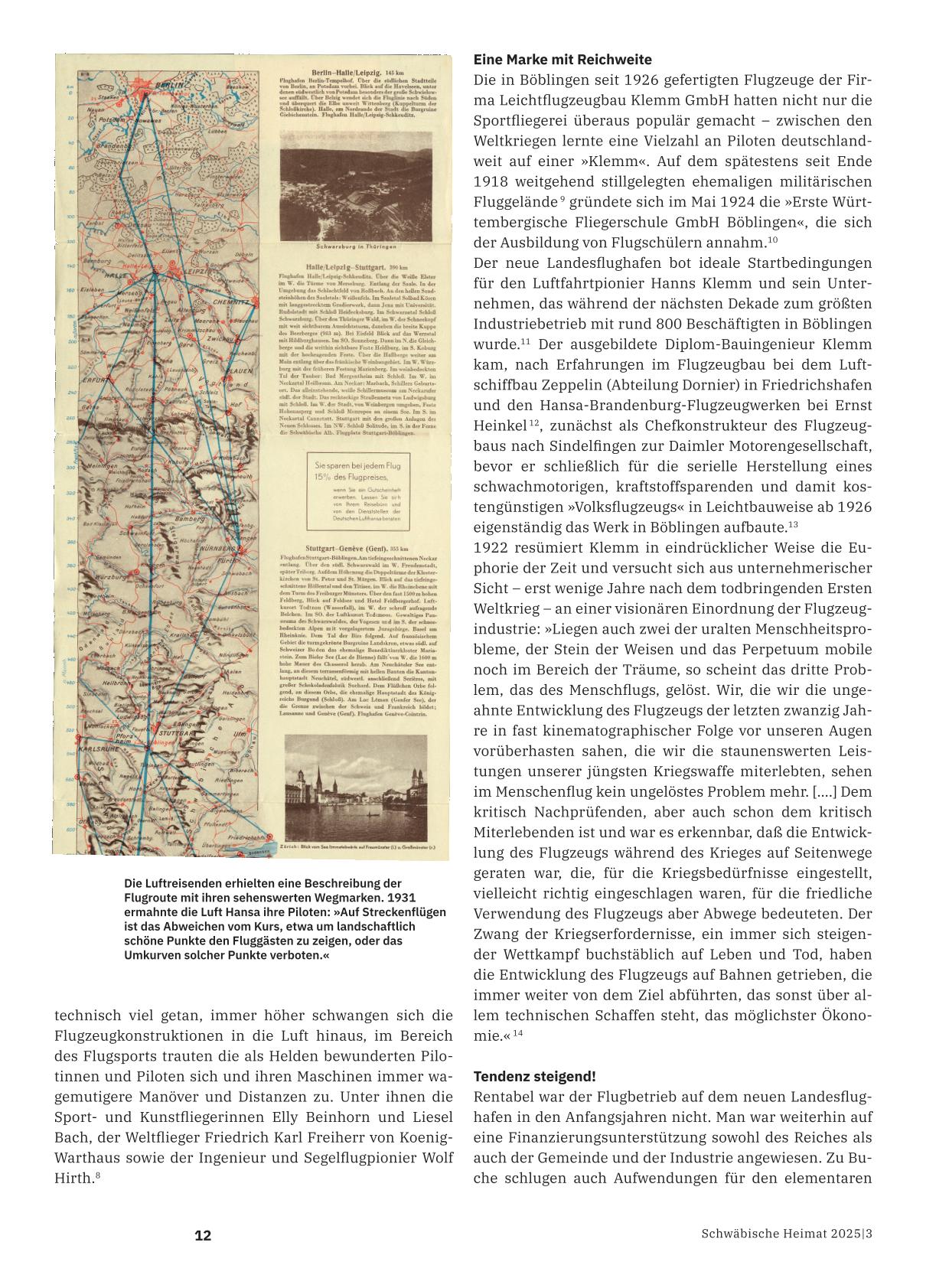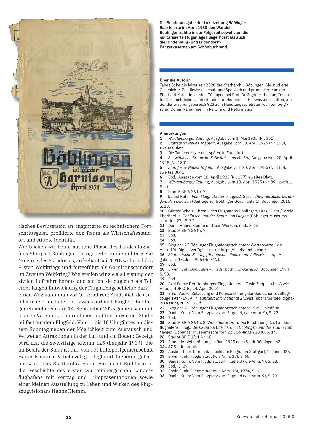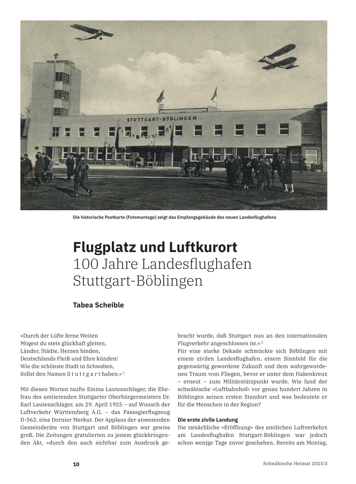 … die Zeitschrift des Schwäbischen Heimatbundes, ist eines der renommiertesten Publikationen über die landesgeschichtliche Forschung. In der Ausgabe 2025/3 verfasste Frau Dr. Tabea Scheible, Stadtarchivarin von Böblingen, zum 100-jährigen Erstflug vom Flughafen Stuttgart-Böblingen einen schönen Beitrag.