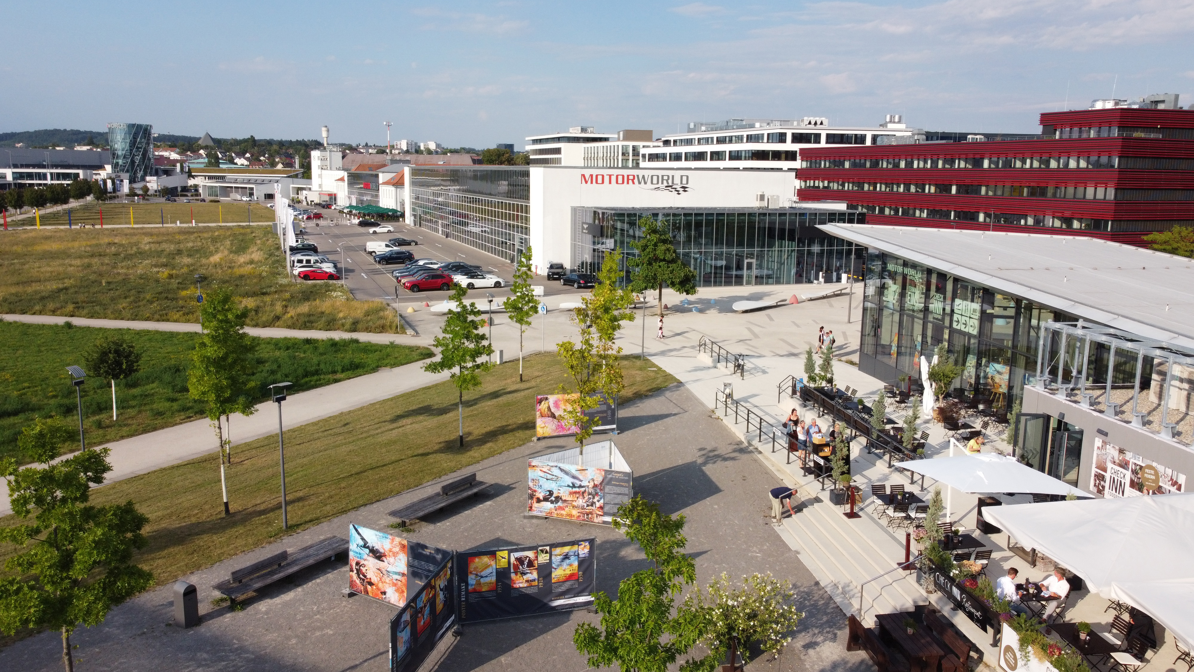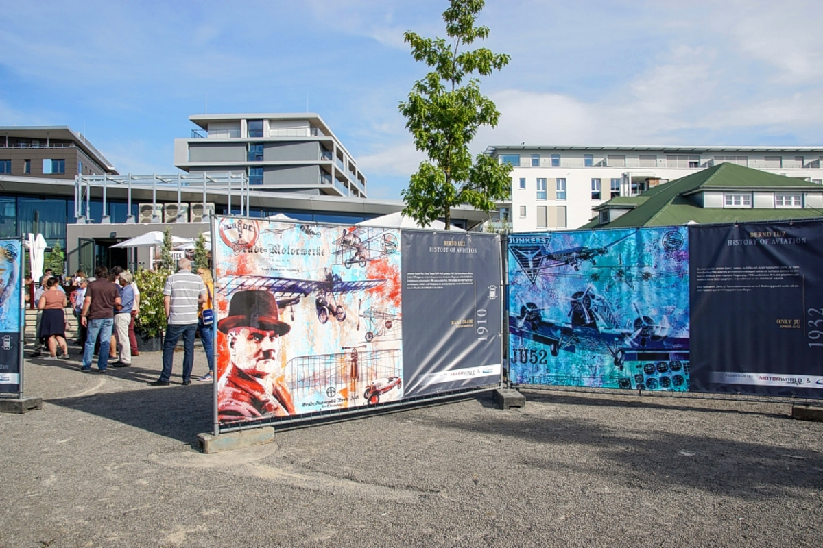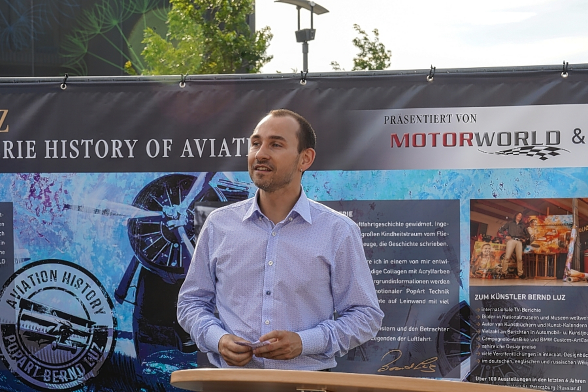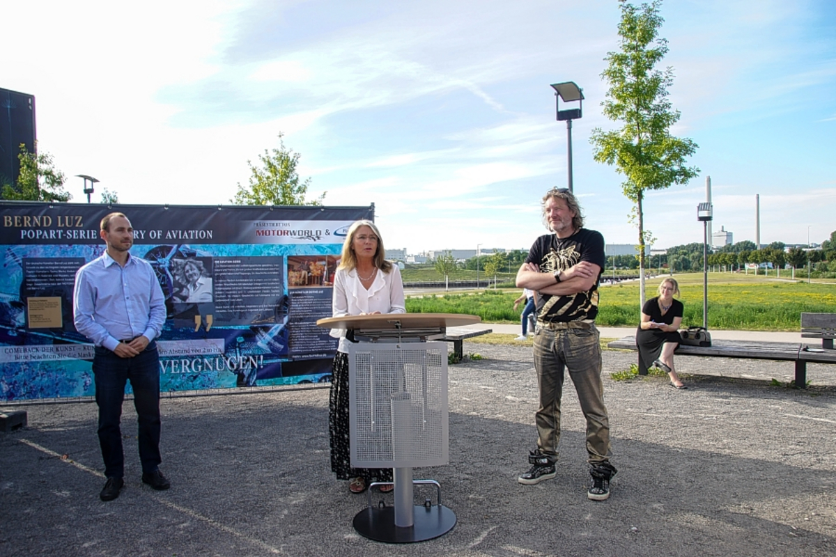 Die Eröffnung der Ausstellung mit Stefan Belz (OB Böblingen) Susanne Kirschbaum (Centermanagerin Motorworld und Bernd Luz (Künstler) (Frank Dettenmeyer)