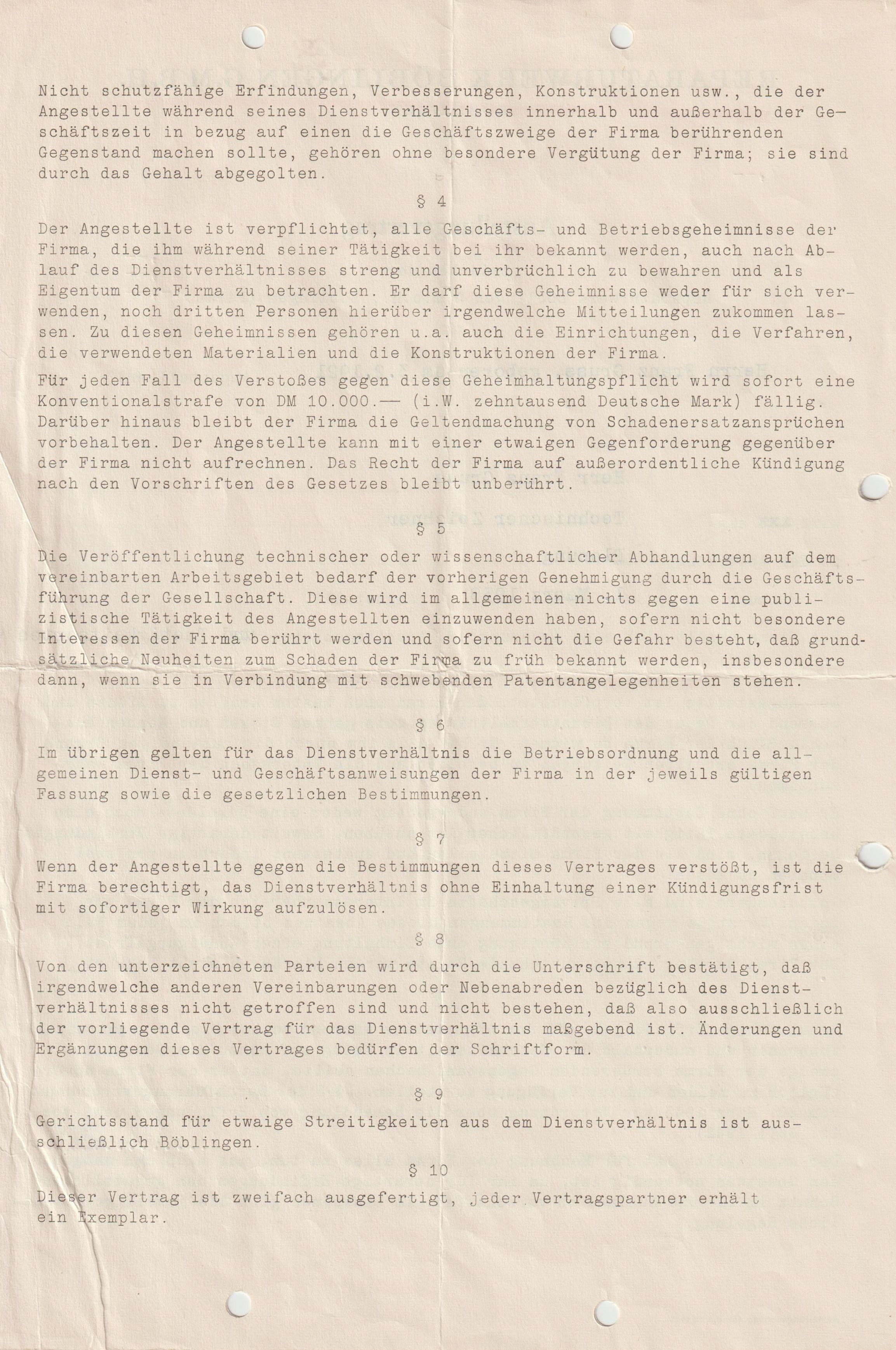 - Vertreter vieler deutscher Firmen haben unseren Betrieb besichtigt, z.B.: Ford-Werke Koeln; BMW; Kessler & Co; Krauss-Maffai; Daimler-Benz; Henschel-Kassel;etc. Weitere Besichtigungen erfolgen in der nächsten Zeit. Viele dieser Vertreter werden den Betrieb ein zweites Mal noch eingehender besichtigen. (Arbeiten Sie so, dass Sie einen guten Eindruck machen!) Die meisten der Besucher werden daran interessiert sein, den Vertrag abzuschließen. In der ersten Februar-Woche werden die Angebote in Mannheim vorliegen. Wir erwarten, dass die neue Vertragsfirma Ende Februar durch Mannheim bekanntgegeben wird. Wir erwarten ferner, dass die neue Firma mit den Werksangehörigen des BOMD Anfang Maerz ihre Arbeitsvertraege mit Wirkung vom 1.April abschließen wird.