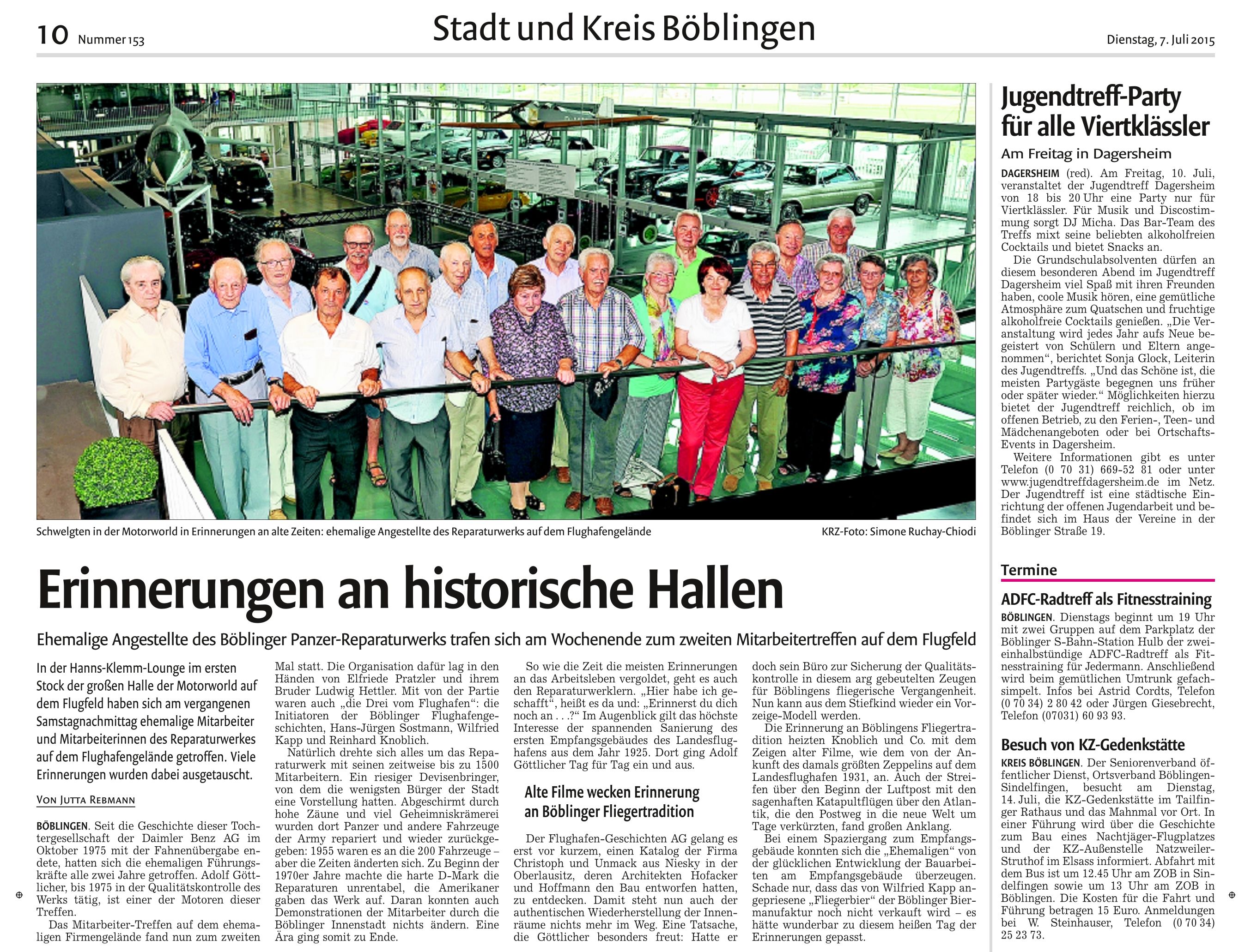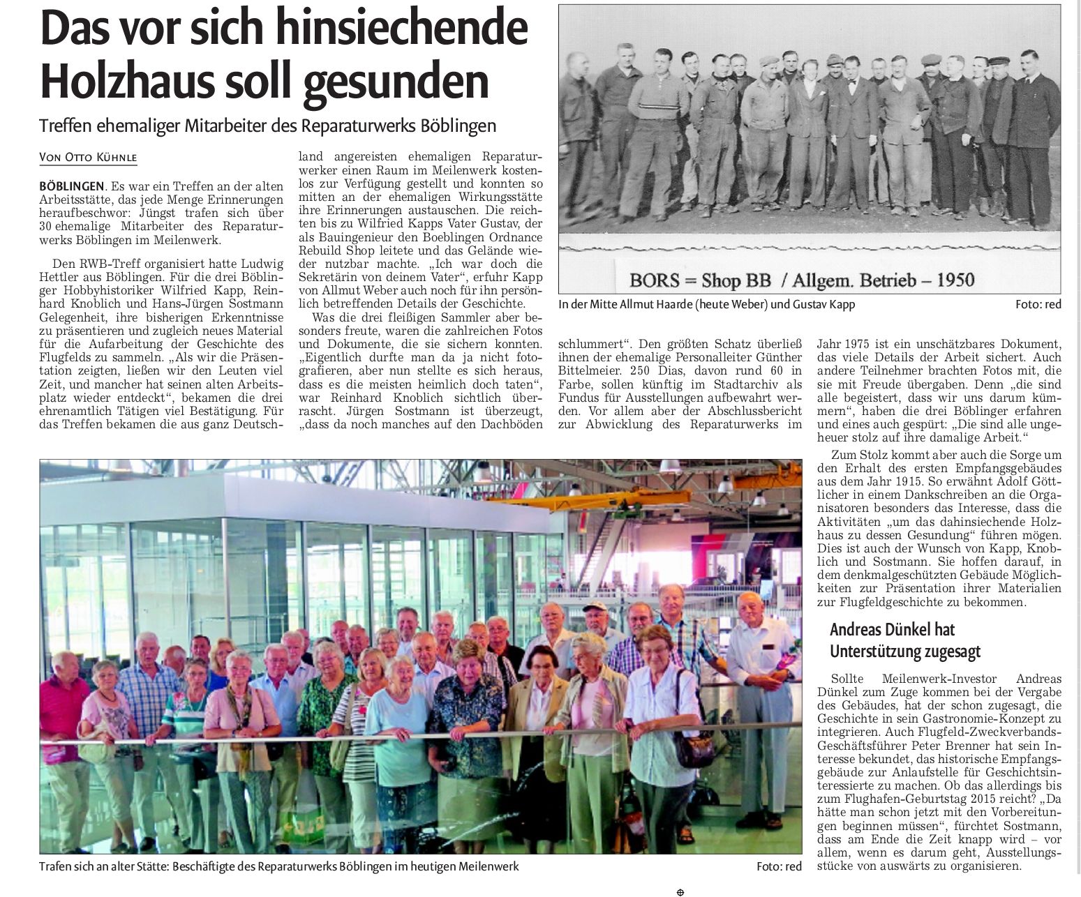 Neue Erkennnisse führten am 04. Juli 2015 zu einem weiteren Treffen von etwa 20 ehemaligen Mitarbeitern. Nach einer Rückschau auf die vergangenen Jahre wurden zwei Filme aus der Böblinger Flughafenzeit gezeigt. Anschließend gab es wieder das obligatorische Gruppenfoto. Die Kreiszeitung Böblinger Bote und die Sindelfinger Zeitunmg berichteten darüber.